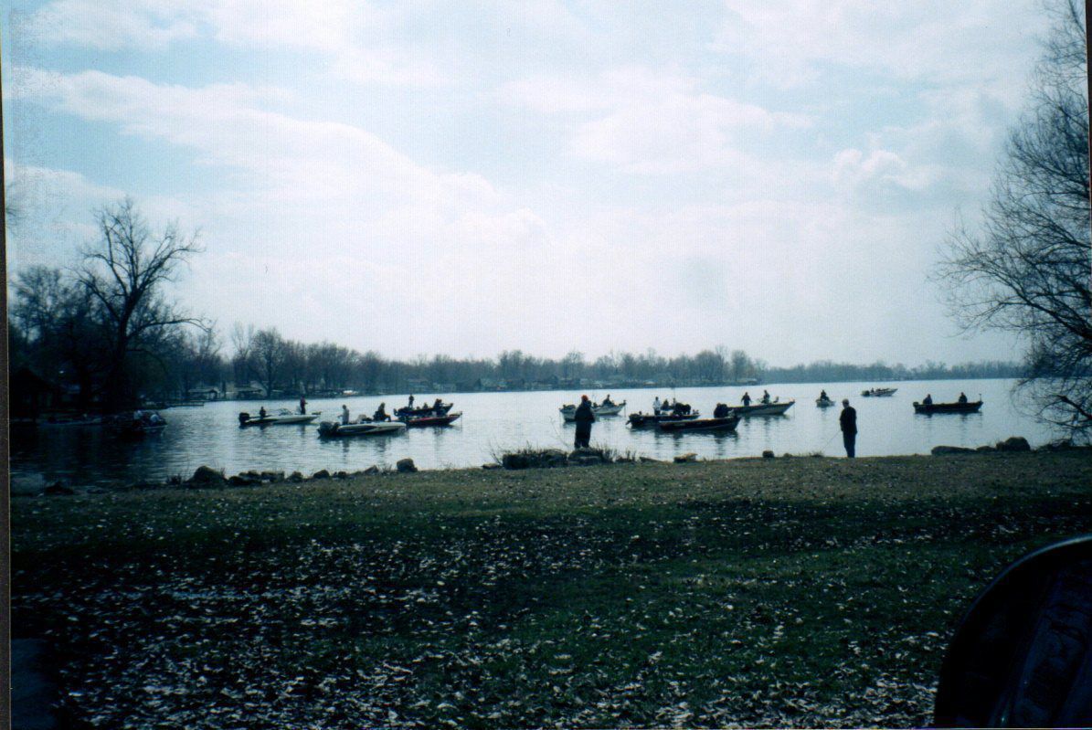 Numerous fishing vessels crowd a particular part of Indian Lake State Park. Some fisherman join in by casting a line from the lakeshore.