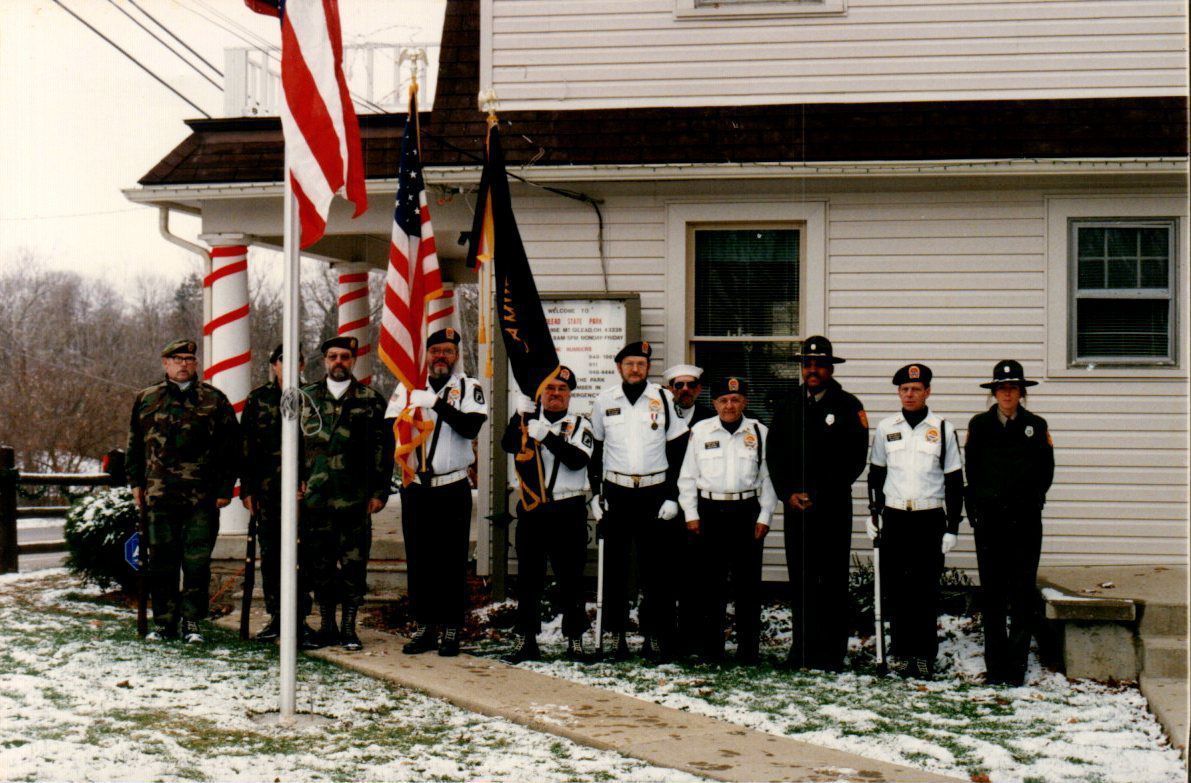 Military veterans and park rangers provide an honor guard for an flag pole dedication at Mt. Gilead State Park in the winter of 1996.