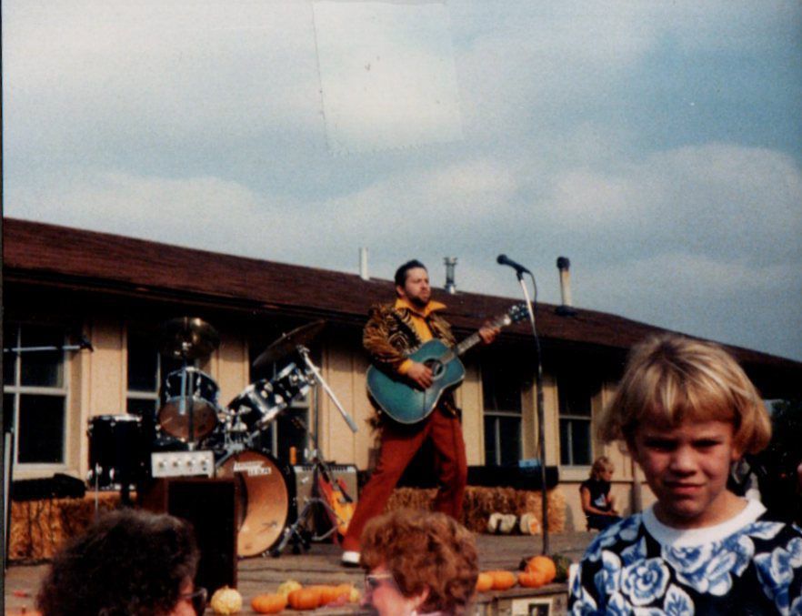 A loudly dressed guitarist with a teal guitar performs to a crowd at Indian Lake State Park. A young girl is facing the camera, although it is unclear if she is posing for a photo or was walking by and inadvertently caught in the picture.Cataloged By