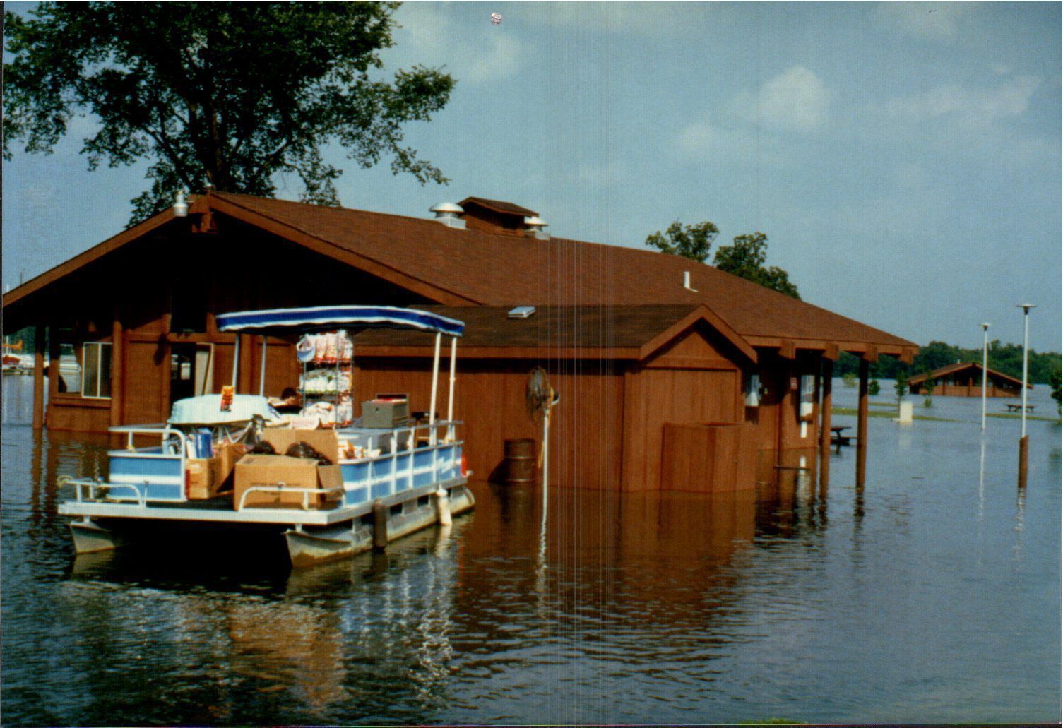 Flood waters from Delaware Lake have inundated the park and reached park buildings. Someone has navigated their pontoon boat over to a park building.