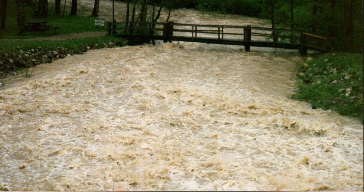 Sam's Creek-the waterway feeding Mount Gilead Lake-is swollen from recent rains in this photograph taken in 1996.
