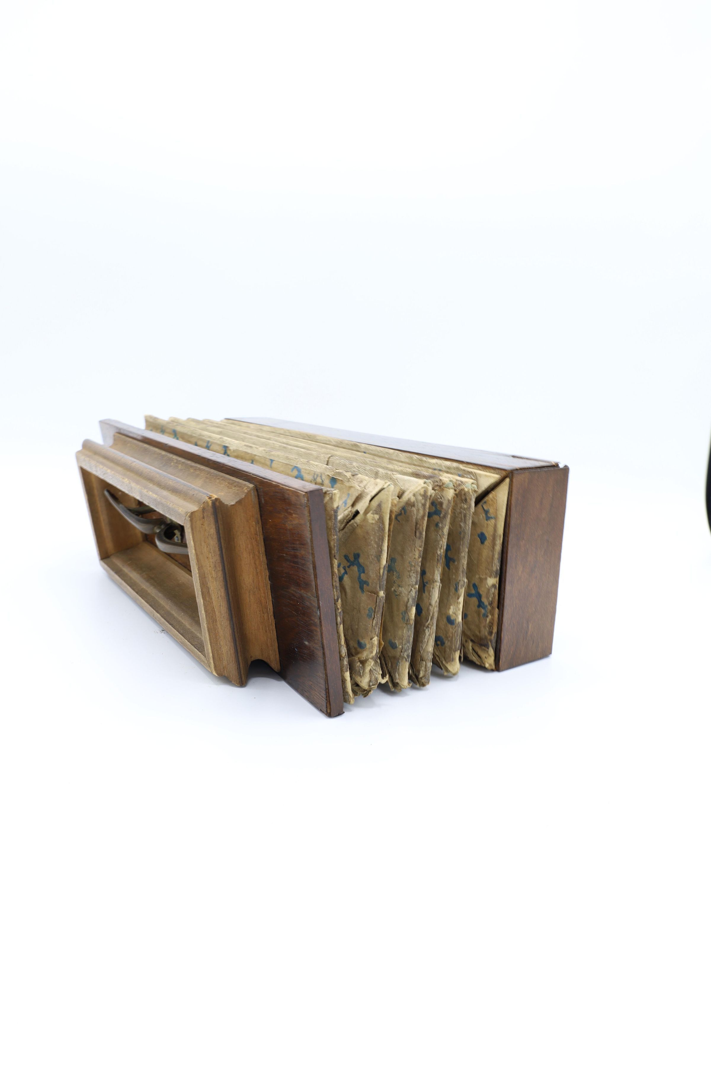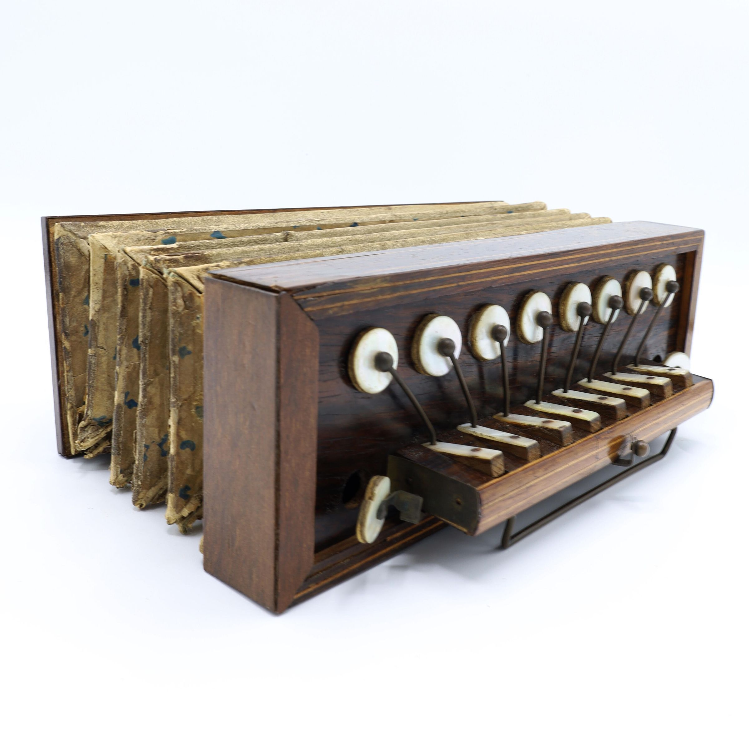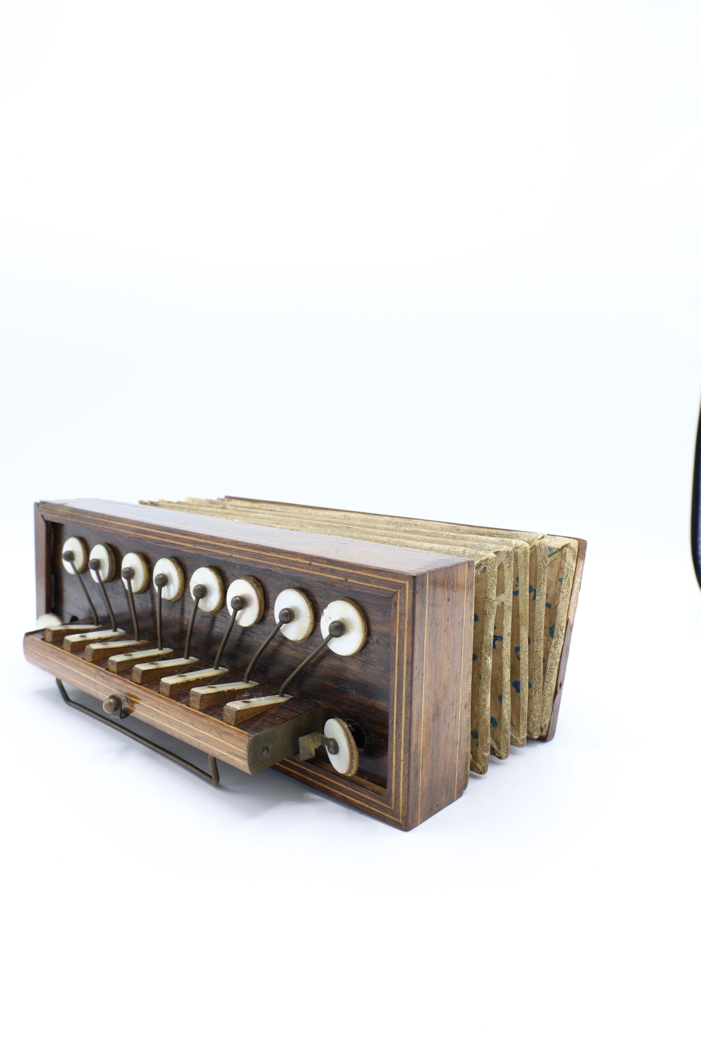 This flutina has wooden end panels, and bellows with a blue dotted pattern. The right-hand end has eight mother-of-pearl keys and a brass bar for supporting the hand.Location