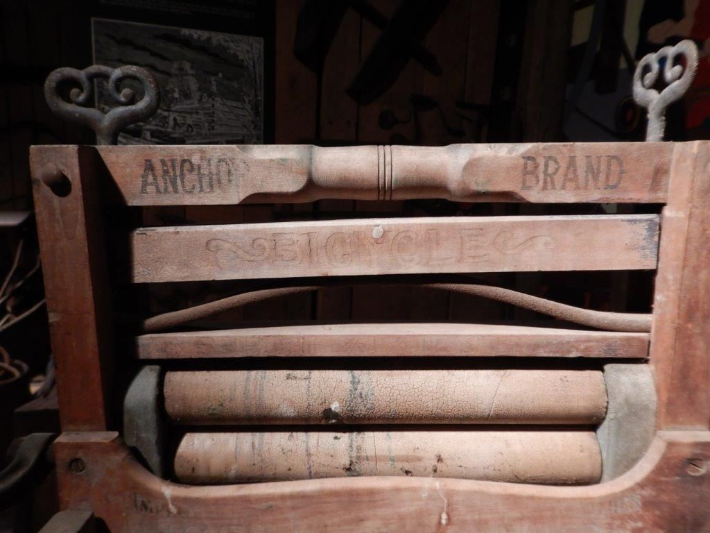 Manufactured by the Lovell Manufacturing Company during the 1910s, this Anchor wooden bench mangle has two fold down sides. Today, many people think a machine like this was used to wring water from newly washed clothing and household materials but it actually had an additional use. According to the Sears and Roebuck 1897 catalog, a mangle would reduce regular ironing to one sixth of the time it would take using a traditional heated sad iron. One drawback to using a mangle was that it could chip or break buttons on clothing so sometimes fabric or removable buttons were used instead. Sheets, blankets, curtains, and towels could all fit through a mangle when the space between the rollers was adjusted.