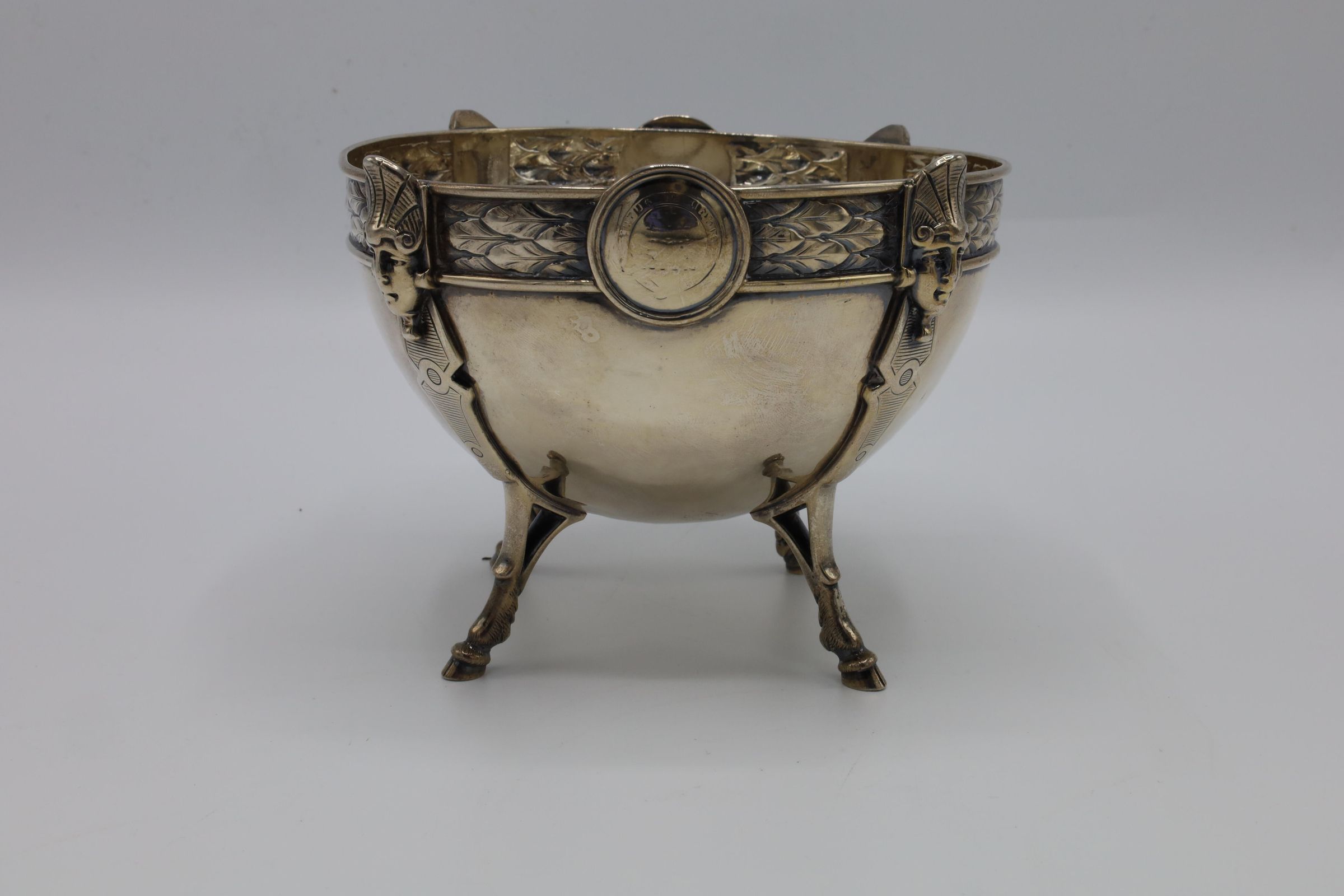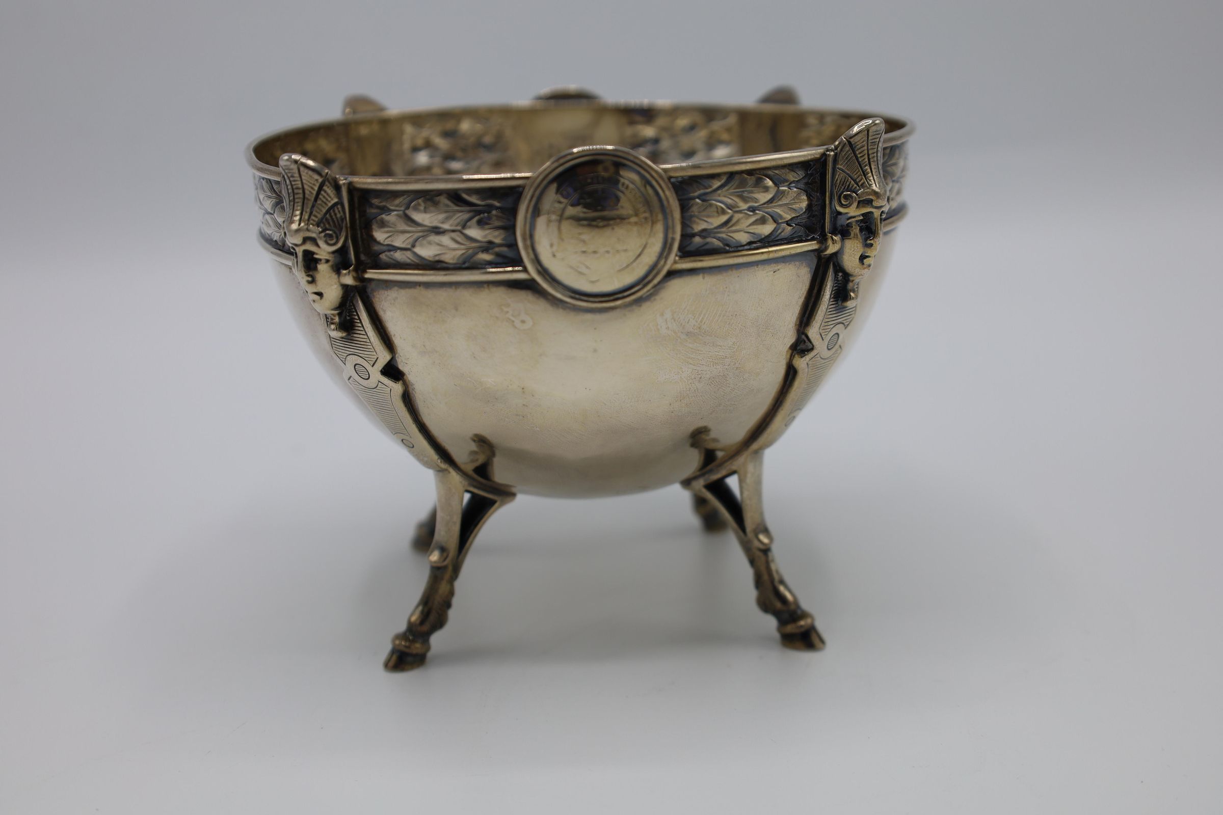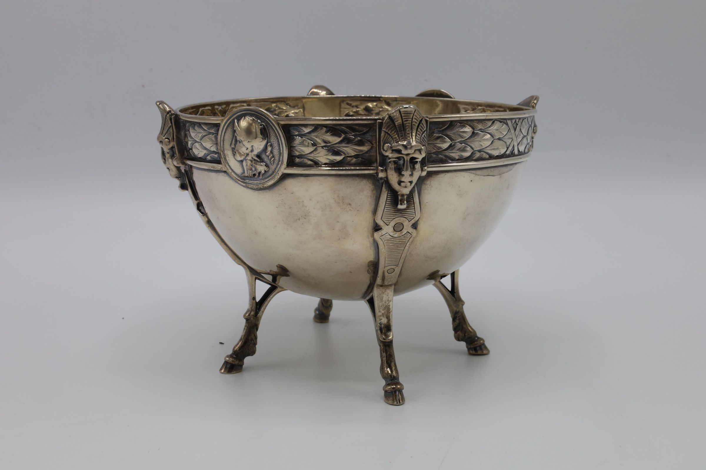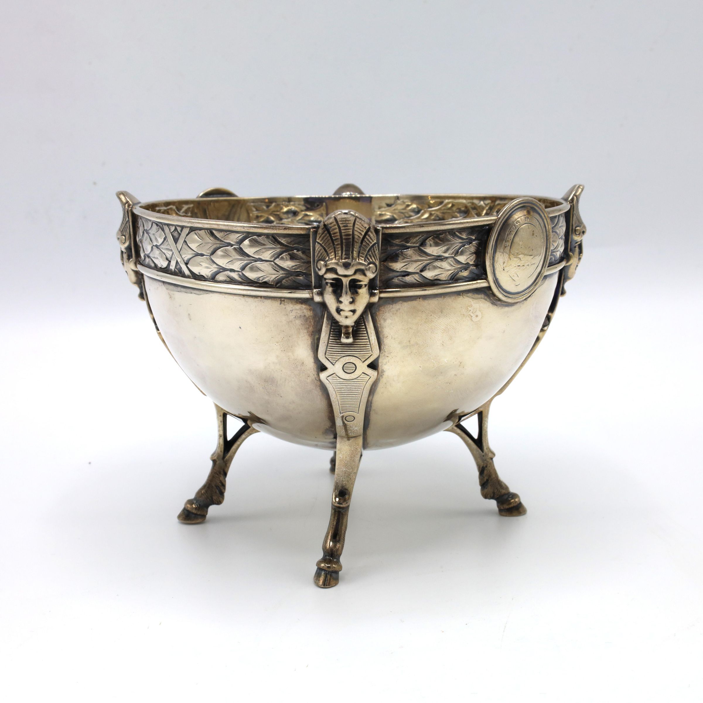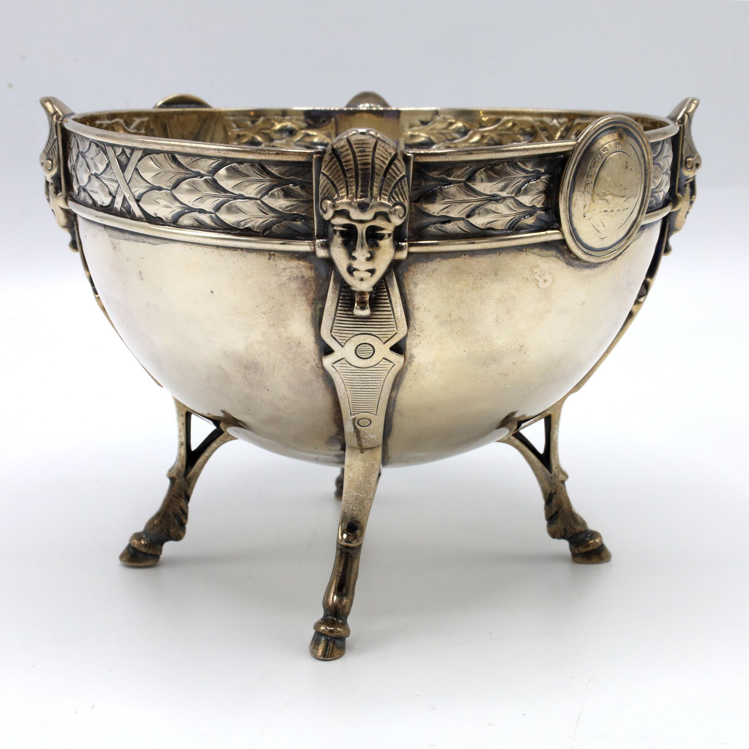 This bowl is an example of mid-nineteenth-century sterling silver in the Egyptian revival style. This is a footed (hooved) bowl manufactured by Ball, Black, & Co. of New York City. The design is attributed to Johann Rudolph Wendt, also of New York City. This small bowl incorporated Egyptian motifs into a bold, classic form. There is a layered feather motif on the rim. The rim of the bowl is further accented with Wendt's signature medallions, two profiles based on the traditions of ancient Greece and Rome.Context