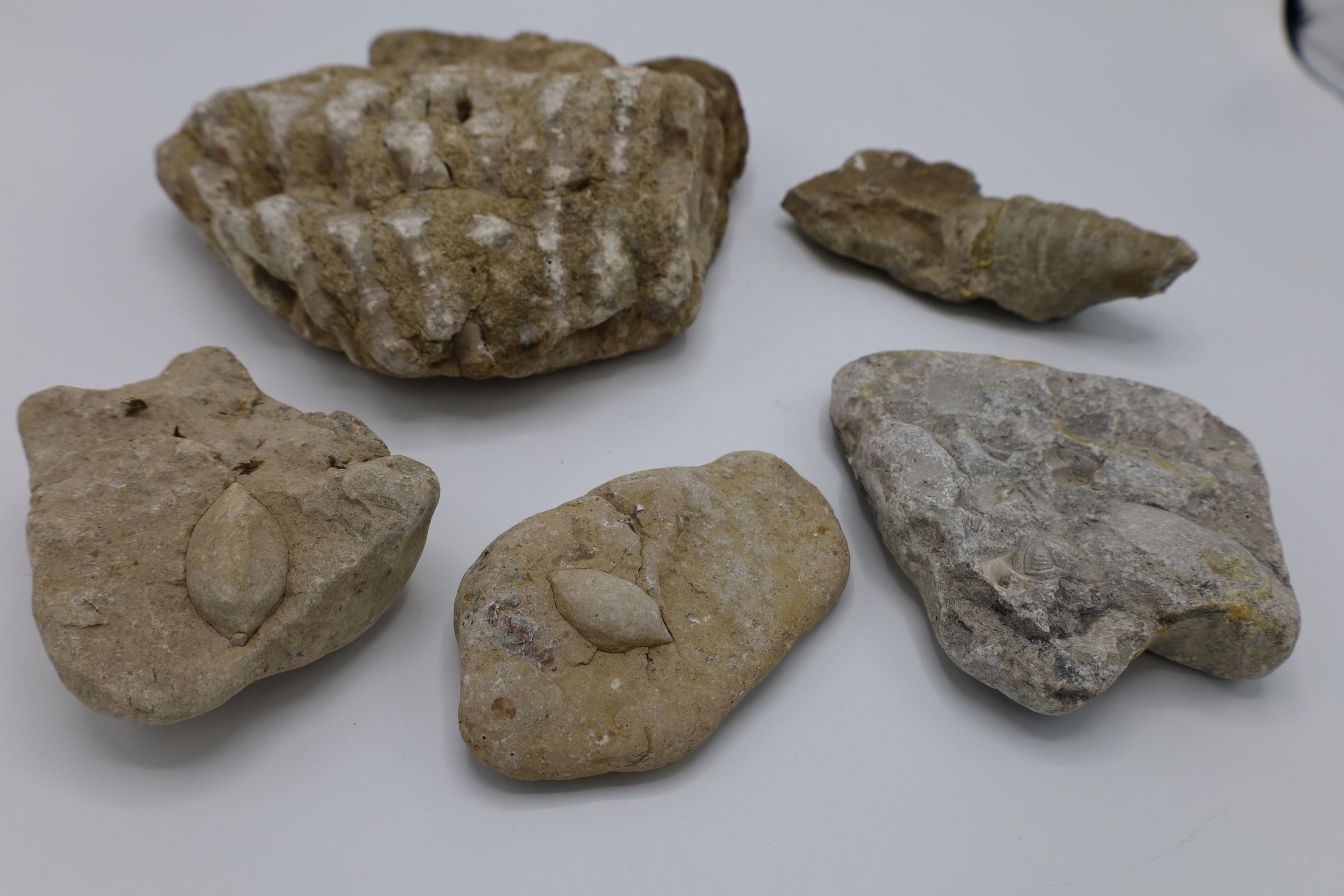 These fossils of the Columbus limestone on Kelleys Island and are on display in the main office on Kelleys Island State Park. These fossils, beginning with the top slightly left fossil, have been identified as a Colonial rugose “finger” coral eridaphyllum, a solitary rugose “horn” coral, a fossiliferous rock containing a trilobite among other organisms, and two bivalve fossilsContext