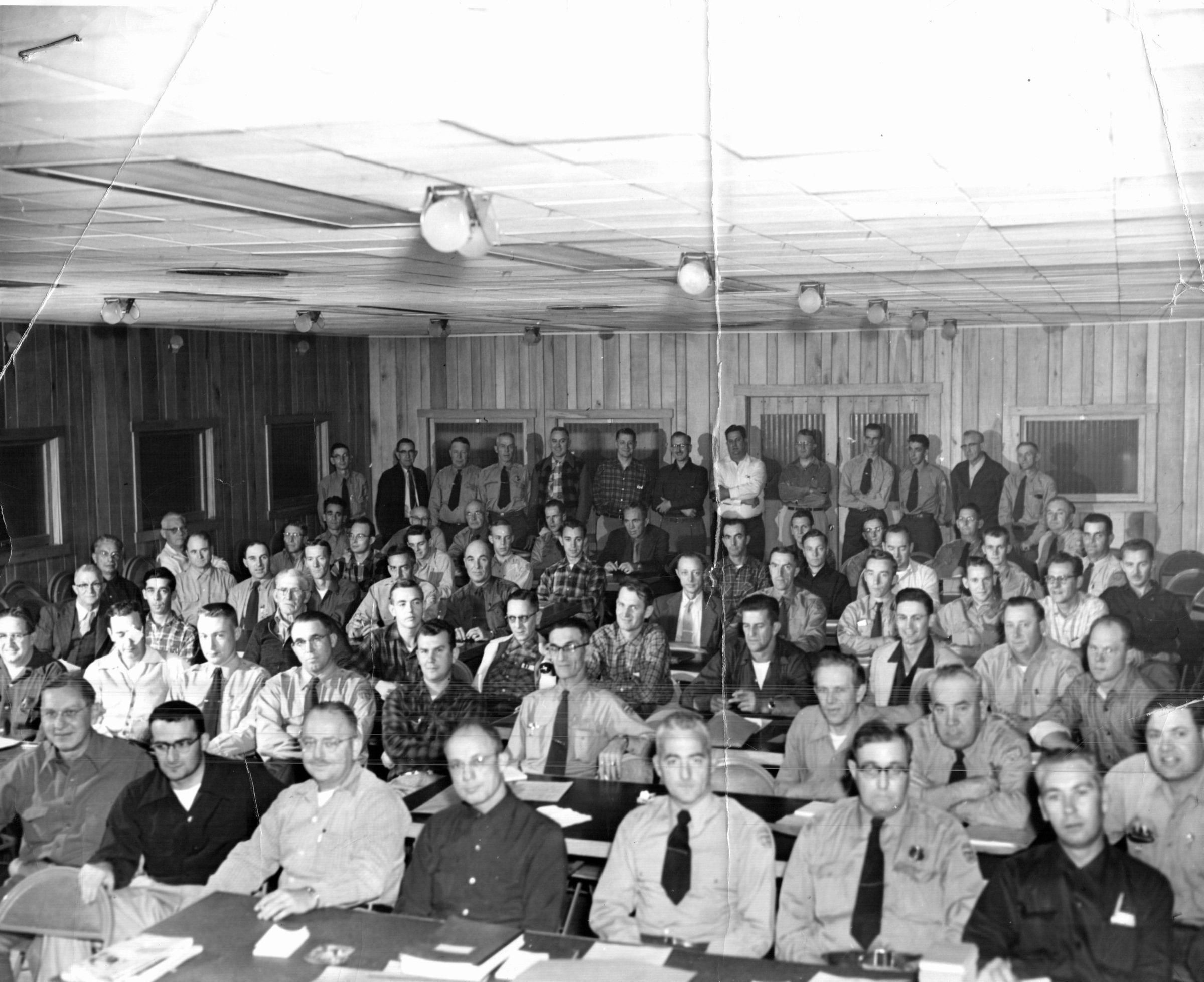 Park managers from throughout the state of Ohio gather at the Fourth Annual Park Managers Training School. This program began in 1951 at Lake Hope State Park and was intended to promote efficiency and consistency in park management practices. This photograph comes from the conference held at Lake Hope State Park in 1954.