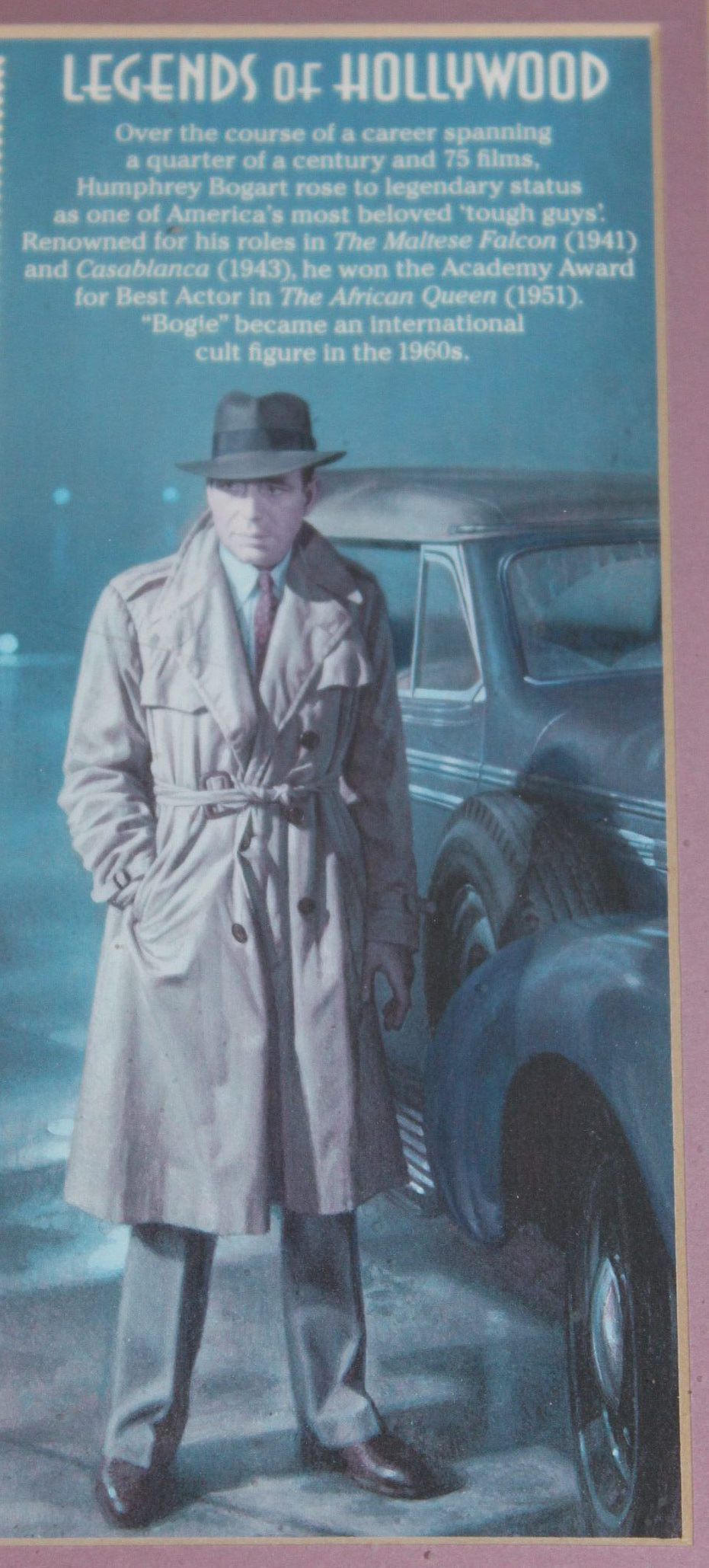 The United States Postal Service printed the Legends of Hollywood stamps series beginning in 1995. Twenty-one sets were released between 1995 and 2016. Humphrey Bogart was featured in 1997. He is depicted by artist Michael J. Deas. The stamp shows Bogart as he was represented in publicity photos for The Big Sleep, while the image on the sidebar come from his iconic role in Casablanca.Cataloged By
