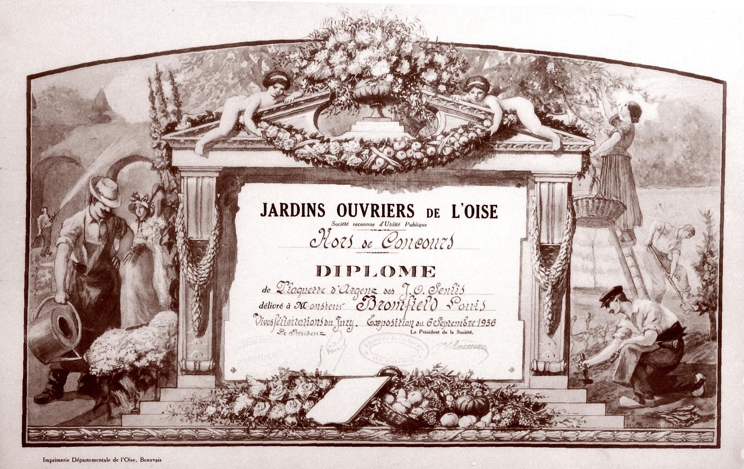 Gaston Pierre Galey, a French painter, was born in Toulouse, France in 1880. He designed this French gardening certificate awarded to Louis Bromfield in 1936. Galey died at Collonge-Saleve in 1959.