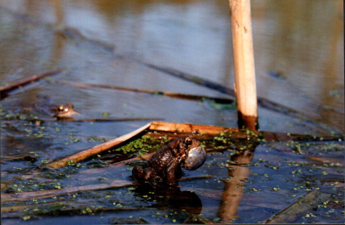 A frog (what appears to be an Eastern American Toad) chirps their mating call in the water at Mt. Gilead State Park.