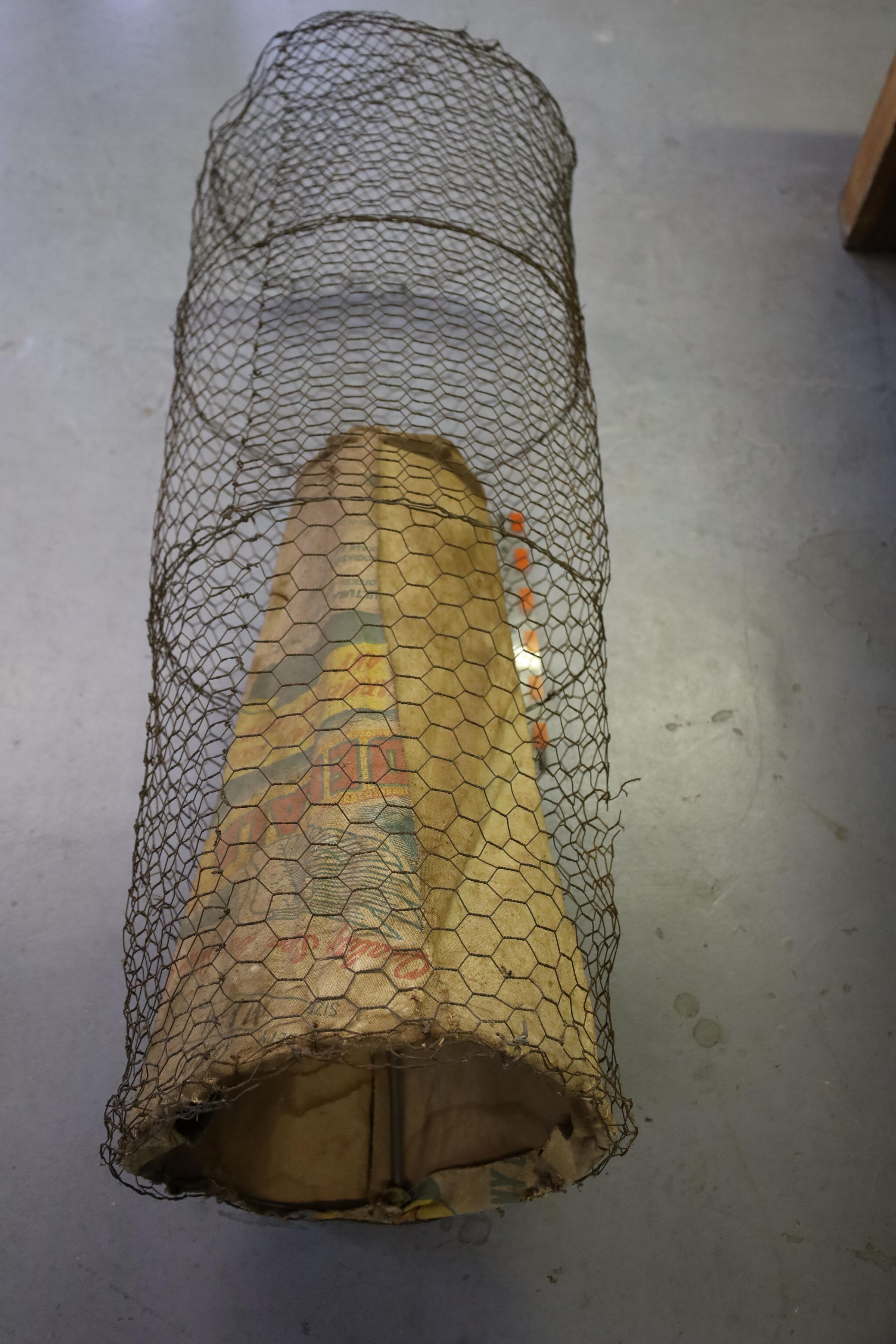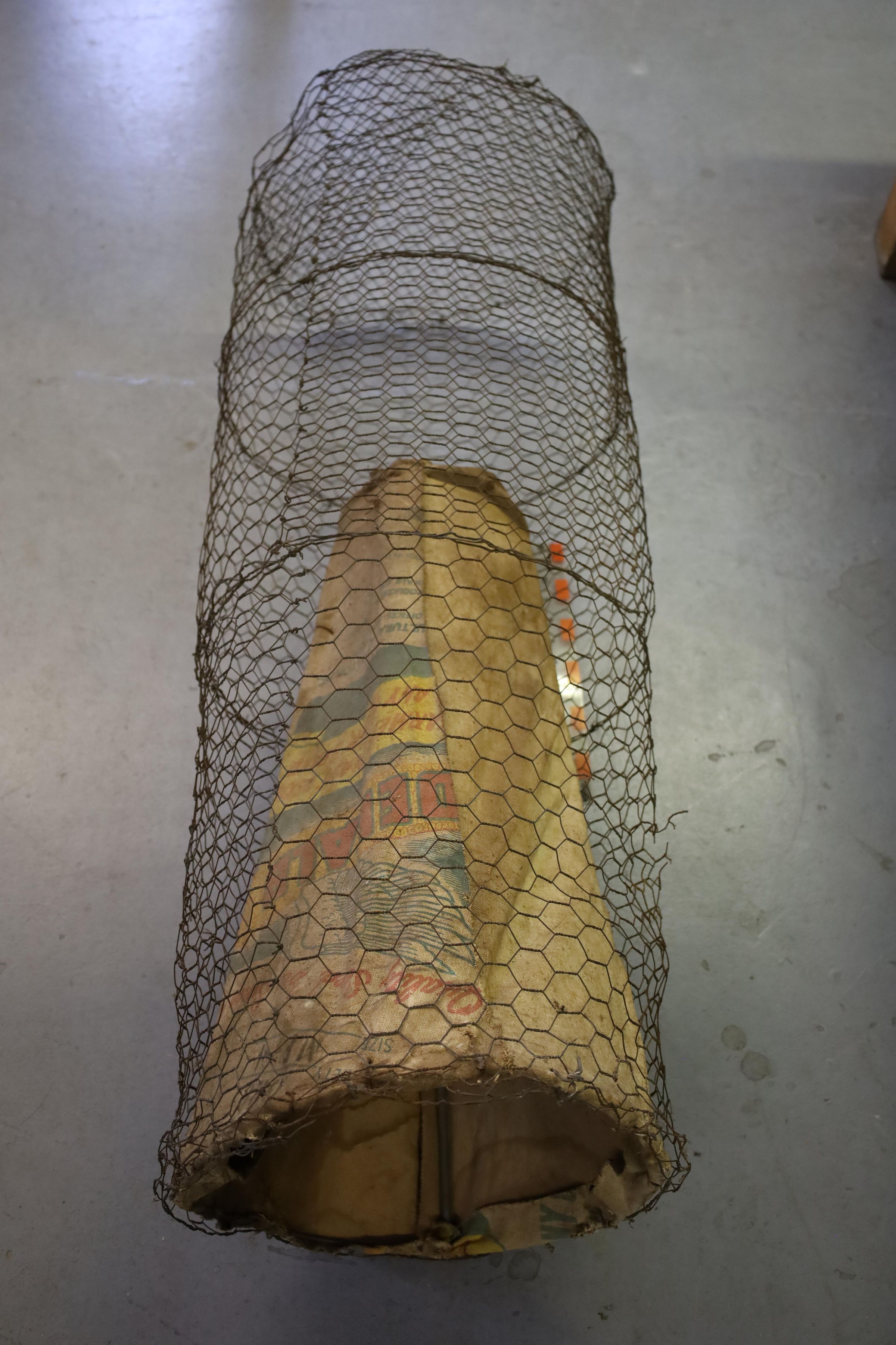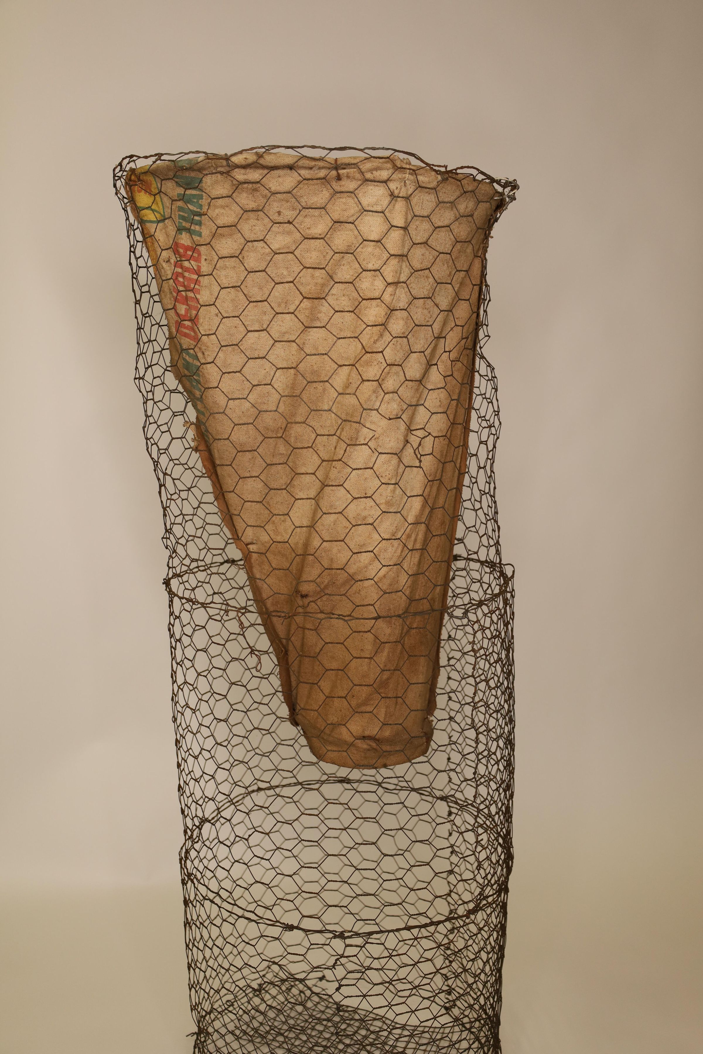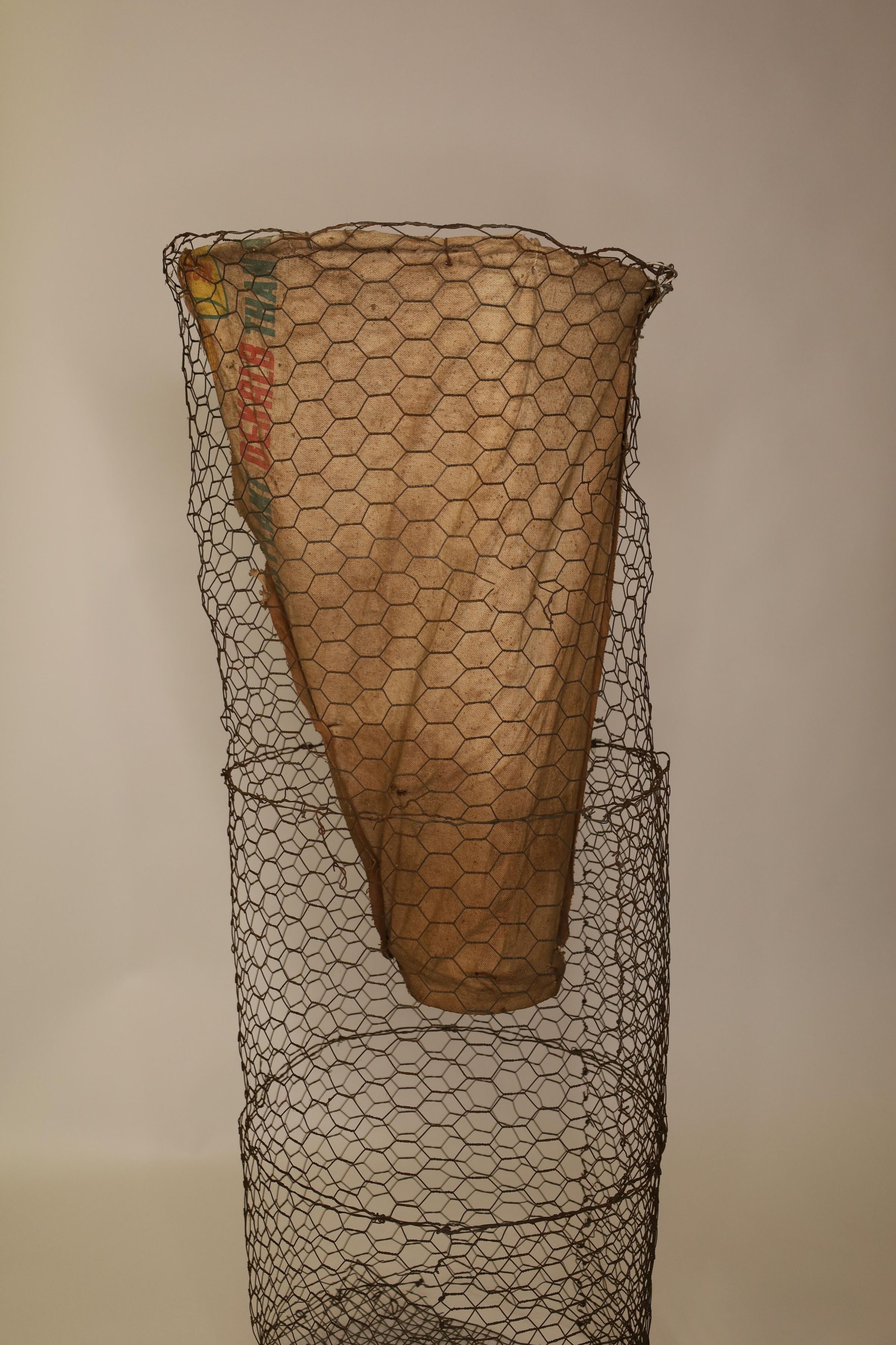 This homemade funnel fish trap has a body constructed of chicken wire and a faded Dekalb grain sack to act as a funnel.Use