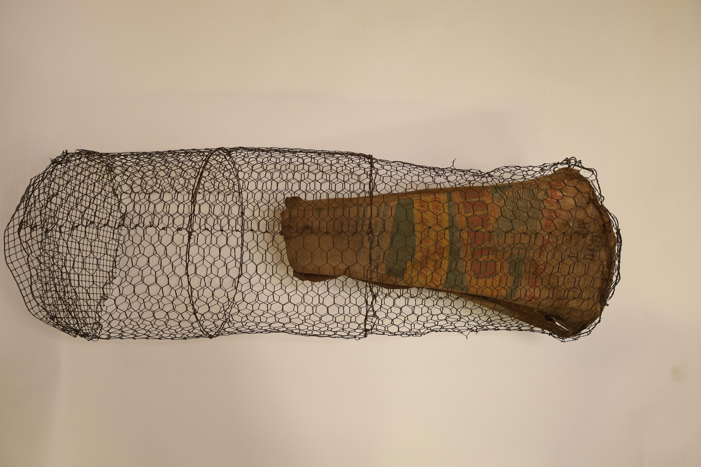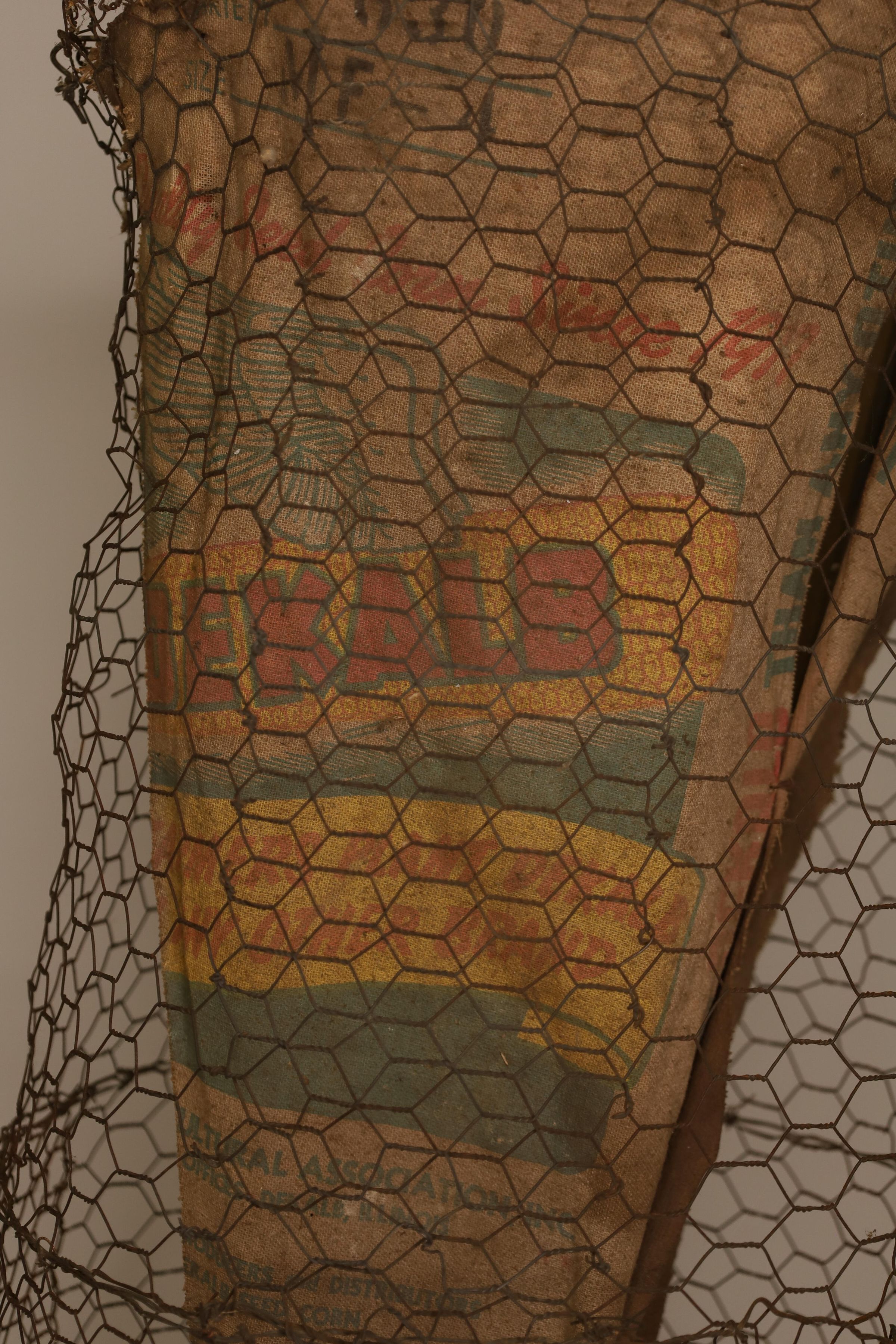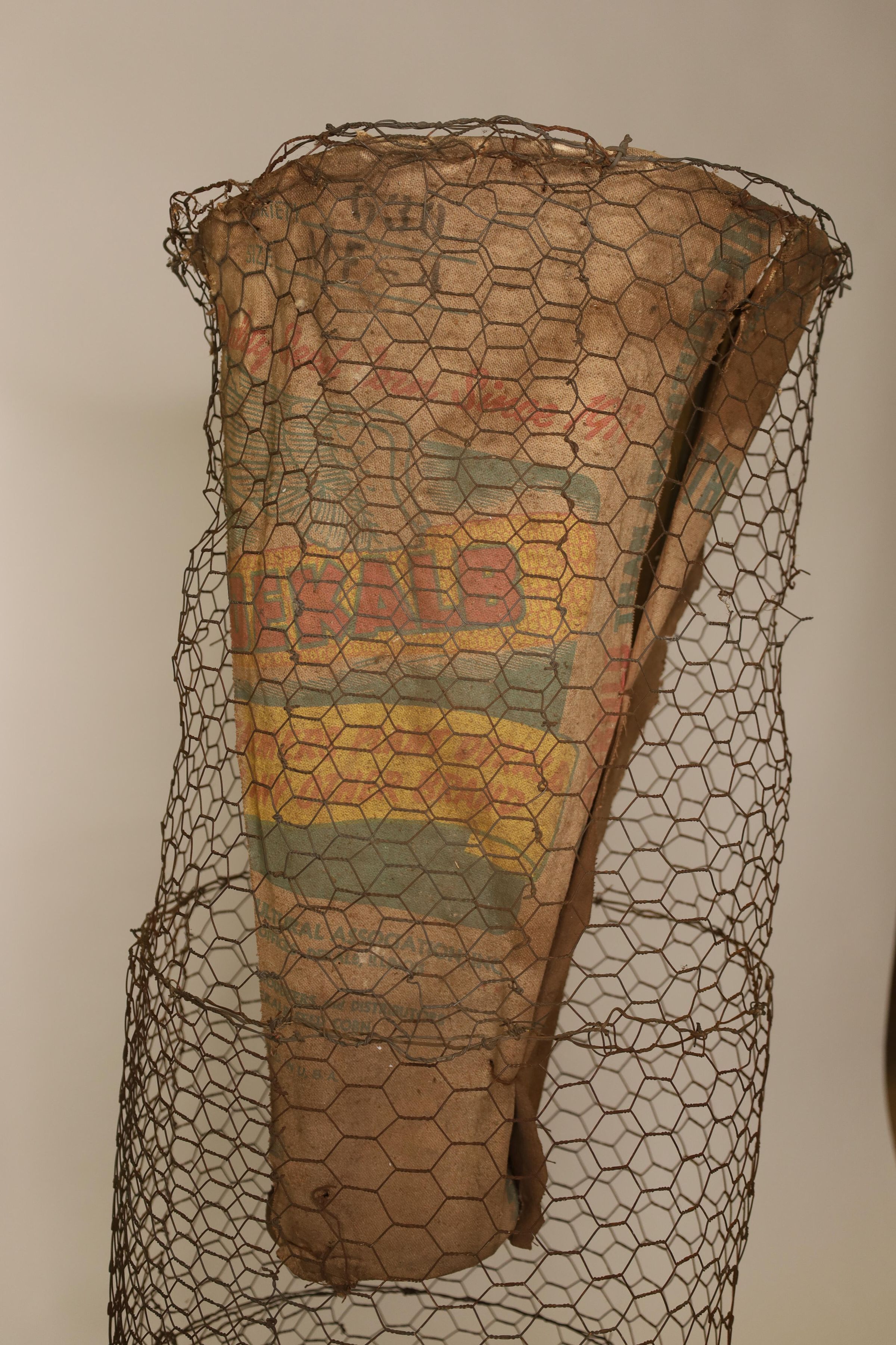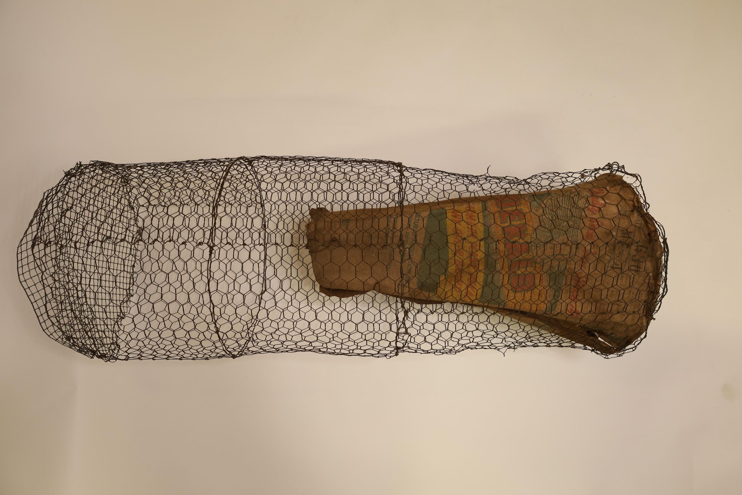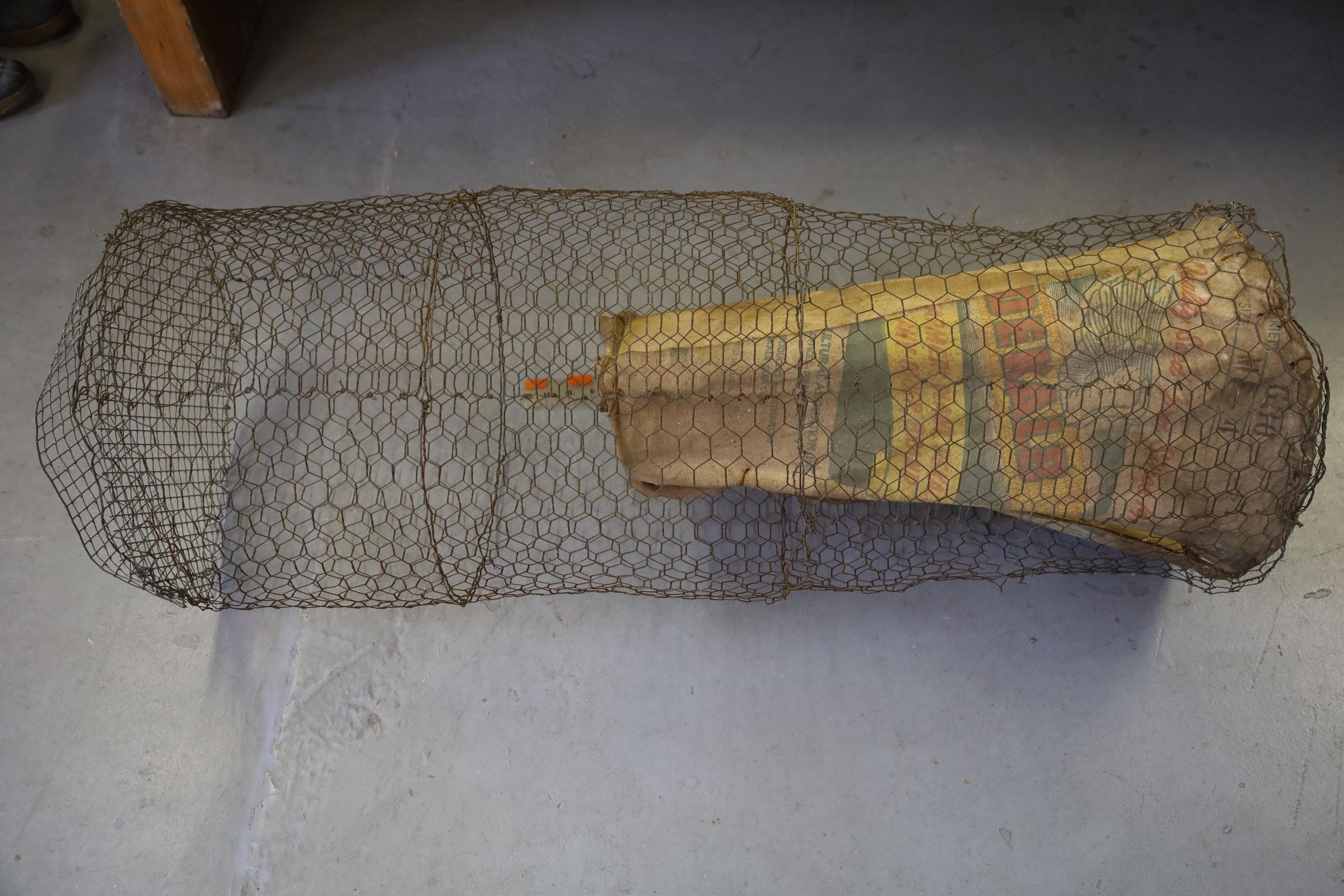 This homemade funnel fish trap has a body constructed of chicken wire and a faded Dekalb grain sack to act as a funnel.Use