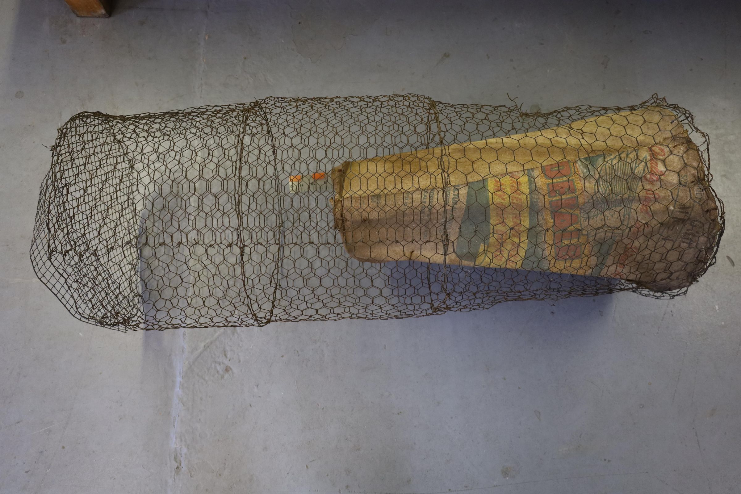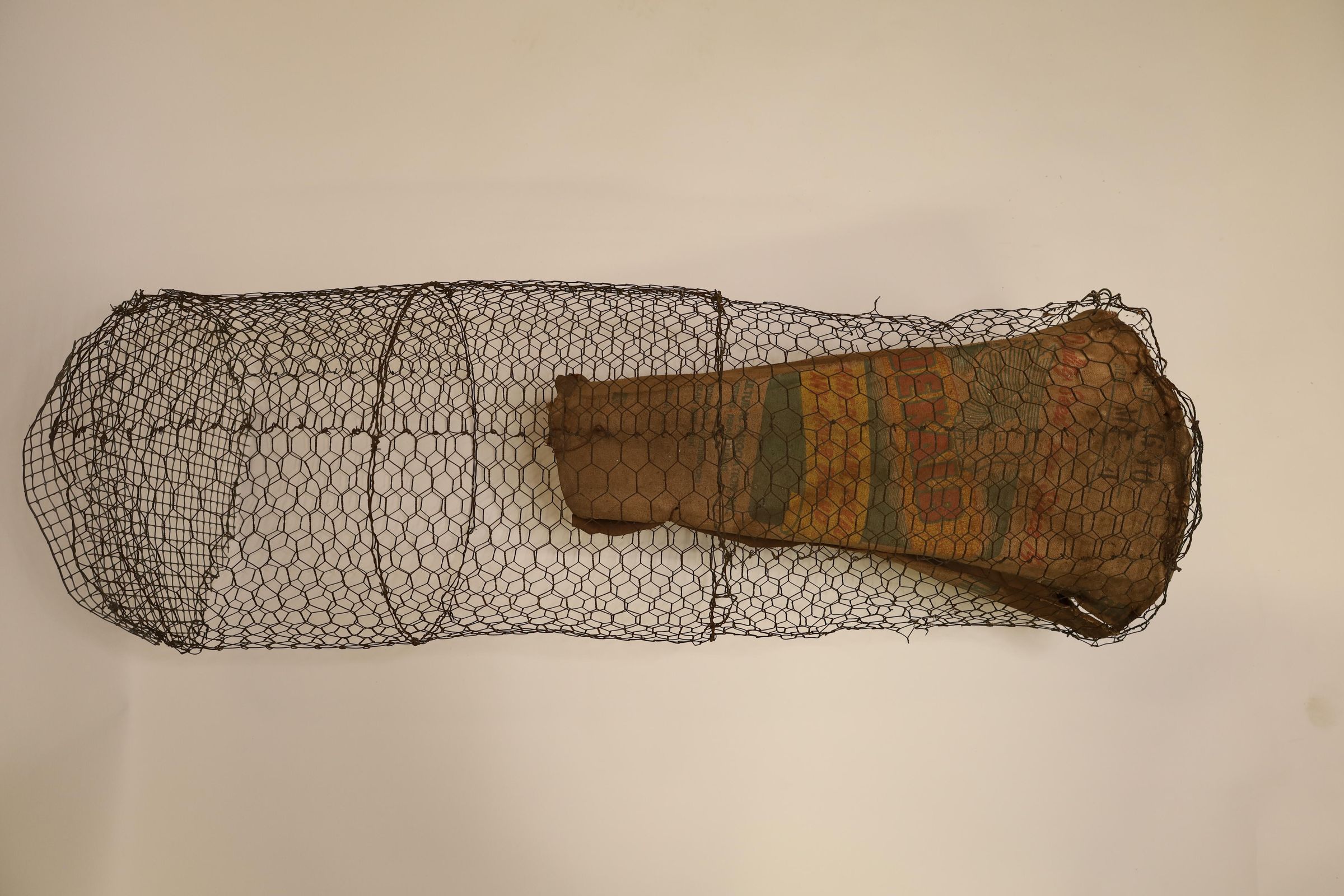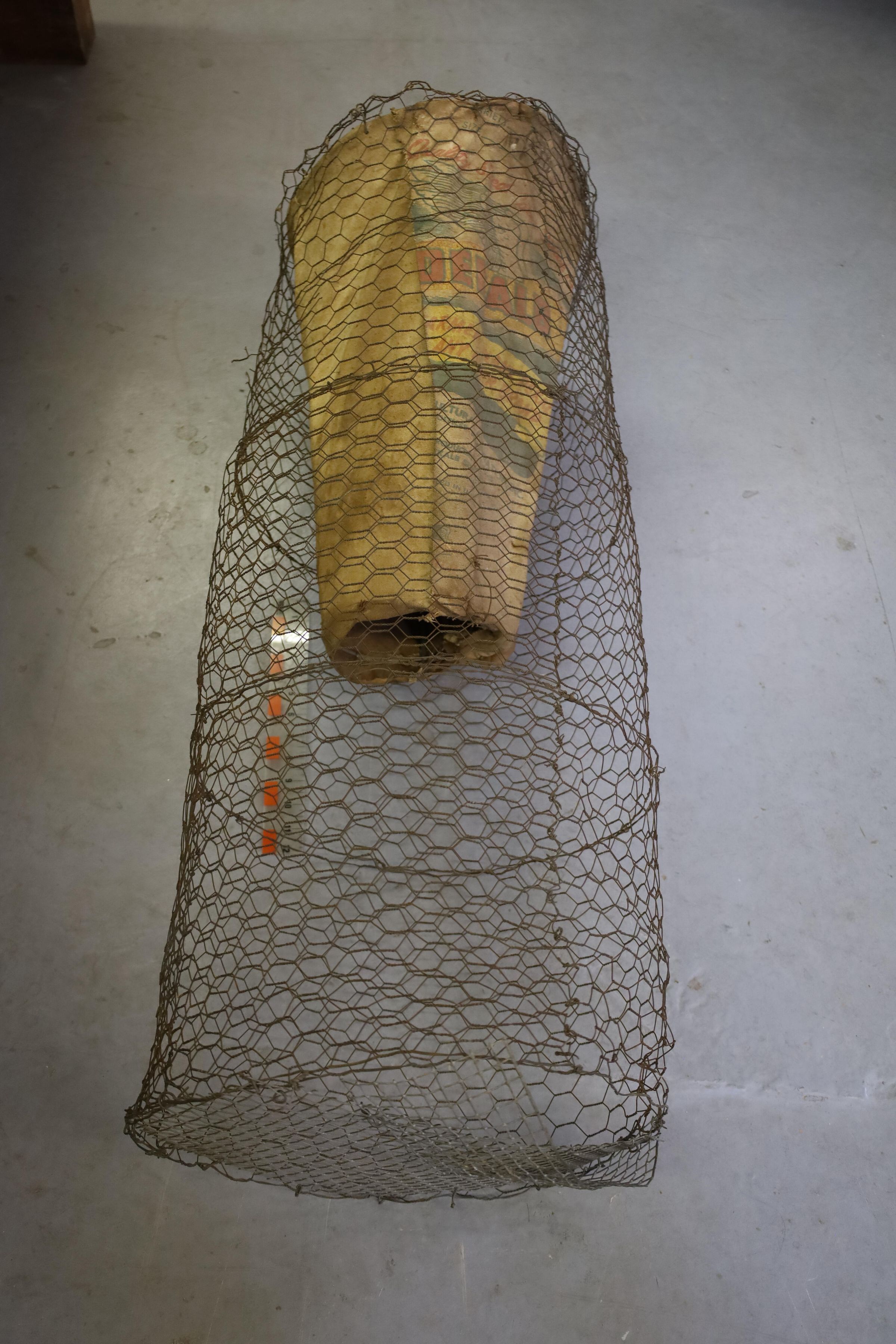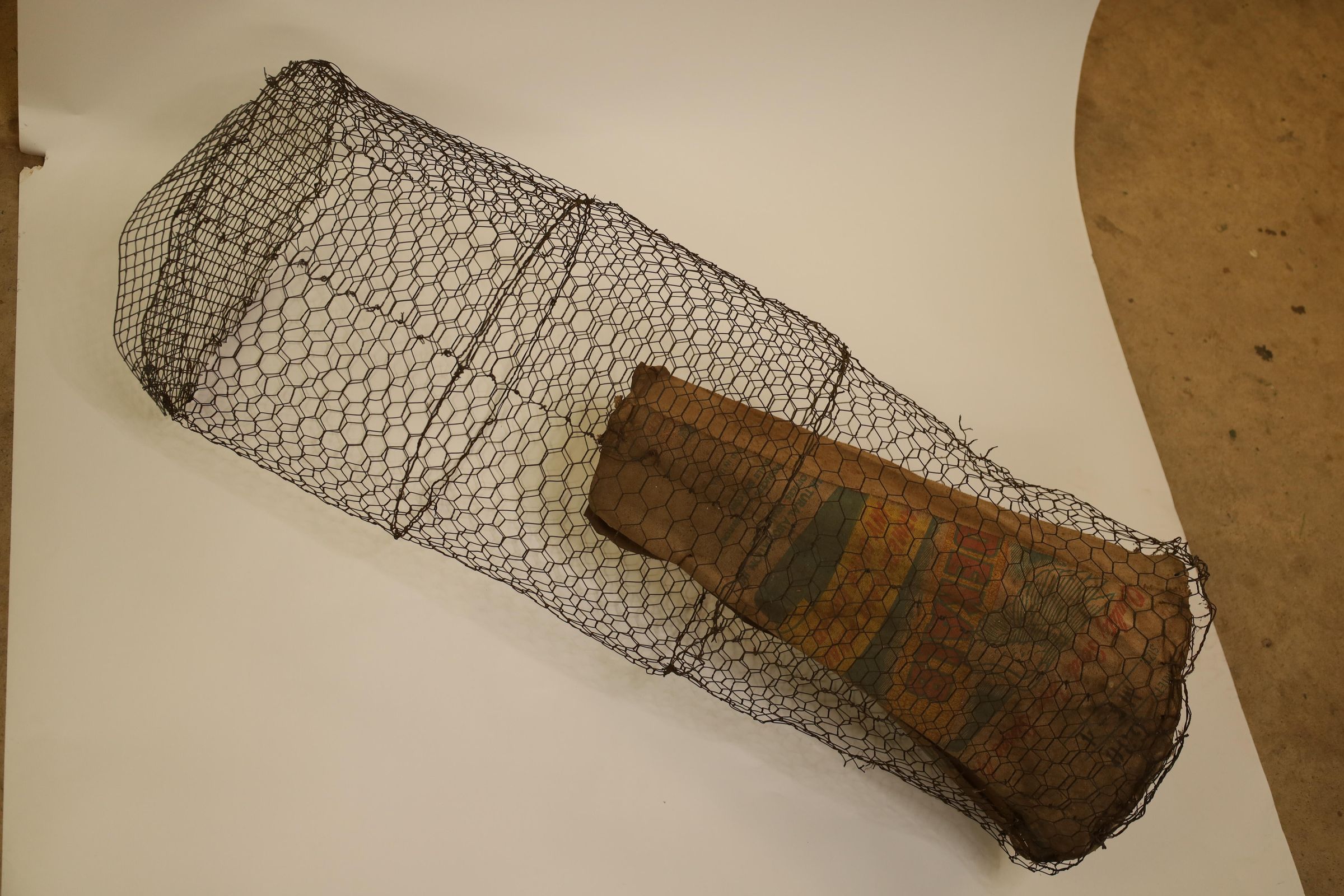 This homemade funnel fish trap has a body constructed of chicken wire and a faded Dekalb grain sack to act as a funnel.Use