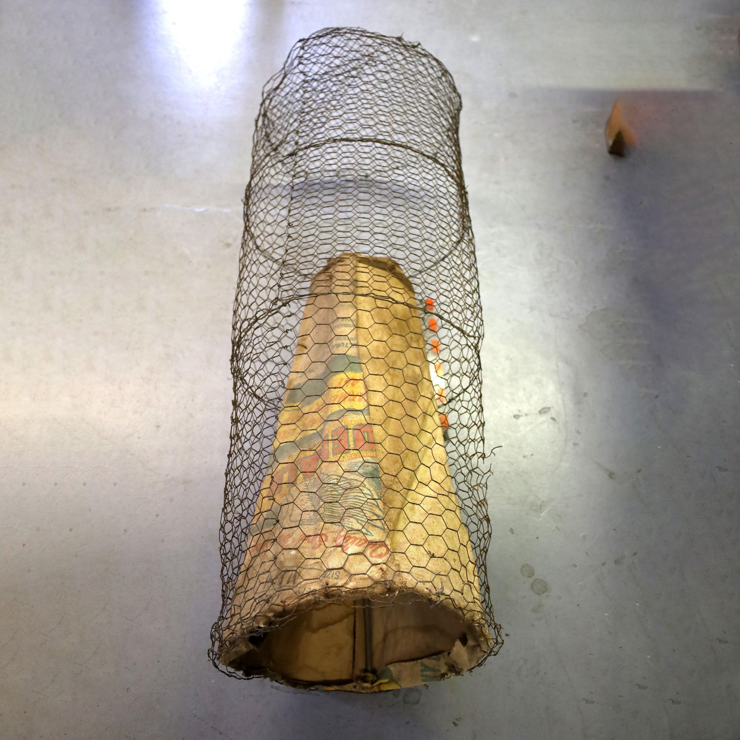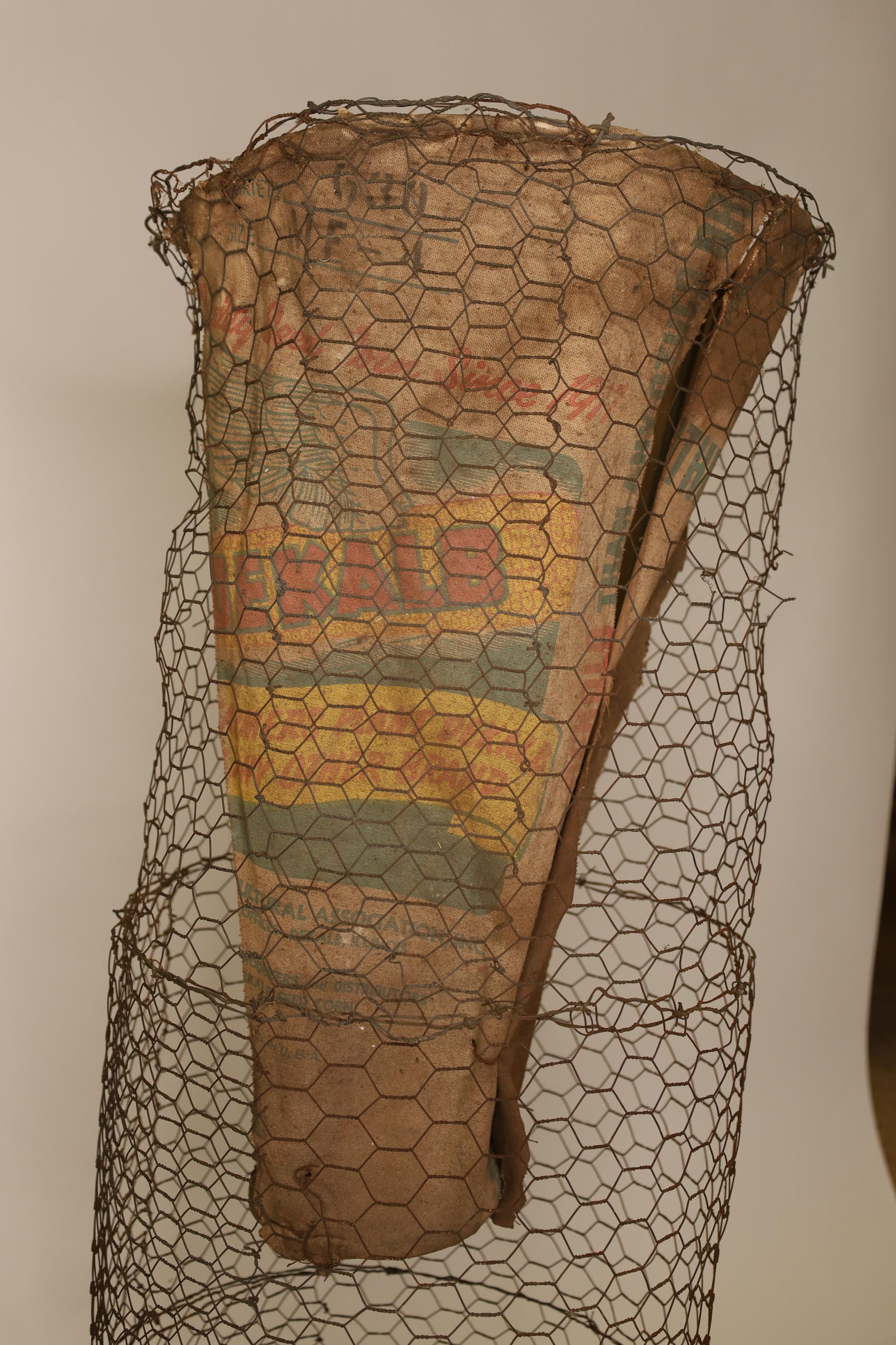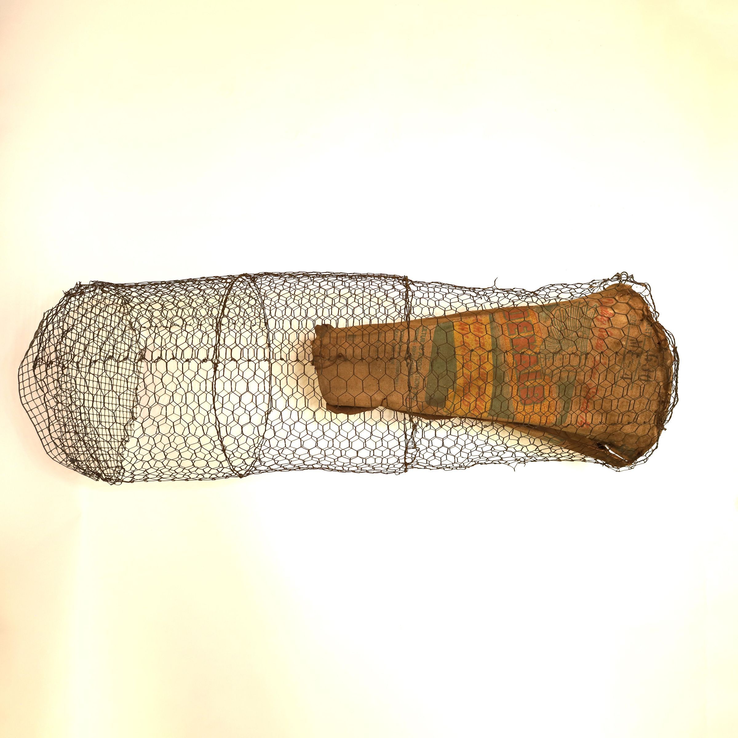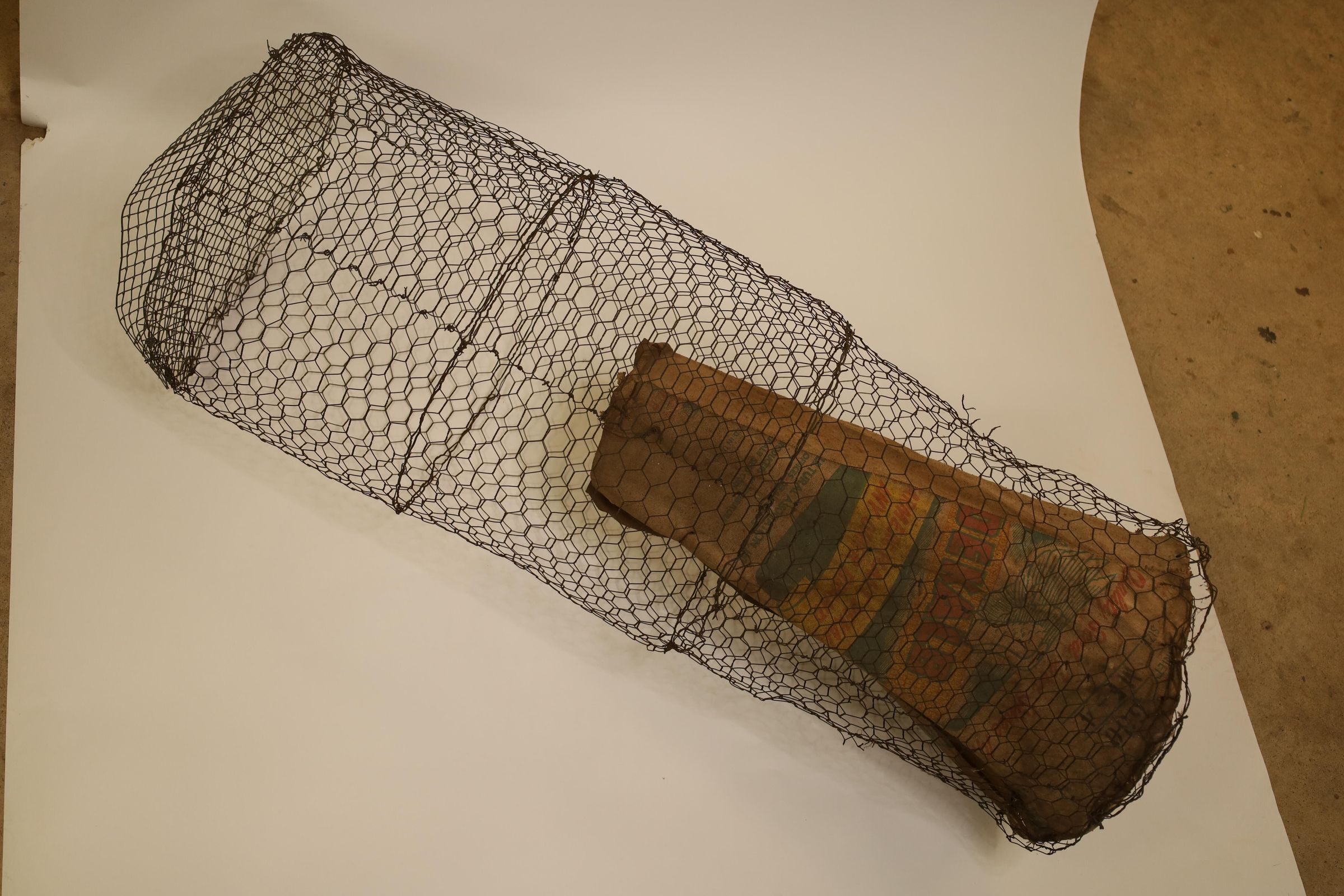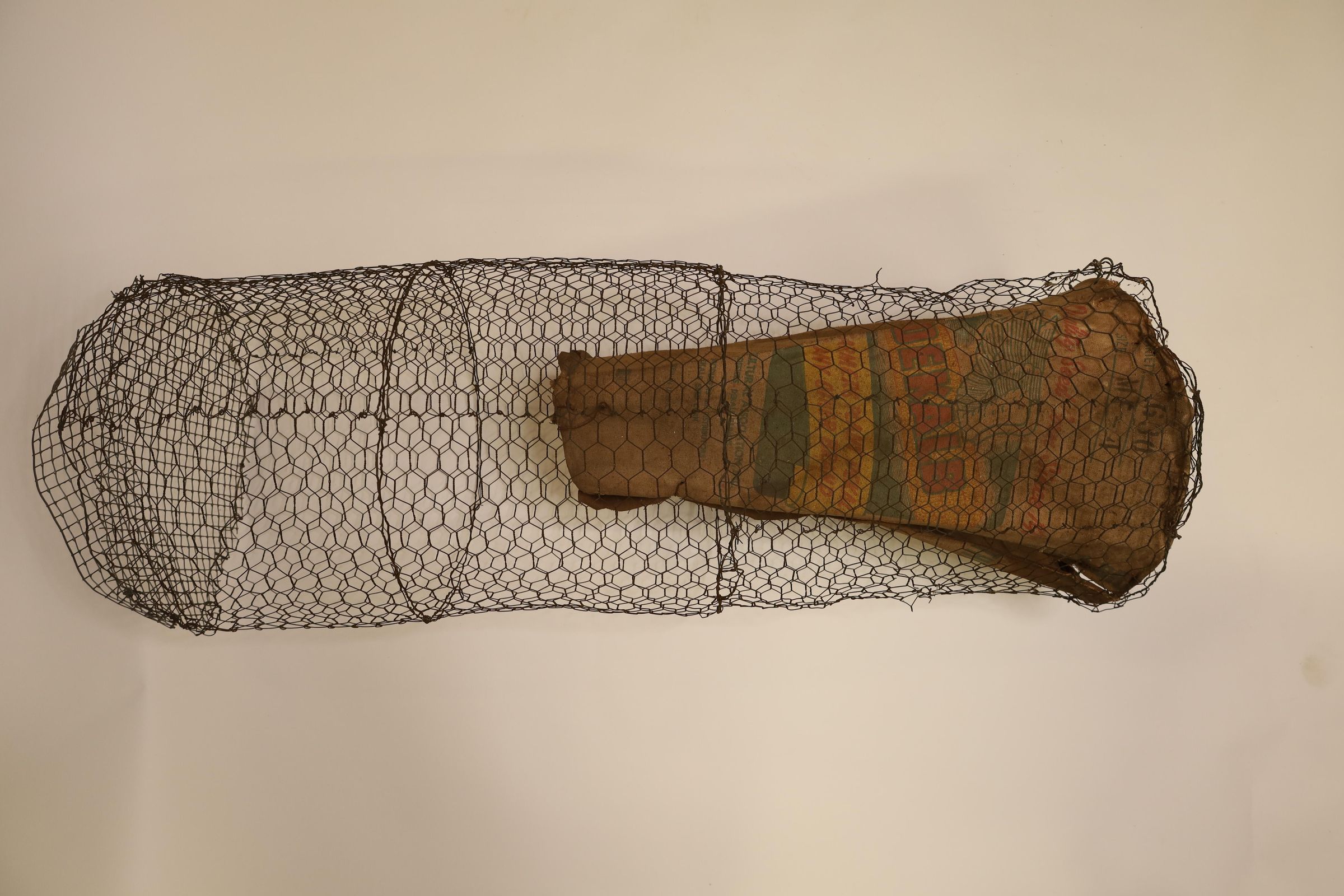 This homemade funnel fish trap has a body constructed of chicken wire and a faded Dekalb grain sack to act as a funnel.Use