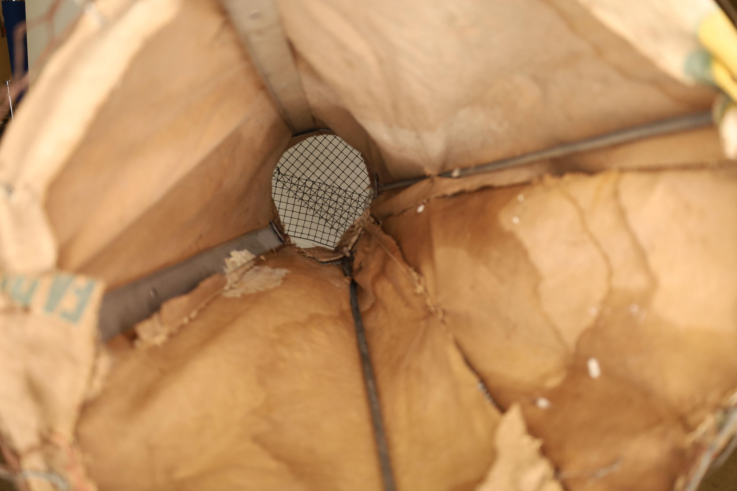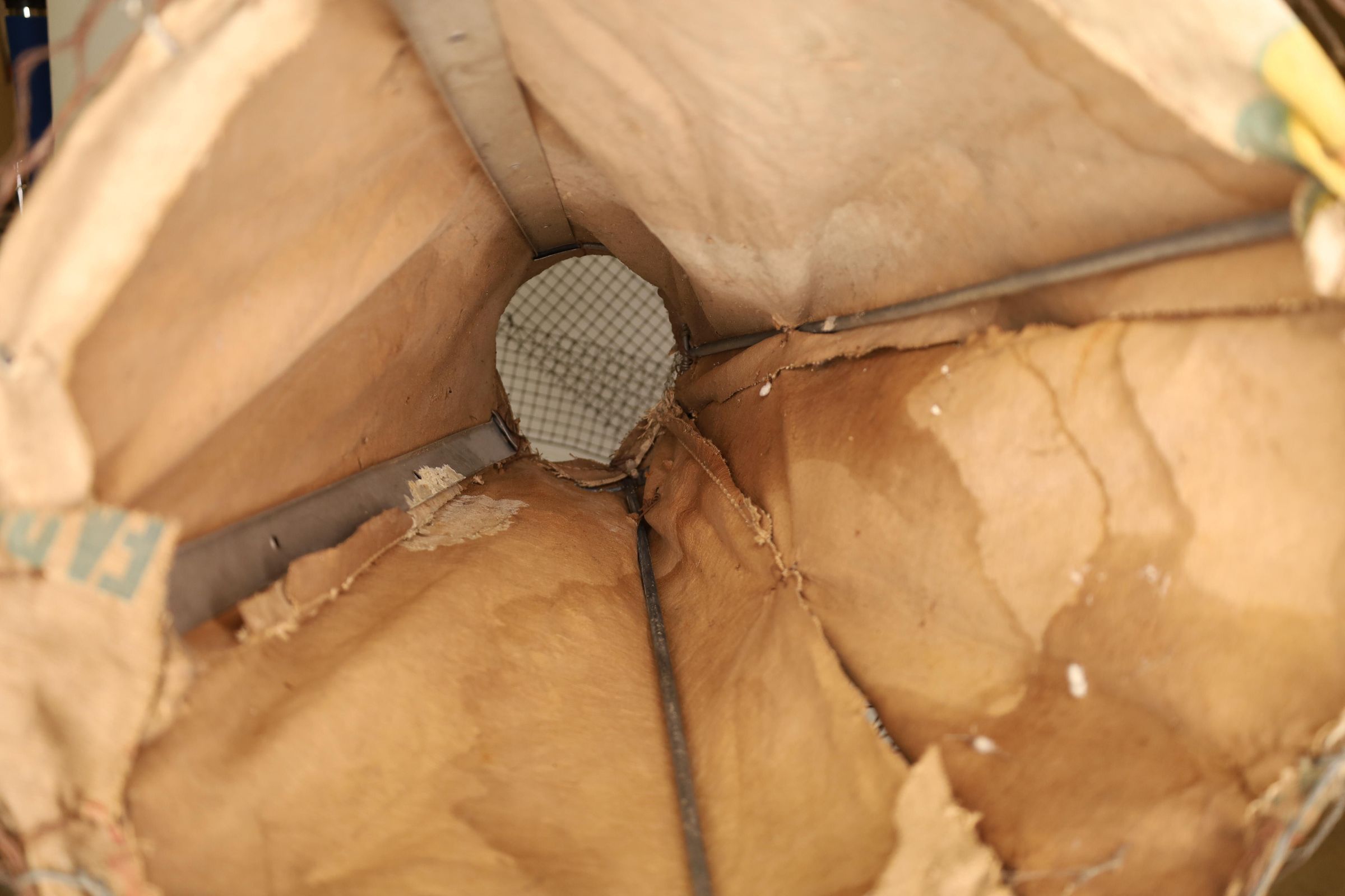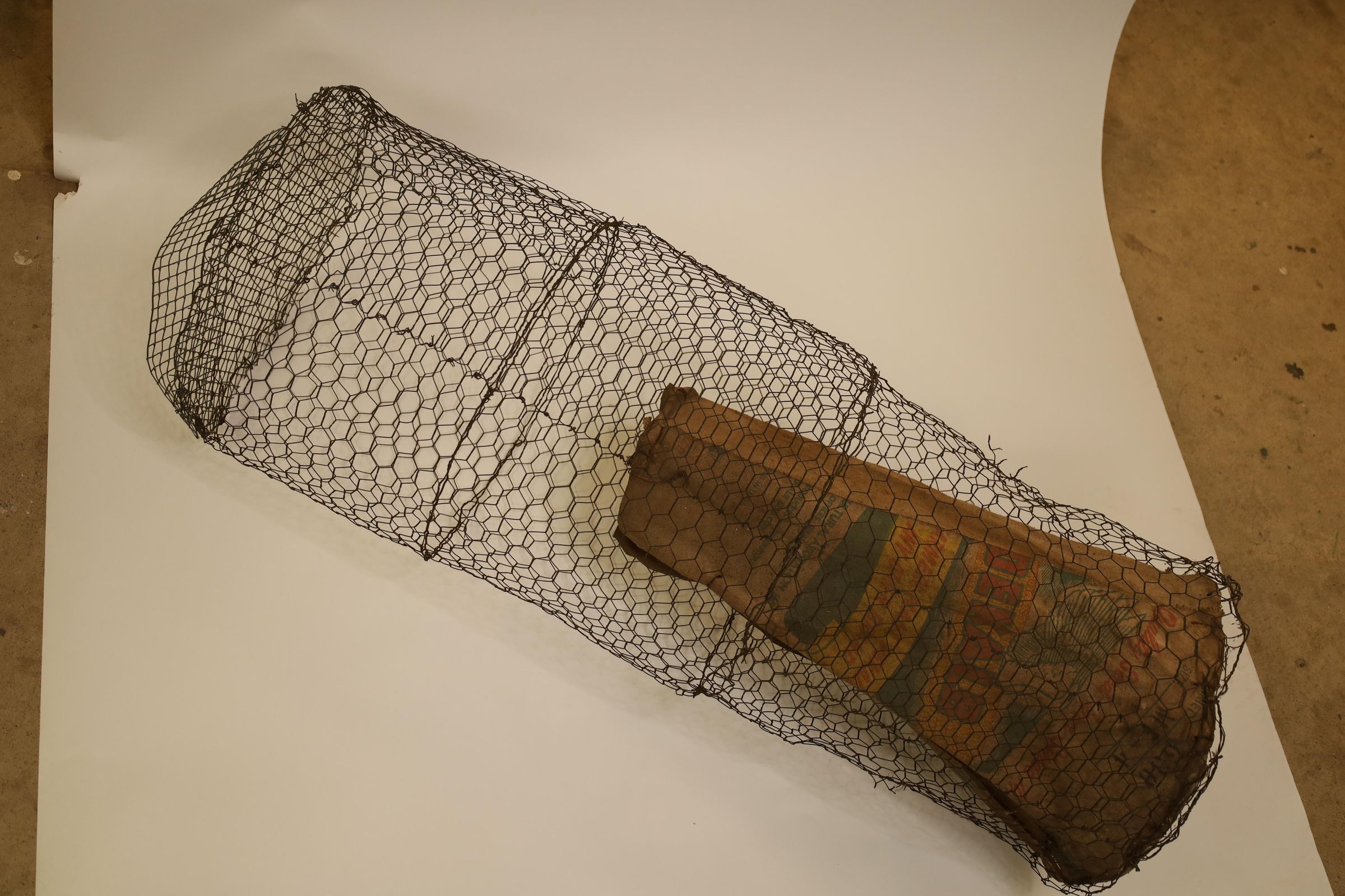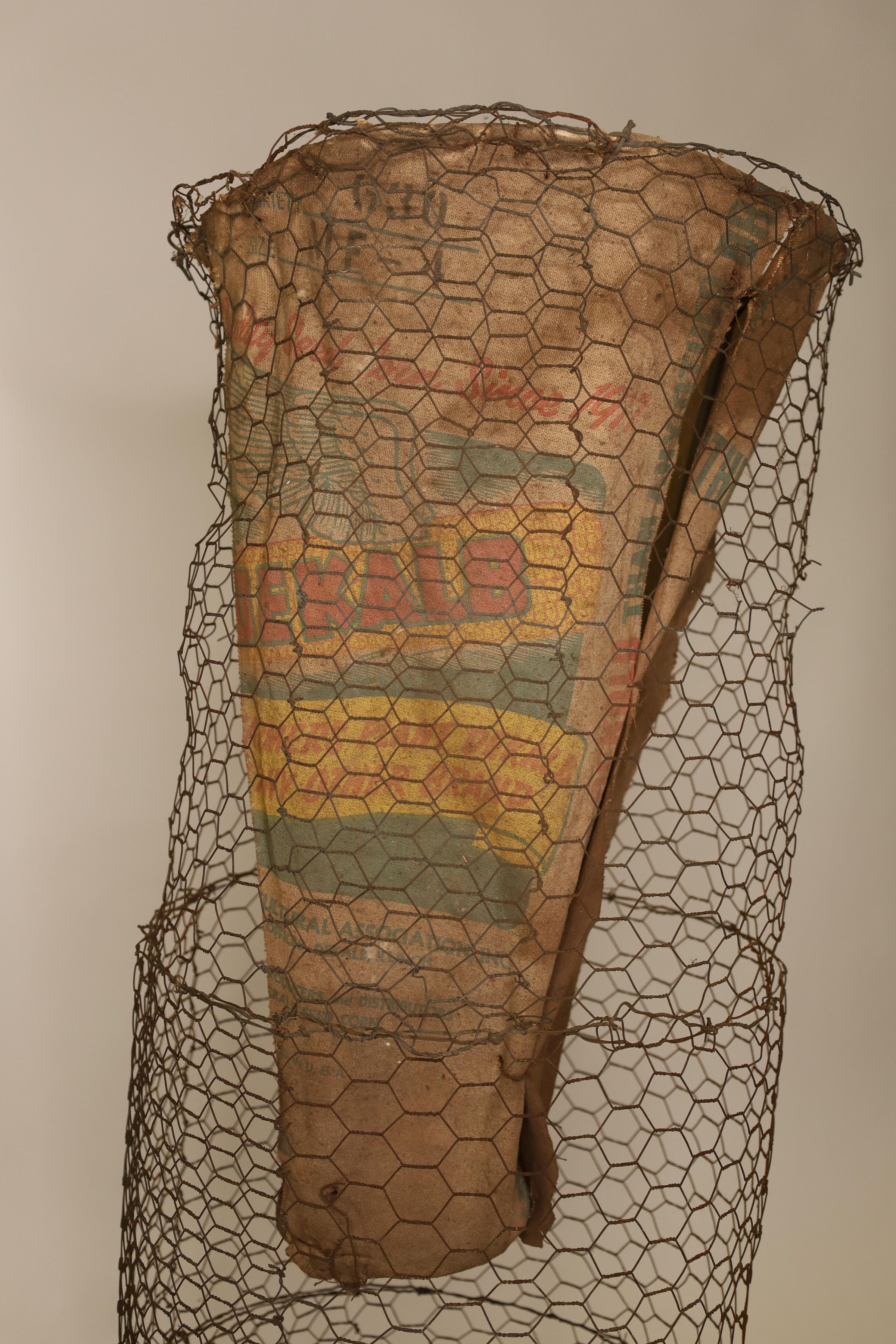 This homemade funnel fish trap has a body constructed of chicken wire and a faded Dekalb grain sack to act as a funnel.Use