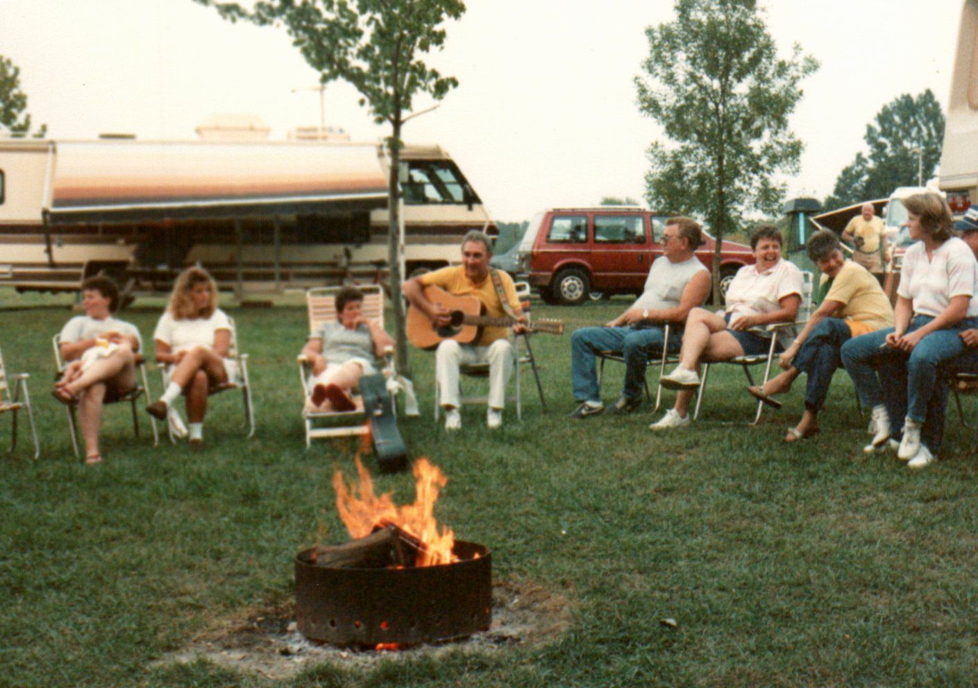 Camperhosts from across the state gather at East Fork State Park for a celebration thanking them for their service. They have seated themselves around a fire pit while one member serenades the group with his guitar.Cataloged By