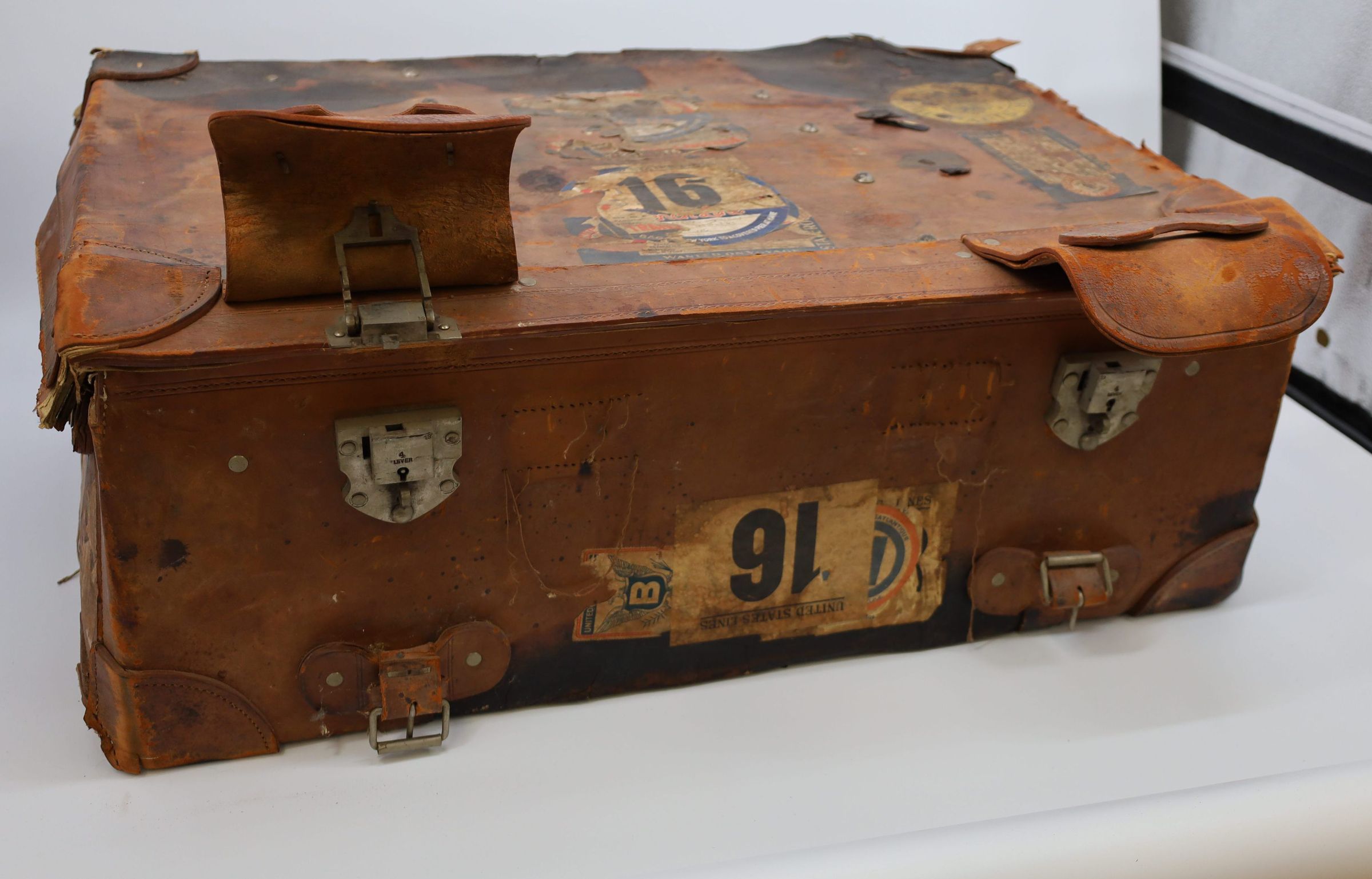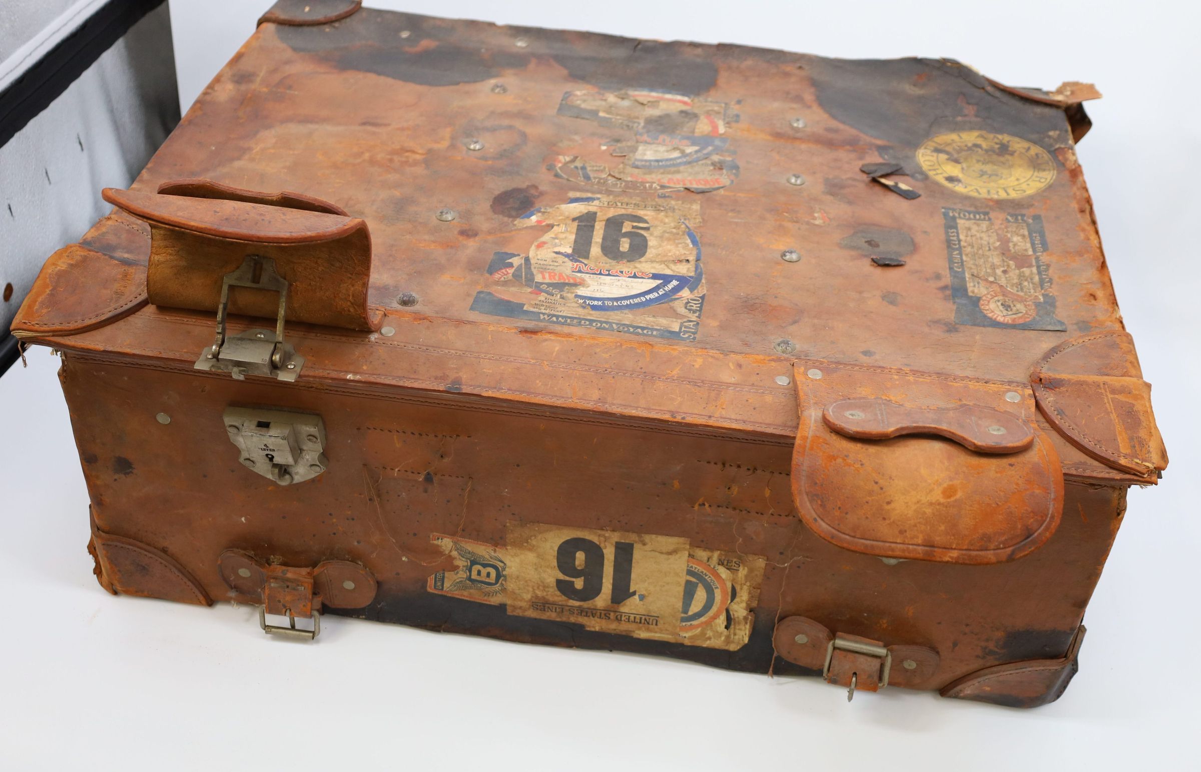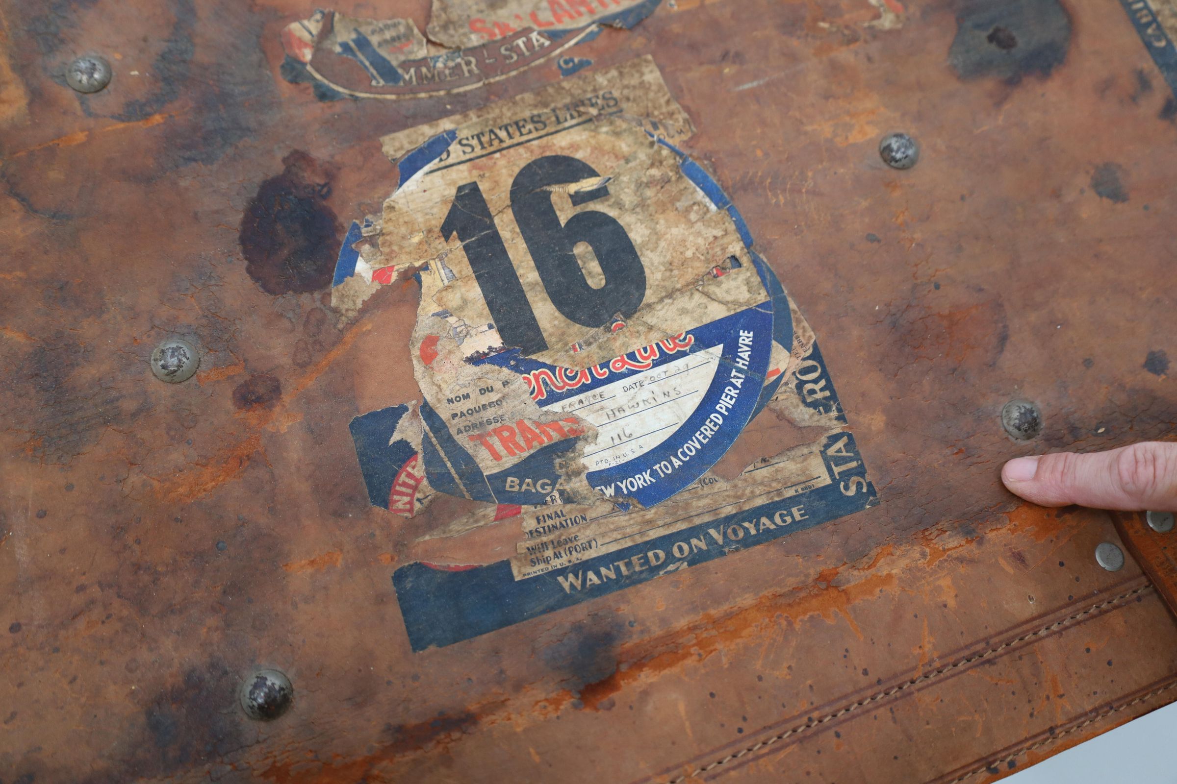 These trunks tell the stories of their owners through the stickers left behind. Unlike the airline tags we cut off our bags after every trip, these stickers were adhered directly to the trunks. Along with tags related to the travel itself, such as the New York to a covered pier in Havre, United States Line, and French Line stickers on Hawkins's trunk, hotels would provide stickers for travelers. Hawkins's trunk includes a sticker from the Hotel Lancaster Paris. The hotel opened in the 1930s and drew glamorous visitors. Marlene Dietrich even lived in suite 401, where her baby grand piano remains.Location