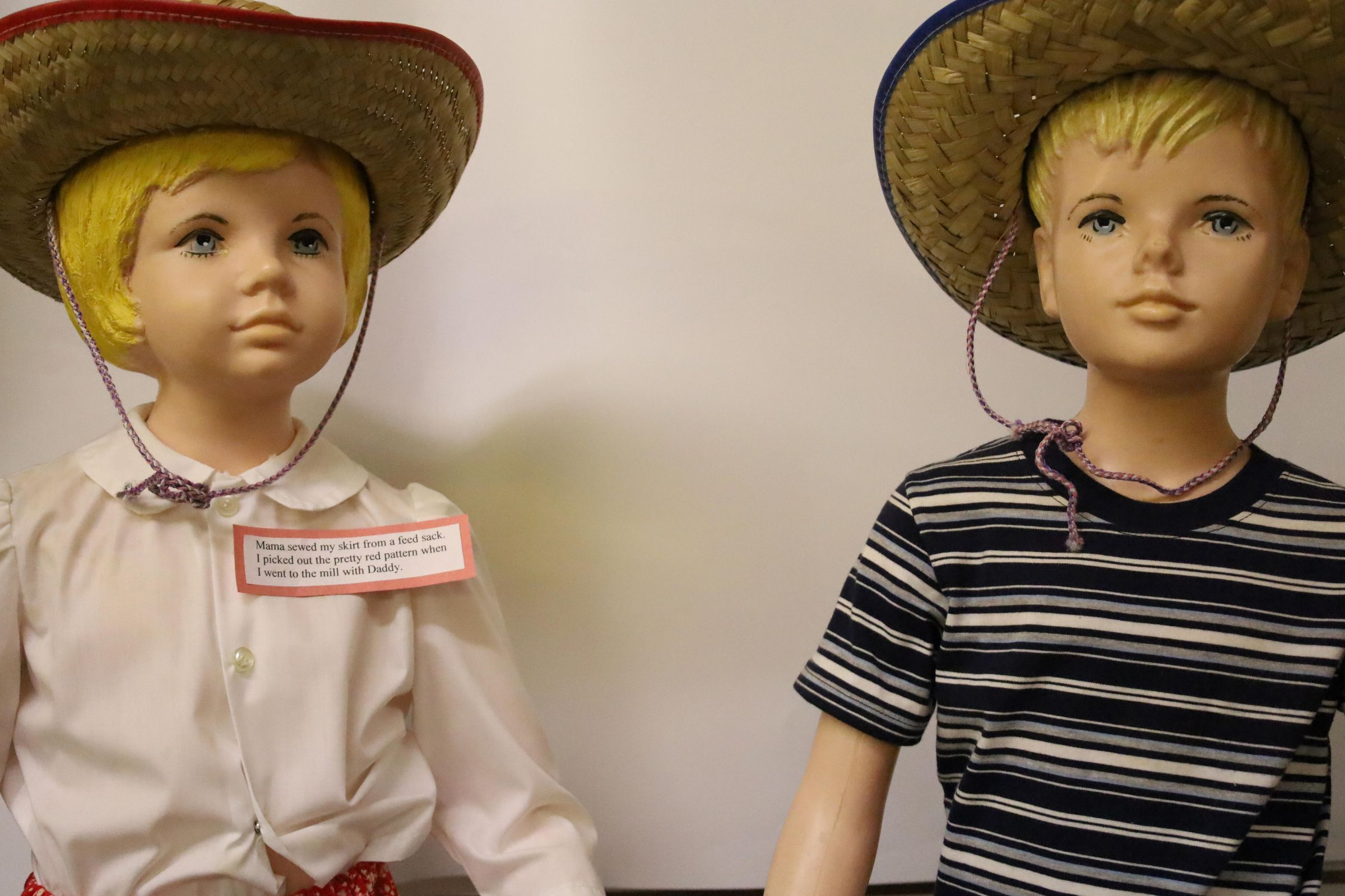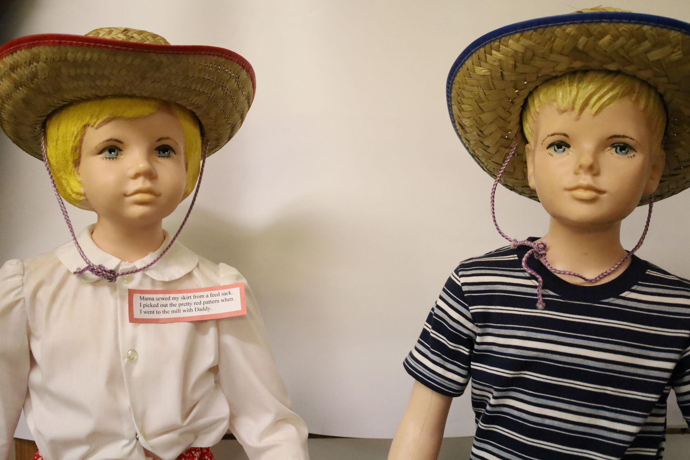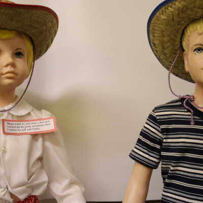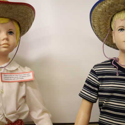 These 1950s mannequins were used as a display for Buster Brown and Mary Jane Shoes. They are now displayed at the Nature Center at Lake Loramie. The girl is wearing a red flowered skirt handmade from a feed sack, a button up white blouse, and a straw hat. The boy is wearing jeans with a rope belt, a striped tee-shirt and a straw hat.
