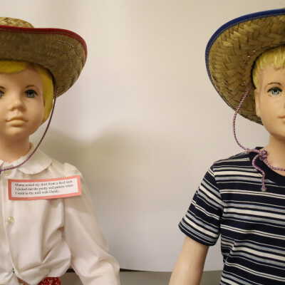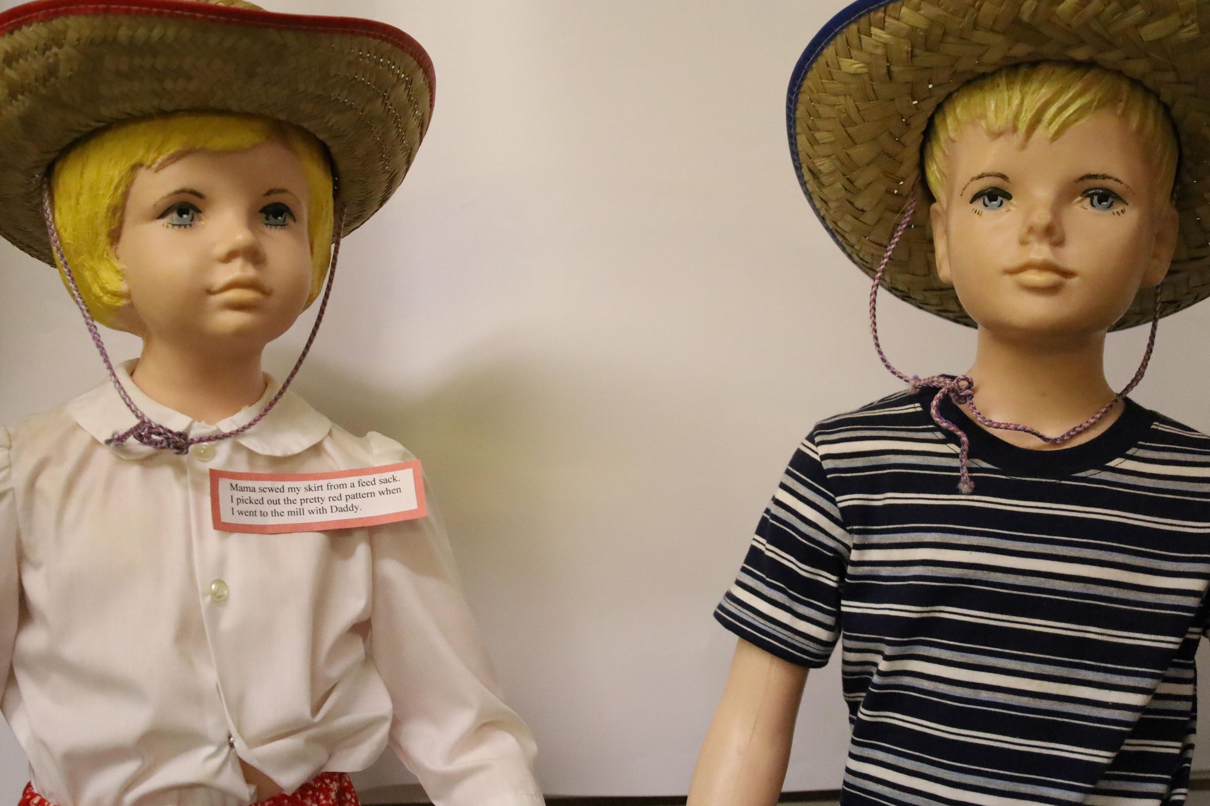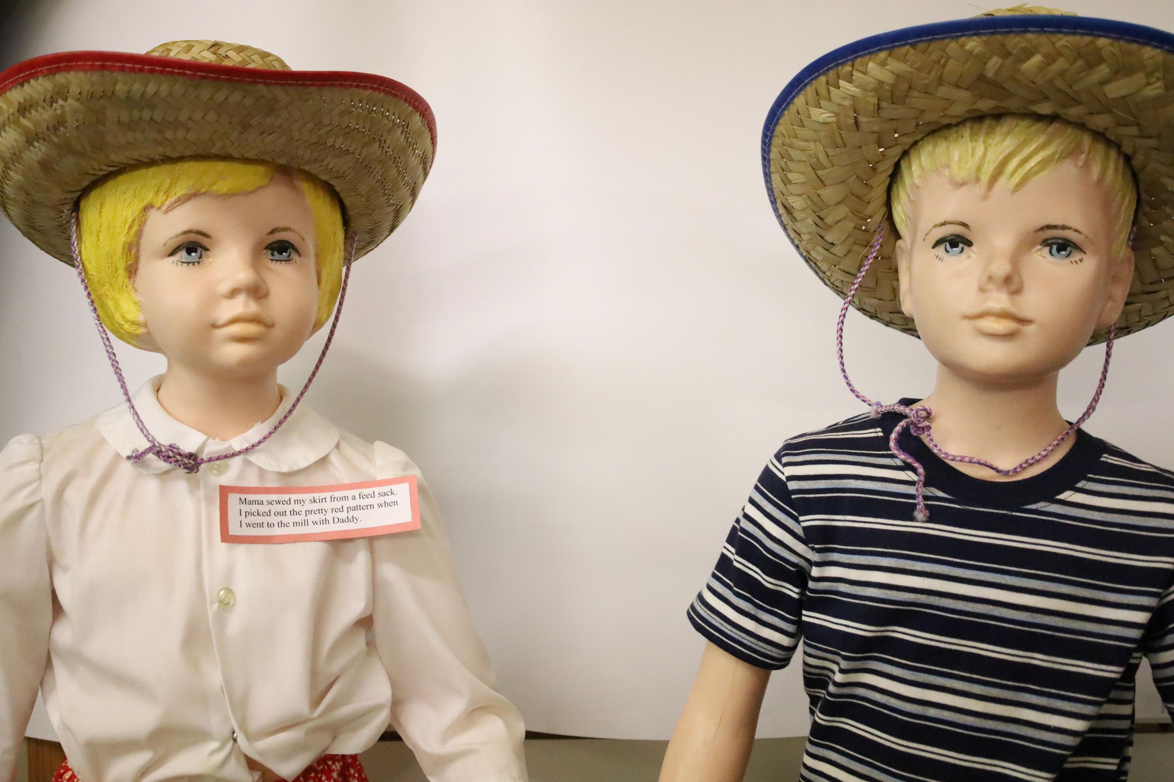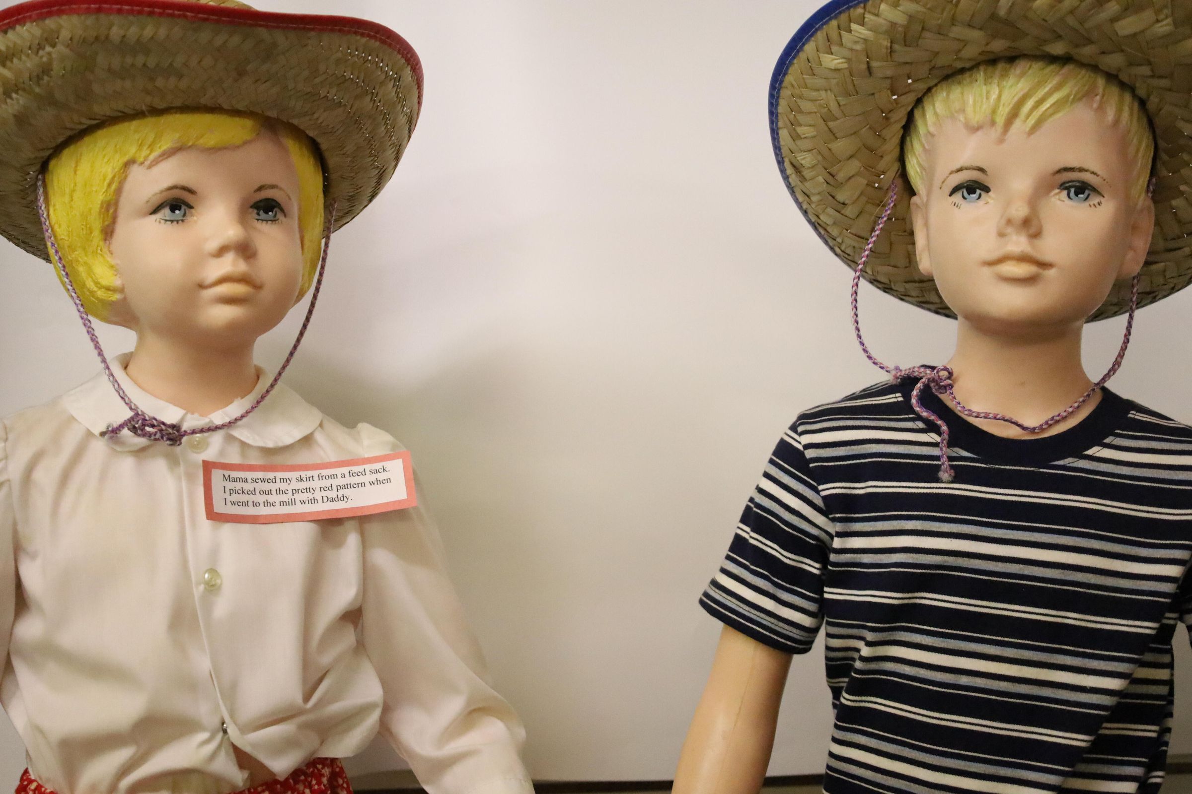 These 1950s mannequins were used as a display for Buster Brown and Mary Jane Shoes. They are now displayed at the Nature Center at Lake Loramie. The girl is wearing a red flowered skirt handmade from a feed sack, a button up white blouse, and a straw hat. The boy is wearing jeans with a rope belt, a striped tee-shirt and a straw hat.