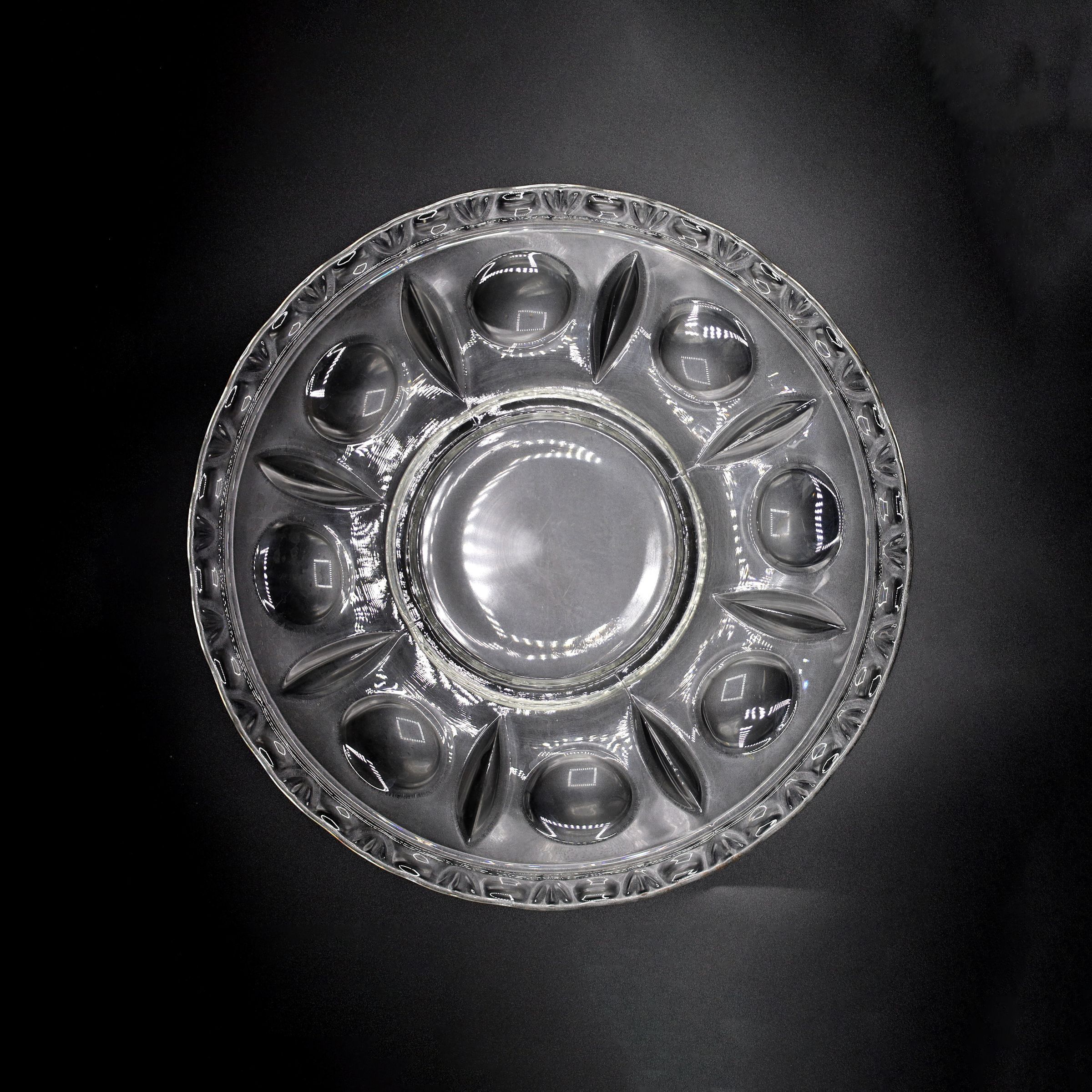 Colorless glass platter that is 10-inches in diameter with a geometric design.