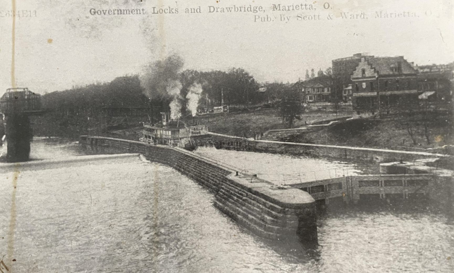 The lock and drawbridge at the mouth of the Muskingum River in Marietta, Ohio. This was the first of a series of 11 locks that allowed ships to travel from the Ohio River and up the Muskingum to reach the Ohio and Erie Canal at Dresden. Lock 1 is the only missing lock of the 11 historic locks on the Muskingum River. This lock was located by Marietta's Putnam Street Bridge, visible in this photograph's left side.