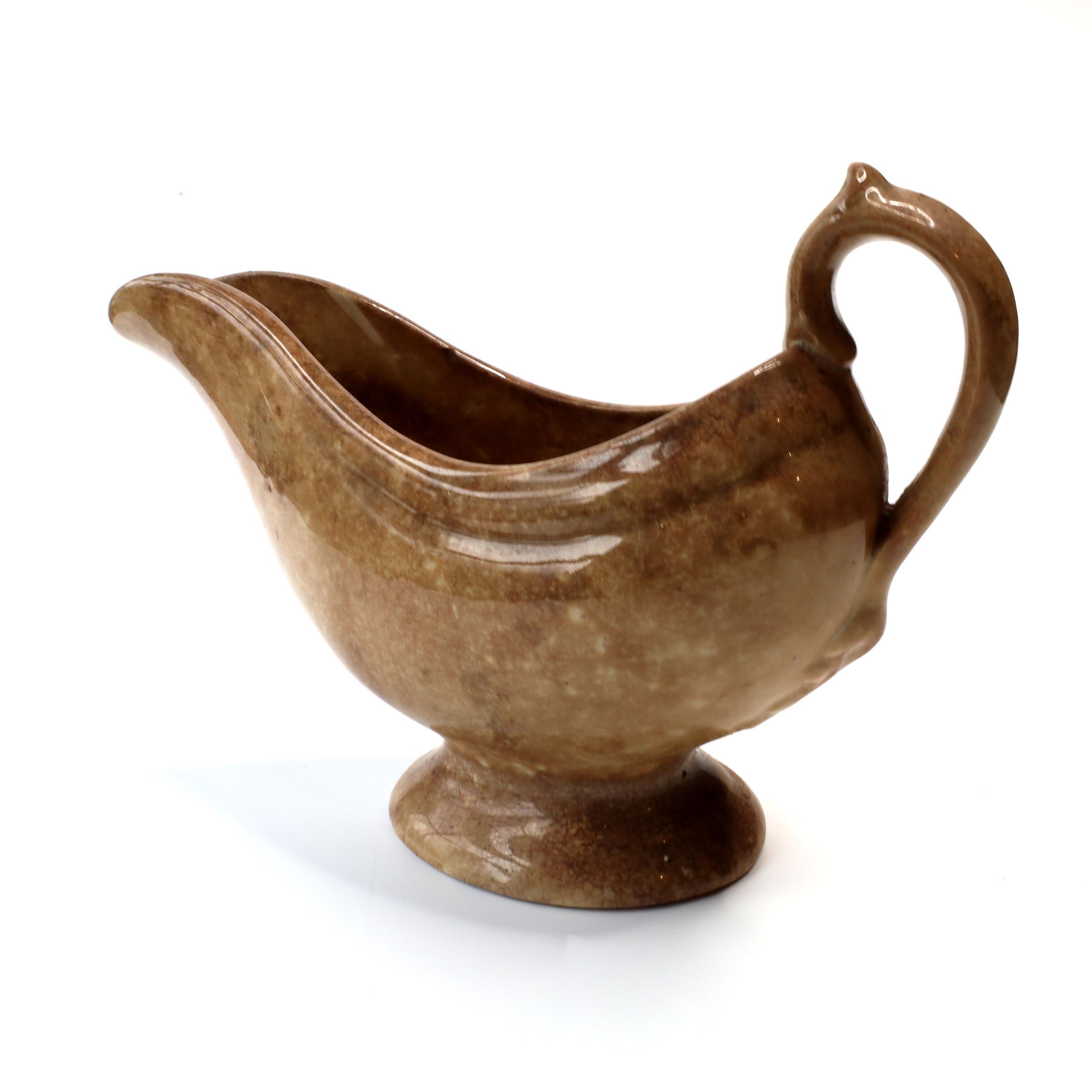 This glazed gravy boat in beige tones has a simple tailored oval shape that is accented with a lion tail handle.
