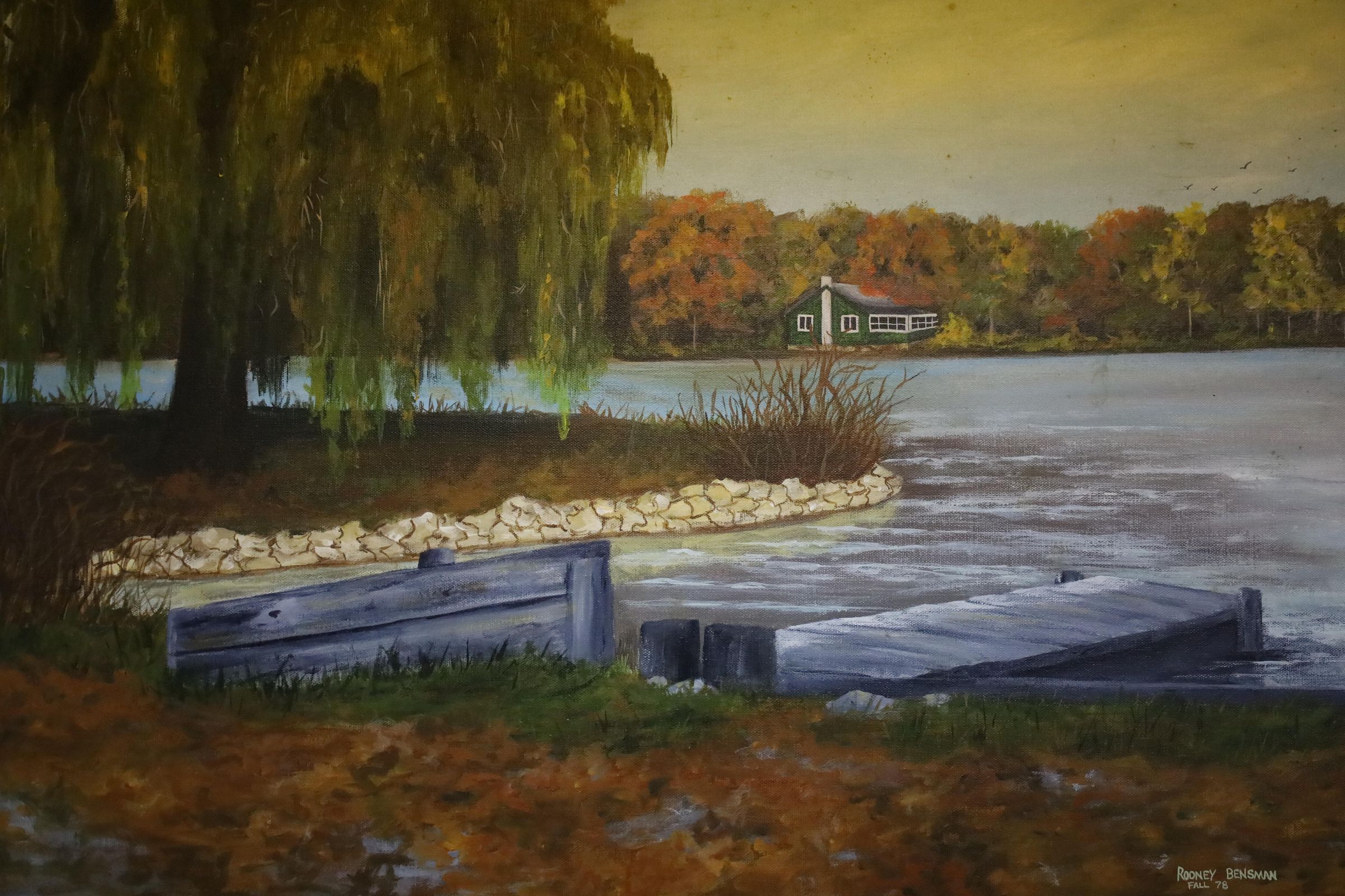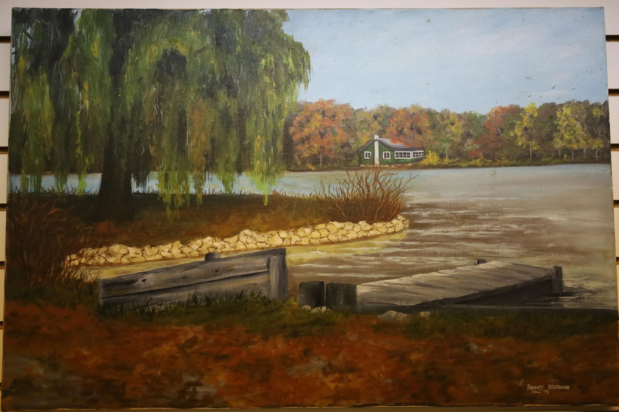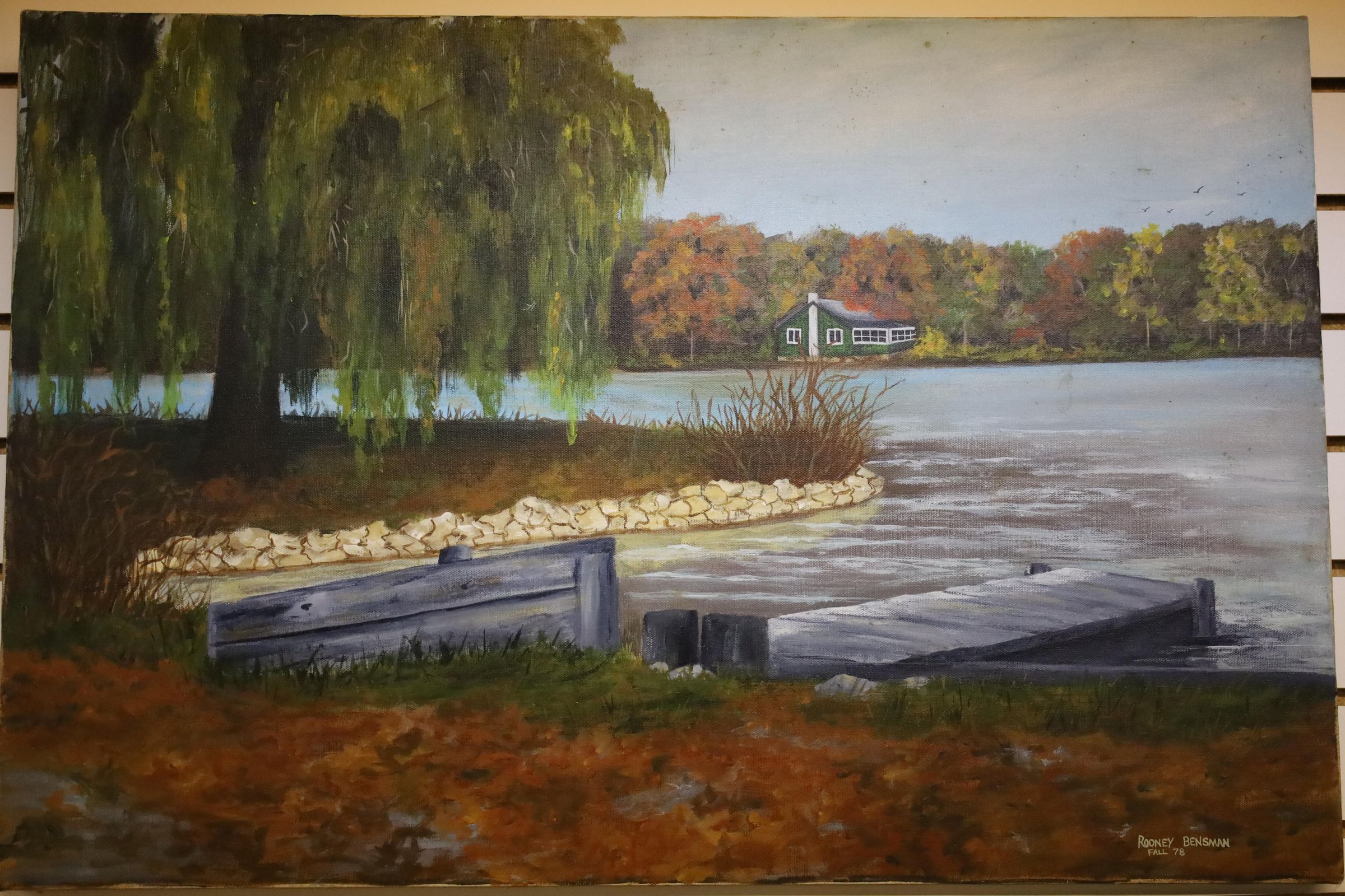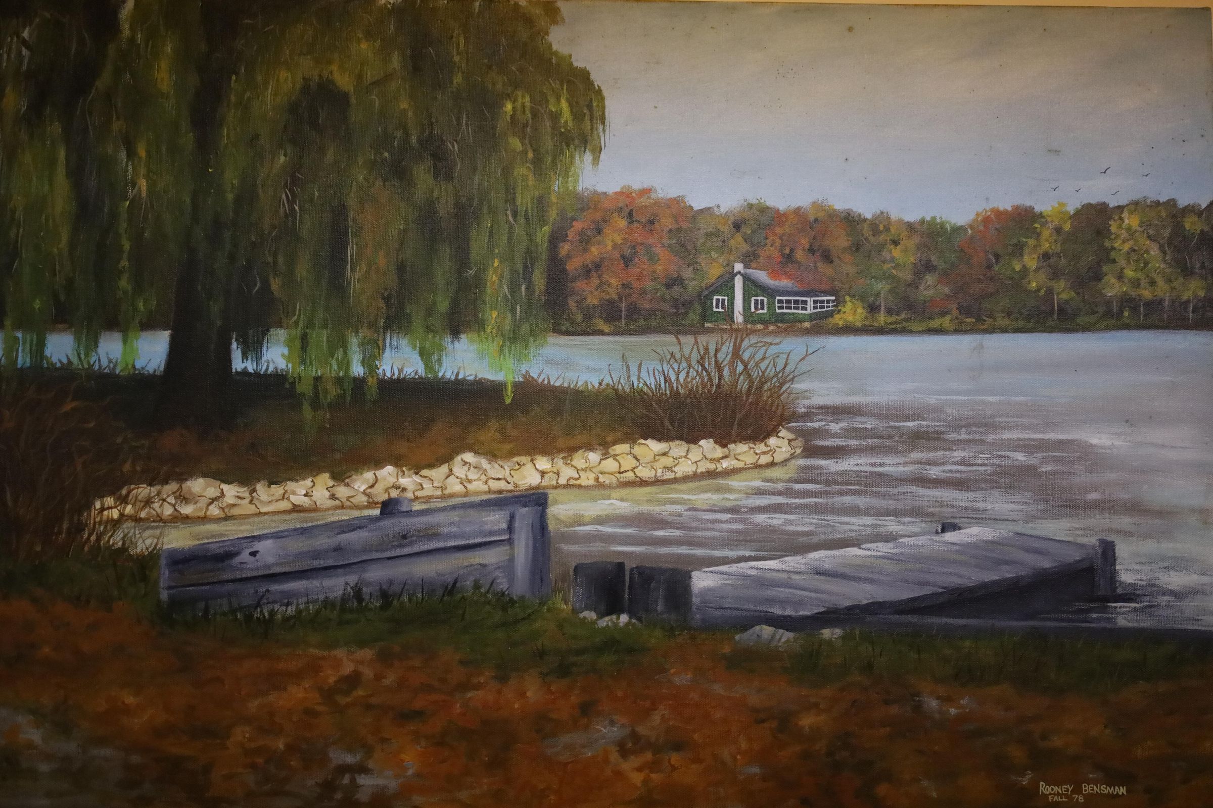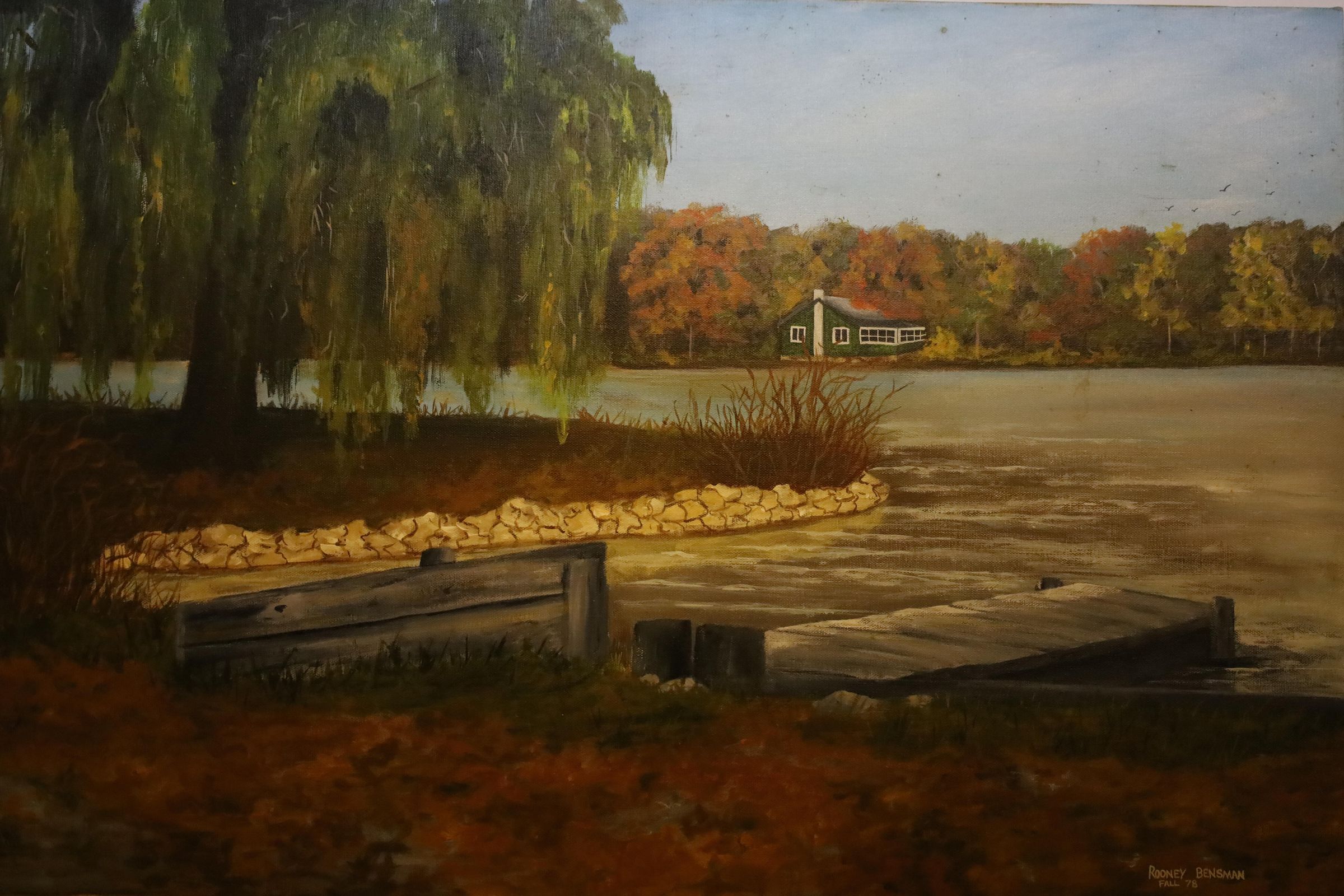This painting hangs in the Nature Center at Lake Loramie and was painted by local artist, Rooney Bensman in the fall of 1978. Rooney's painting features a section of Lake Loramie, a dock and a tree with decorative rocks on the shoreline surrounding the tree. Across the lake stands one green house with white borders around the windows and a white chimney. The green house is nestled in with many trees changing into fall colors. Lynn Smith, a historian and a Friend of Lake Loramie, reports that the green house is no longer there.Location