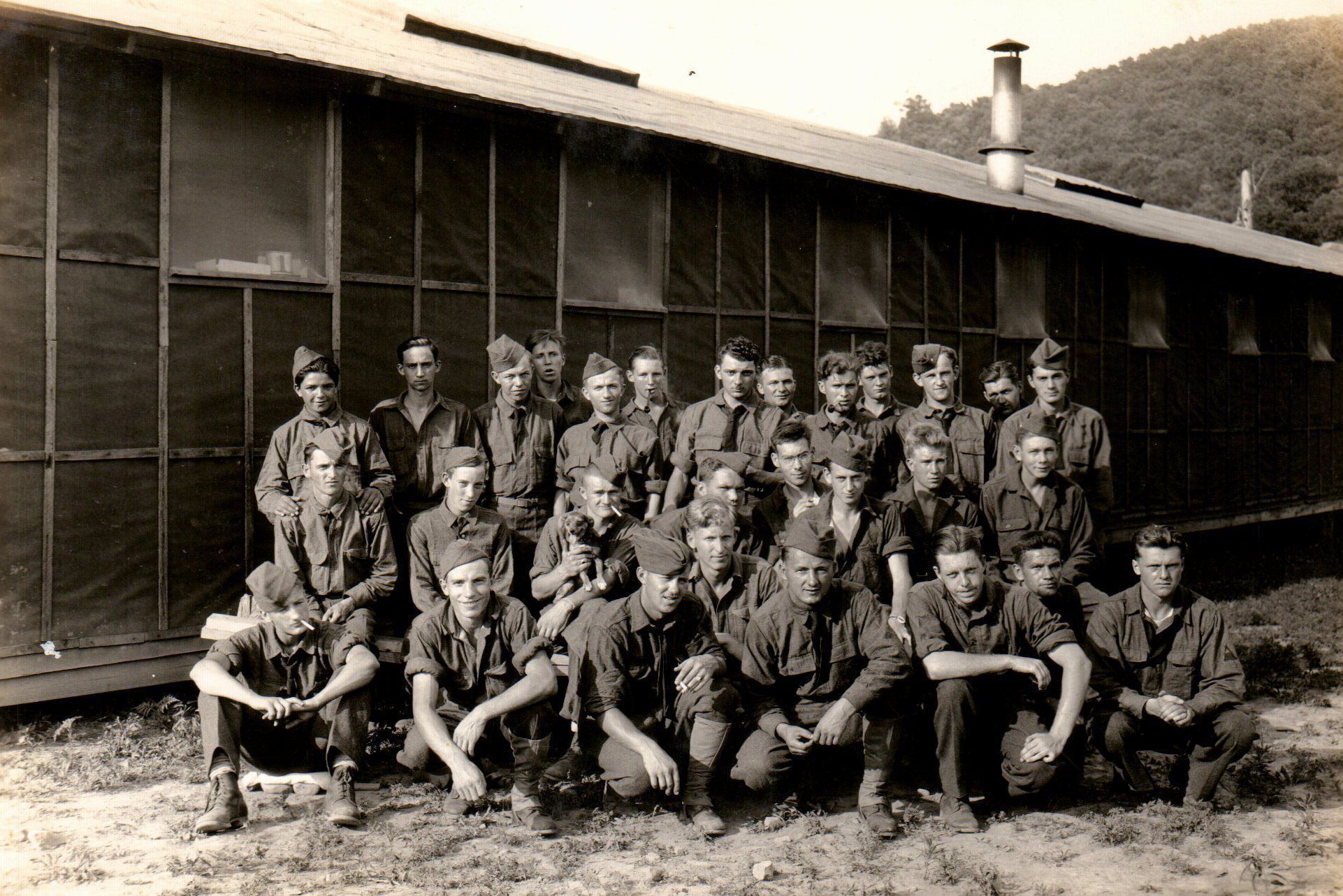 A group of men from Civilian Conservation Corps (CCC) Company 503 pose for a photograph in front of one of Camp Pike's barracks. The men look, stand, and pose differently-representing the distinct places, experiences, ethnicities, and backgrounds that they brought with them to the CCC. One man in the second row (third from left) include a small dog in the photograph who, aptly, smiles for the photograph.