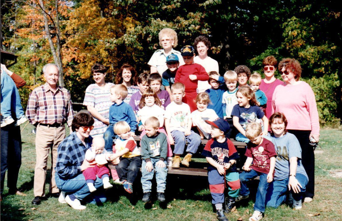 Adults and children gather around a park bench at Mt. Gilead State Park for a group photo in October of 1995.