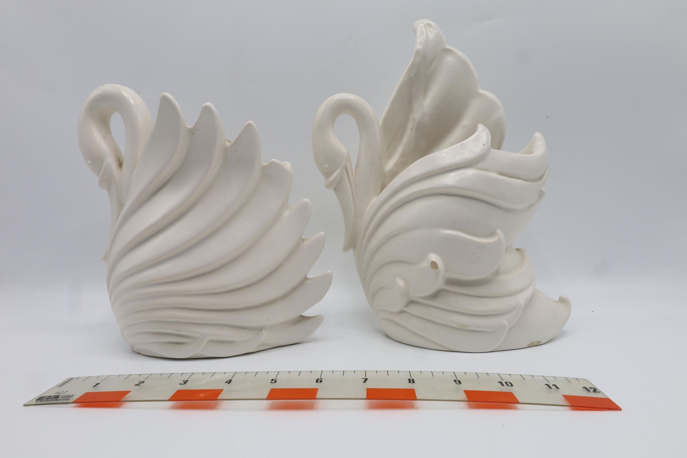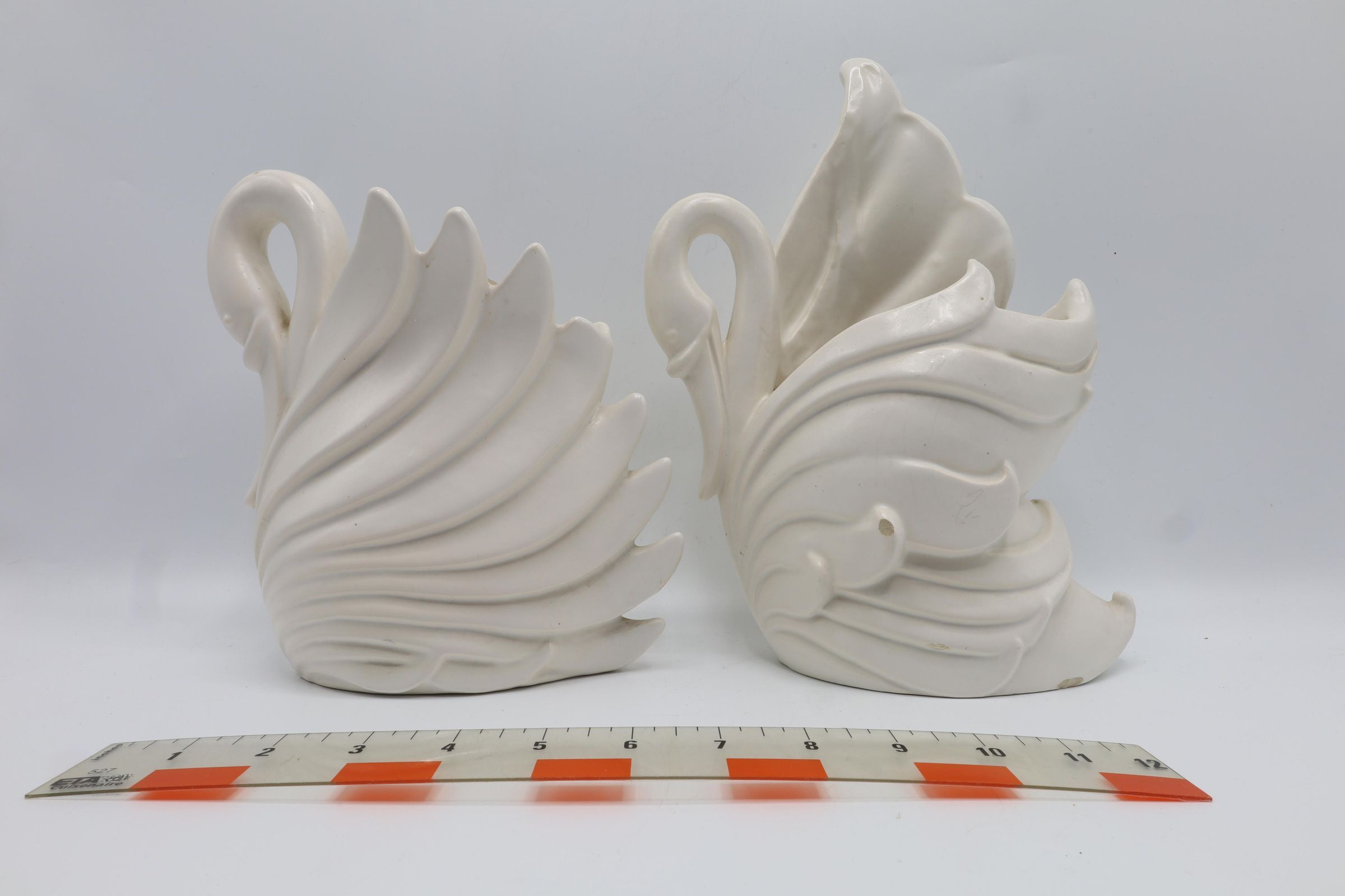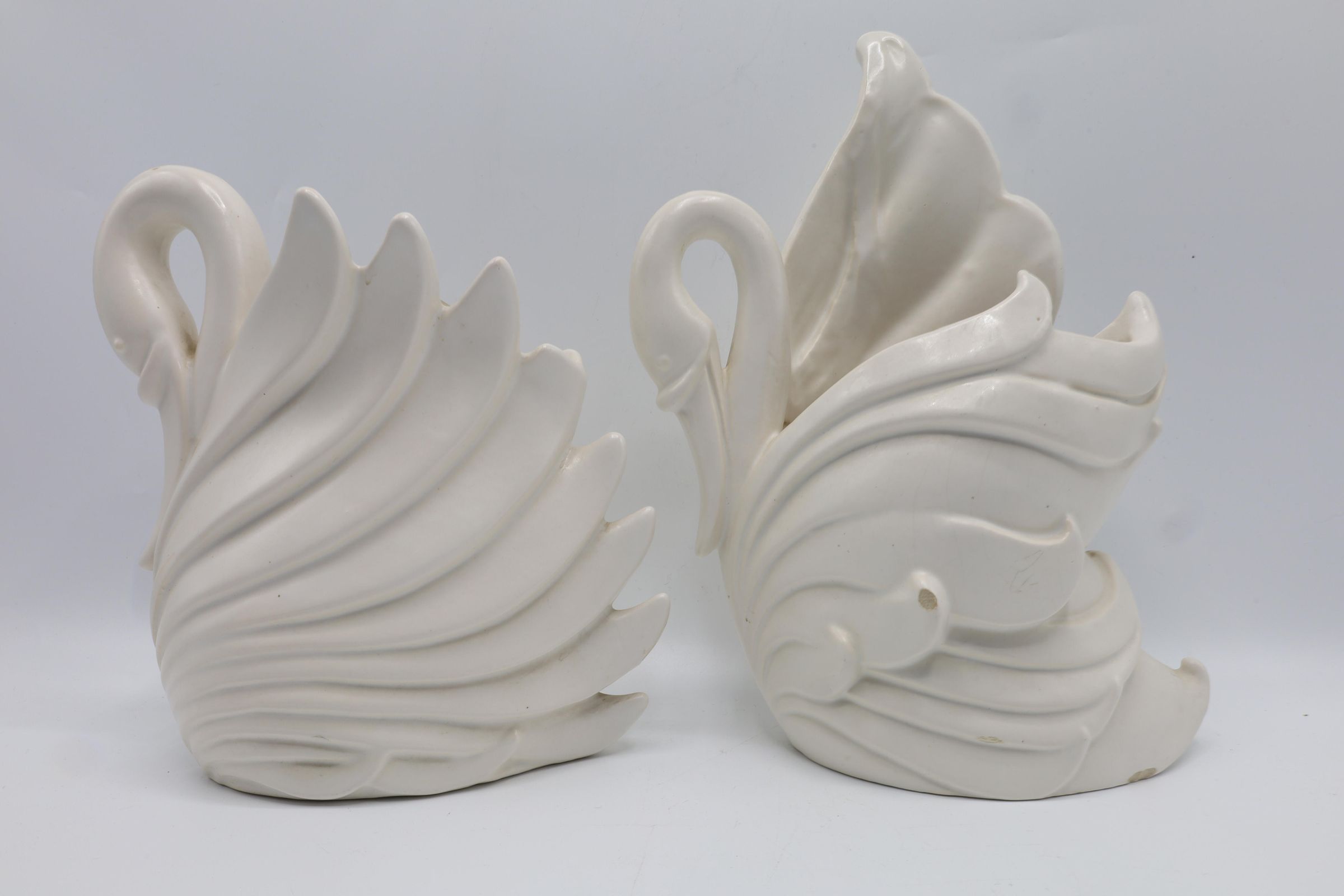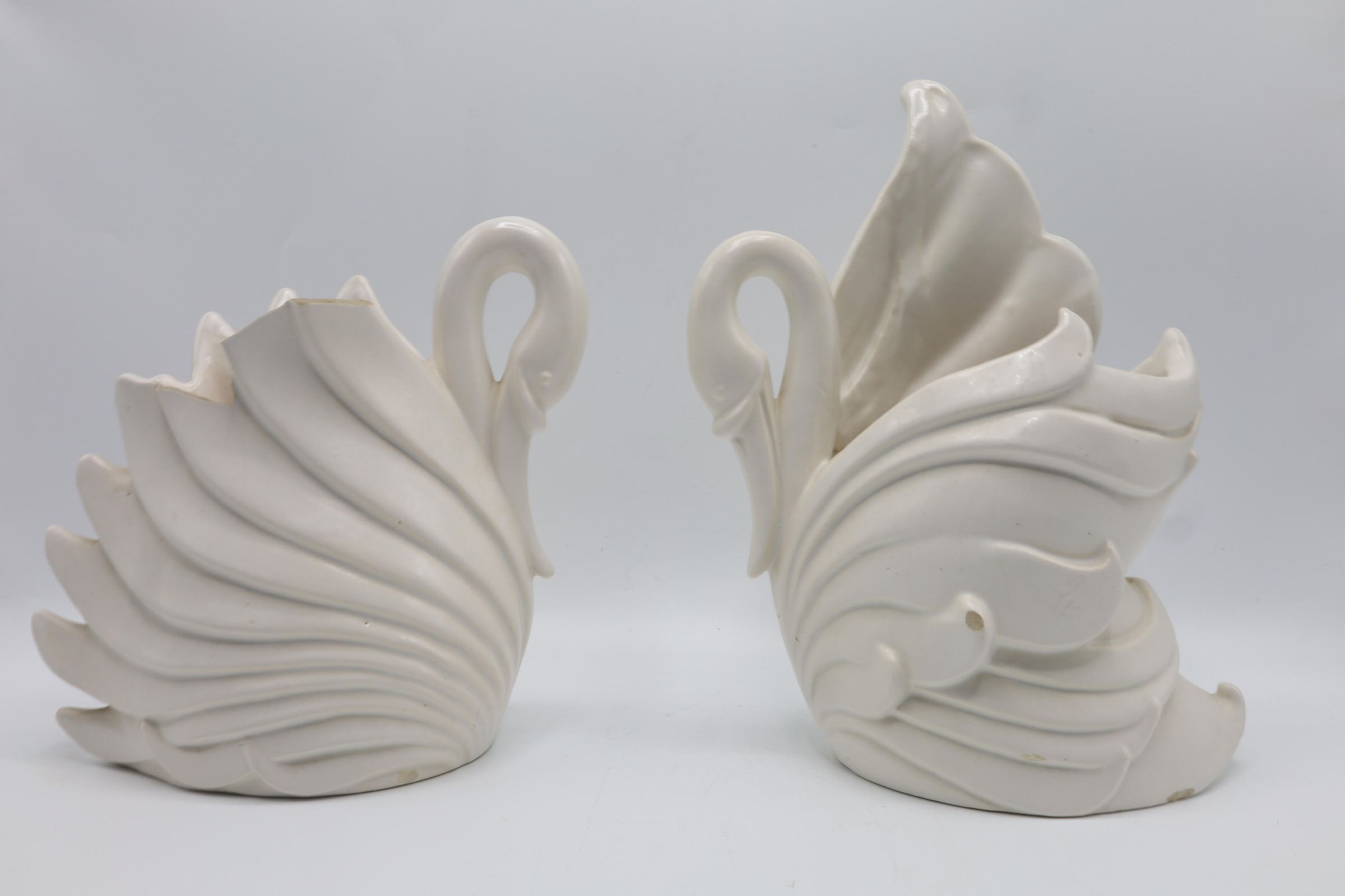 Haeger originally made bricks following the Chicago Fire. stylized waterfowl planters or vases, white glazed ceramic. One has damage on the back wing. Haeger U.S.A.