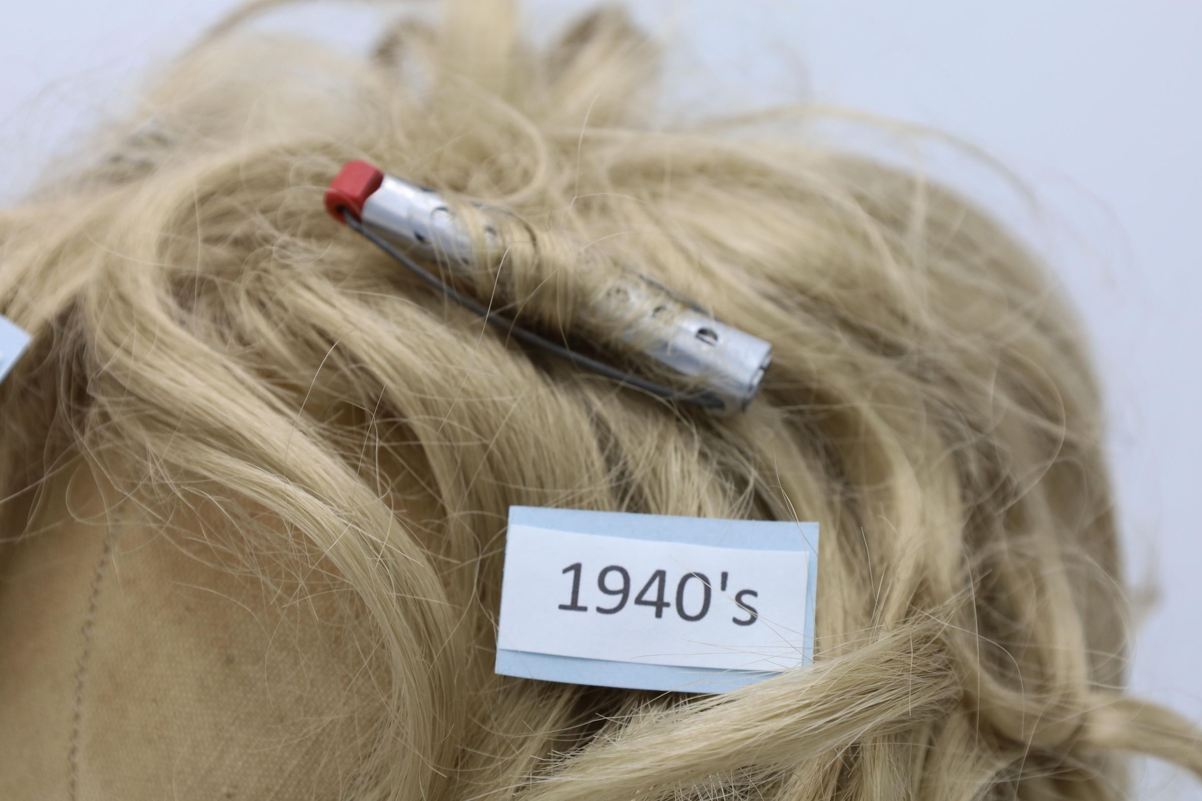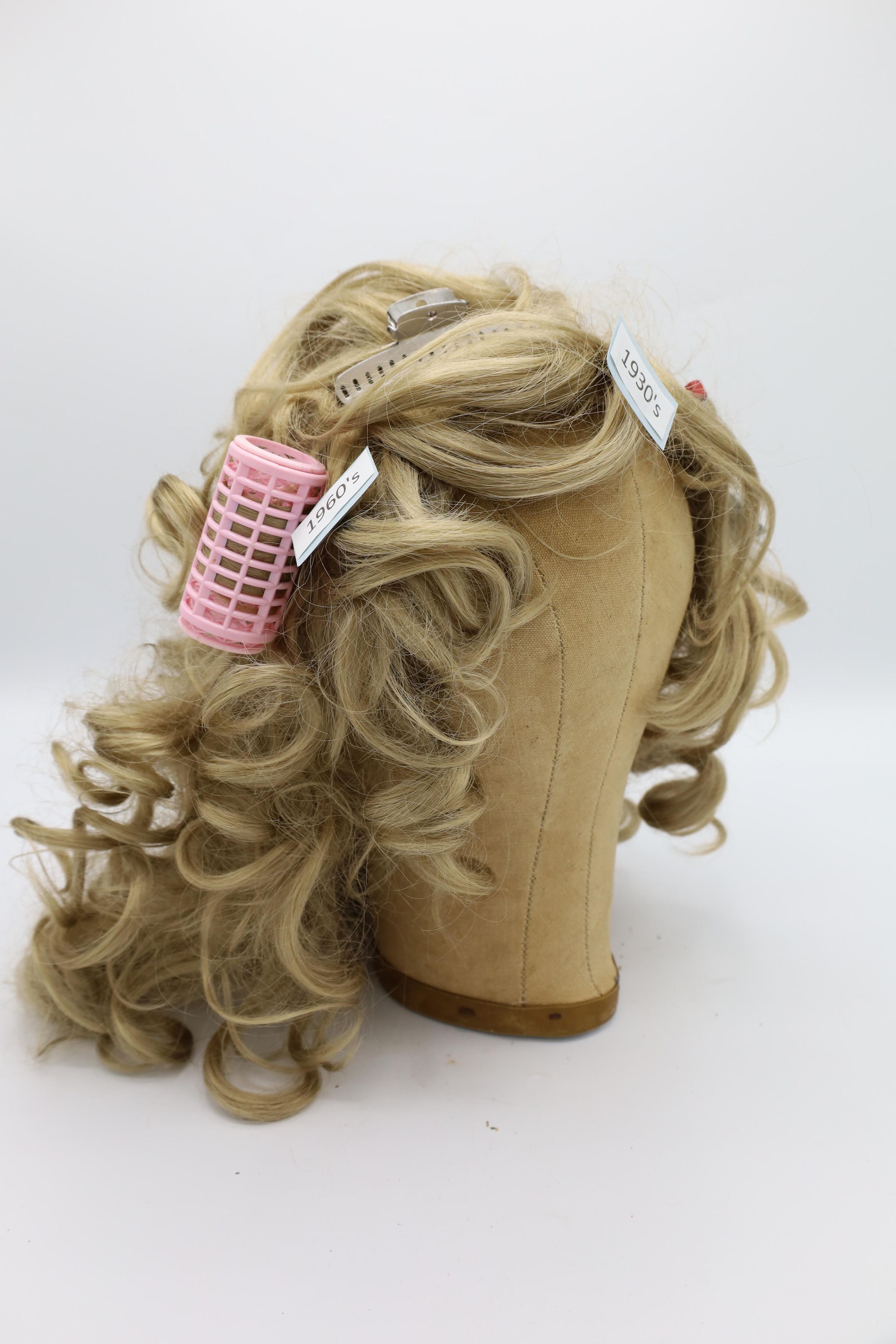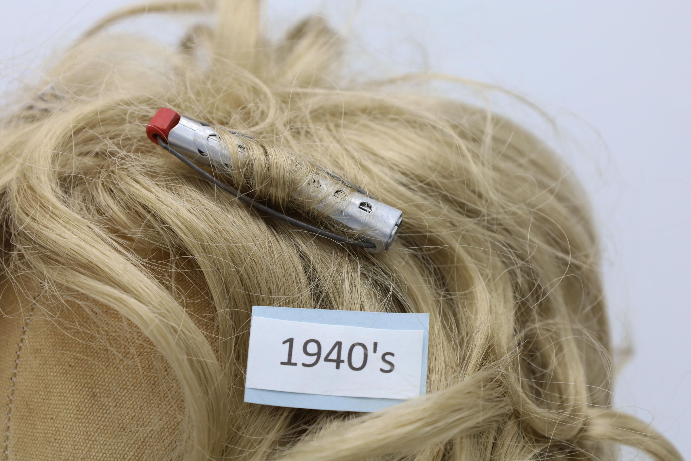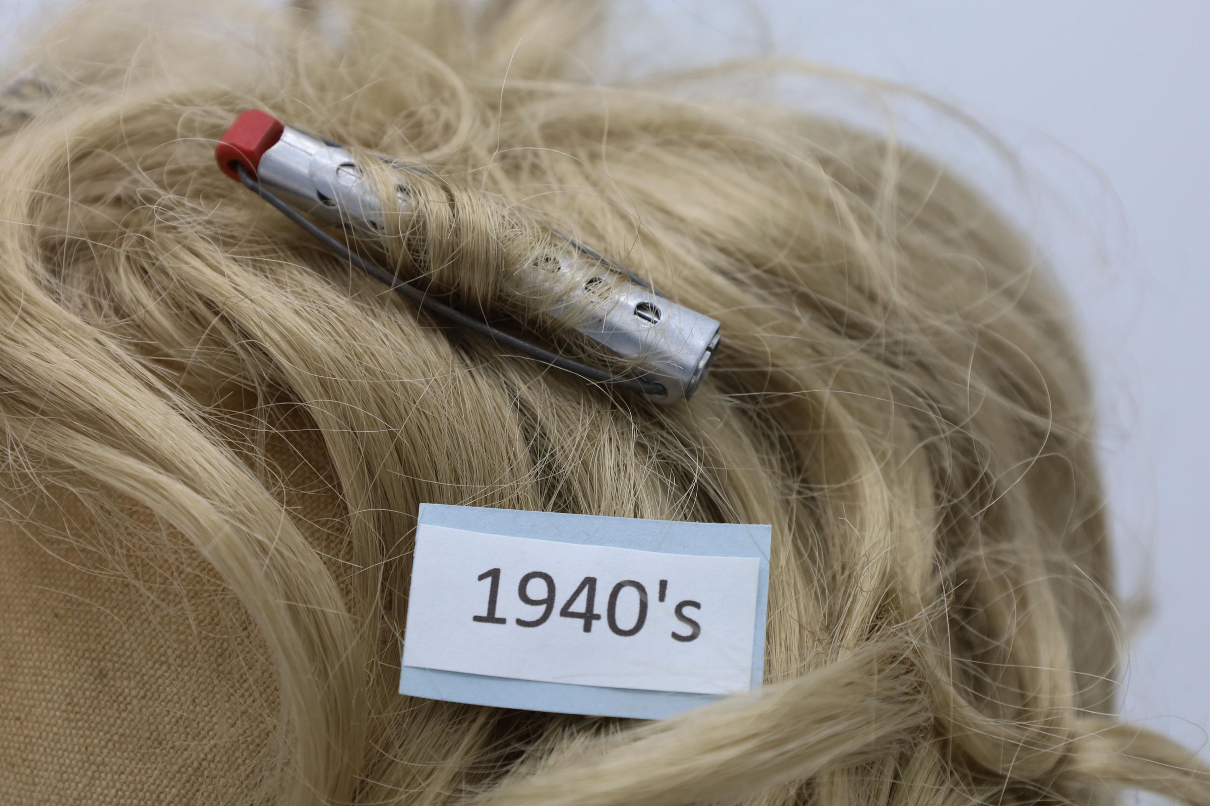This display depicts how women used curlers in three different time periods, the 1930s, the 1940s, and the 1960s. This wig is sitting on a cork canvas block head wig display.