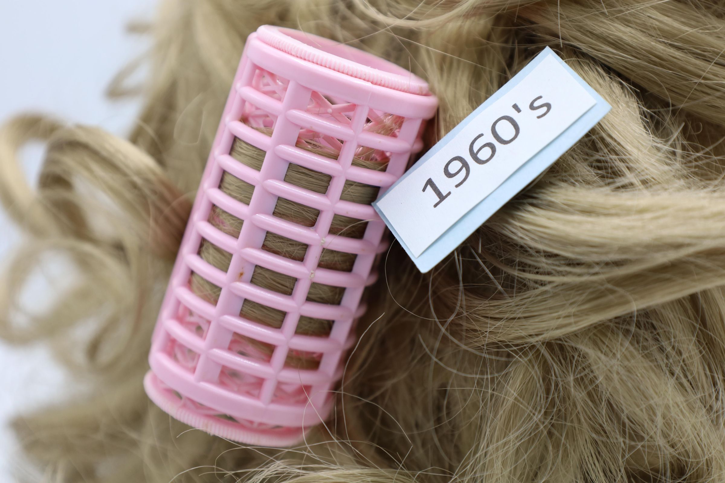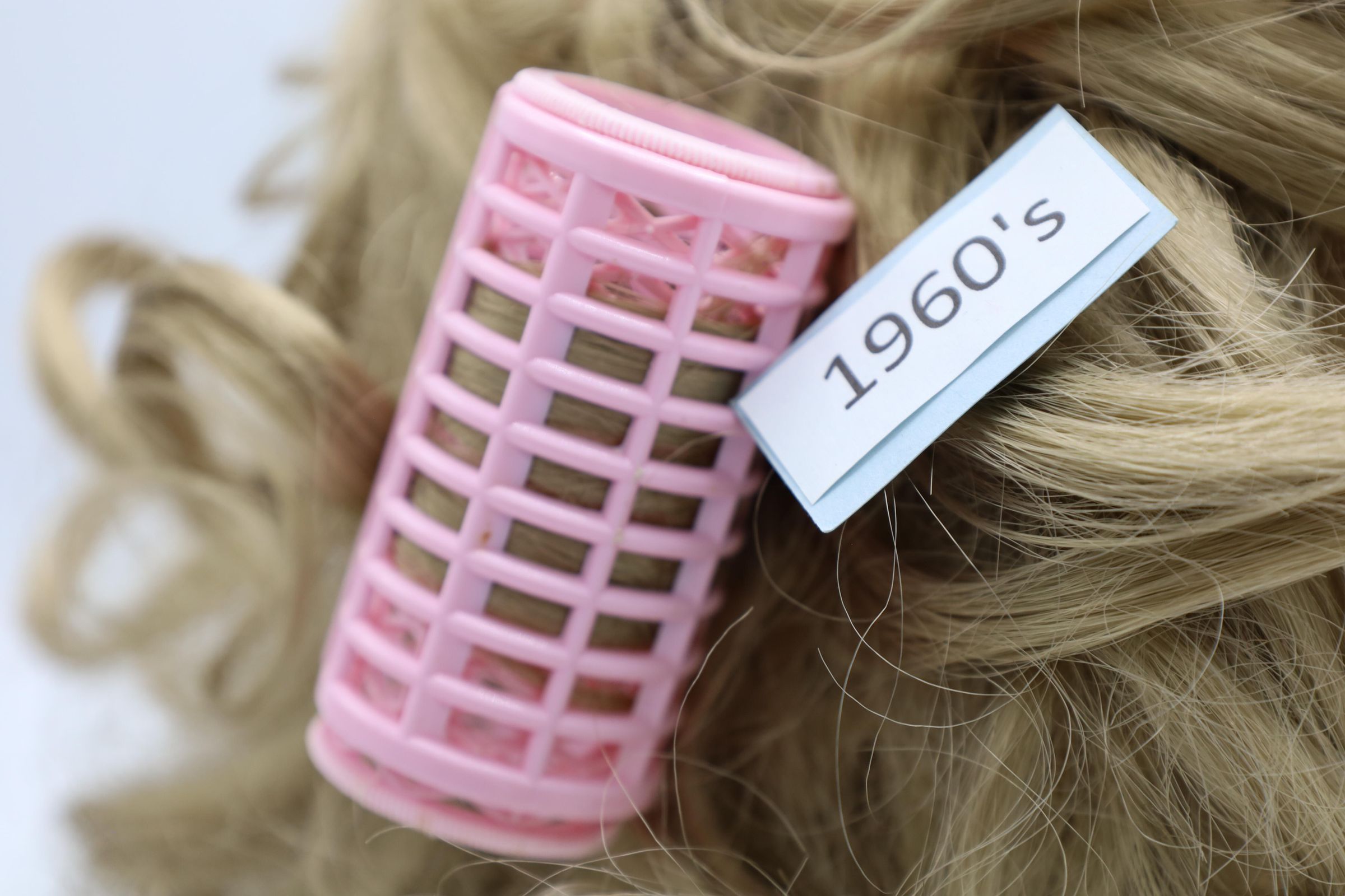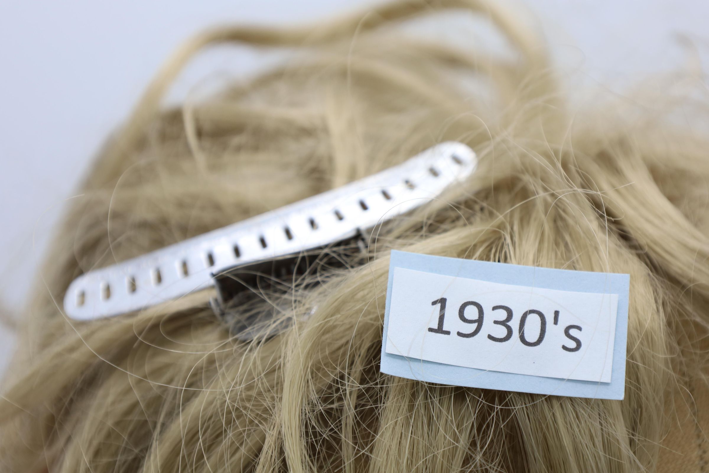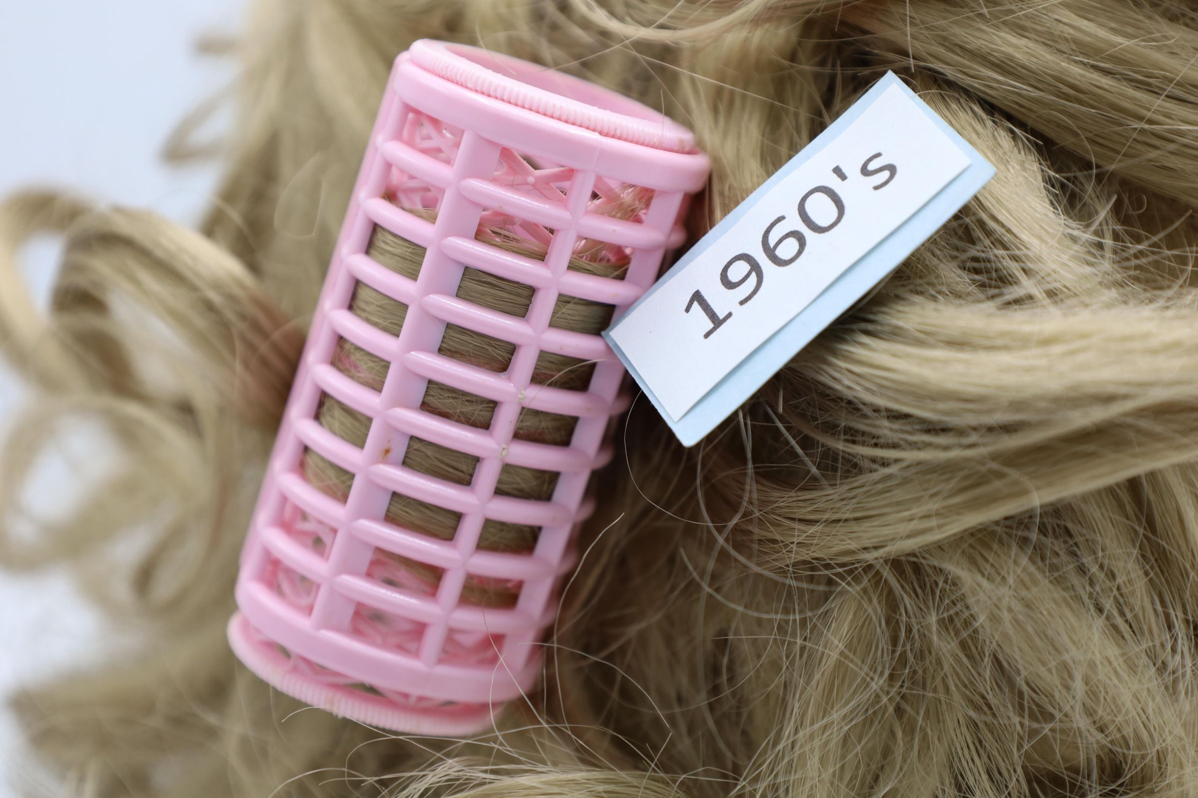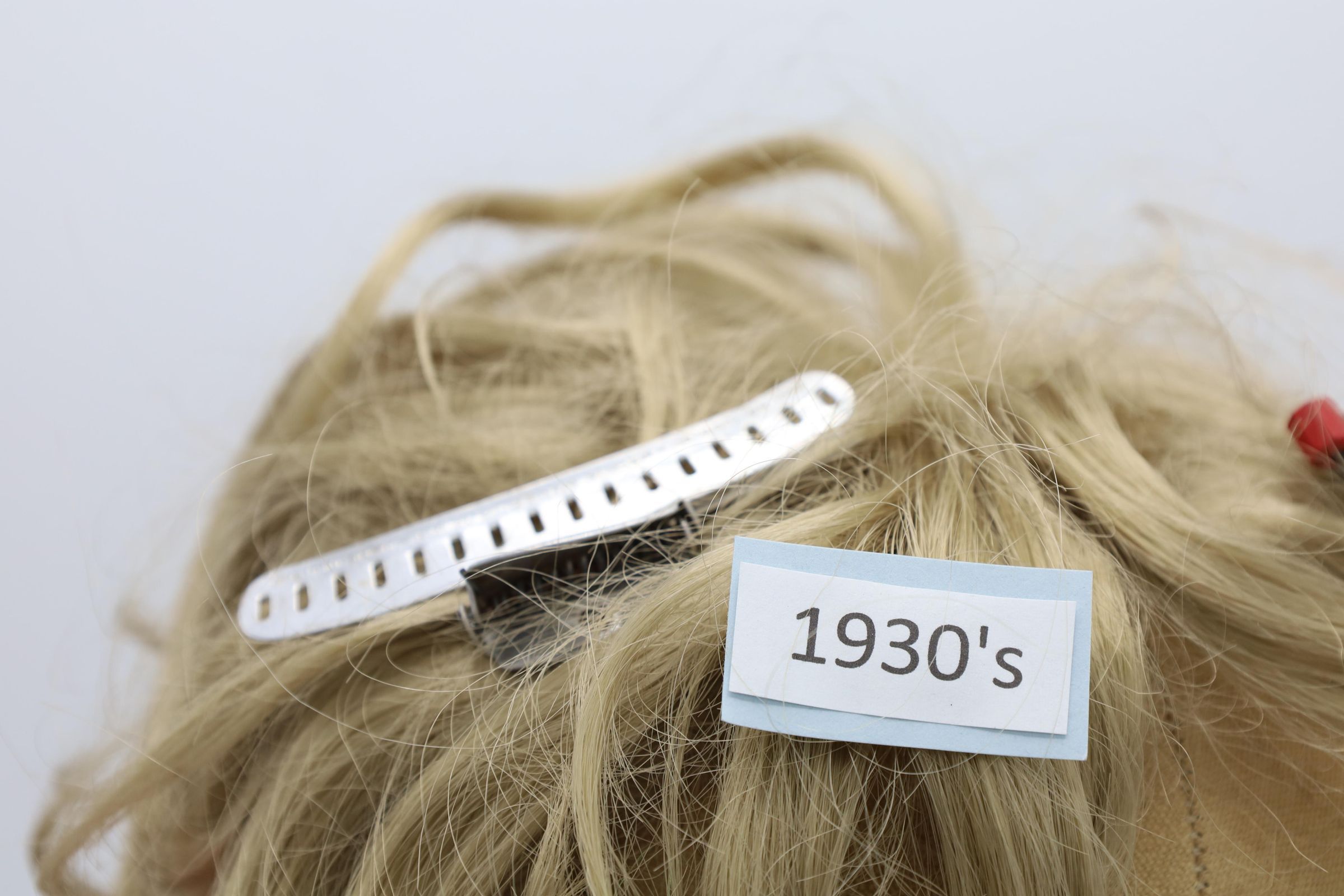 This display depicts how women used curlers in three different time periods, the 1930s, the 1940s, and the 1960s. This wig is sitting on a cork canvas block head wig display.