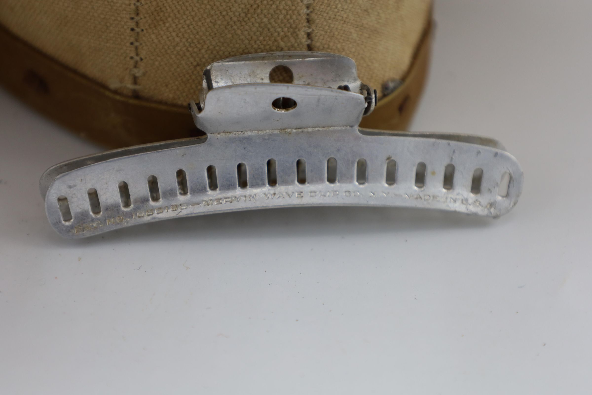 The 1930s example is a Mervin aluminum wave clip. This clip was advertised as being able to "pinch the ridges tightly and give your waves that professional look." The Mervin aluminum wave clips were ideal for setting permanents.