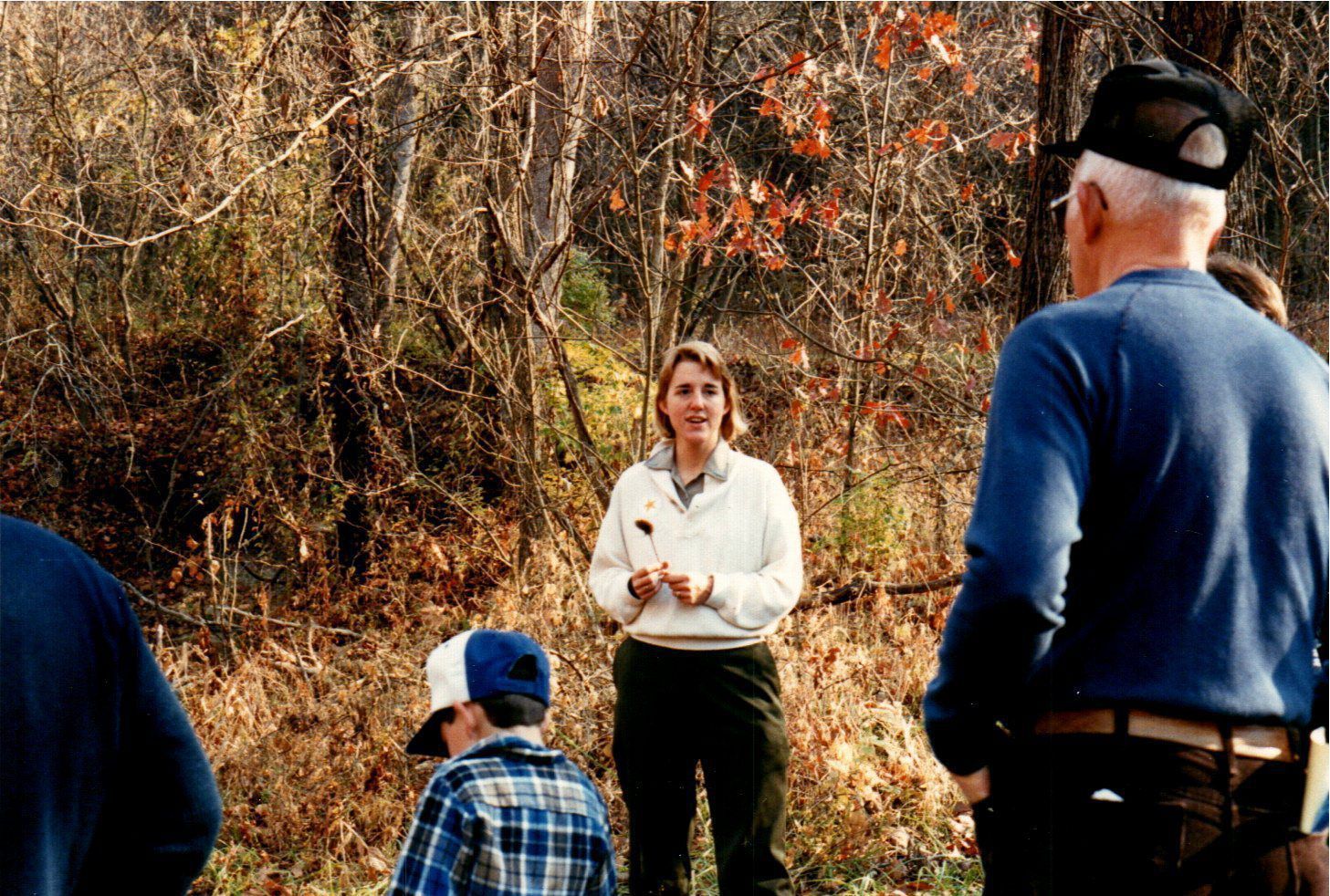 A park ranger holds a natural specimen while leading an interpretive program as part of East Fork State Park's 1987 Halloween Campout.