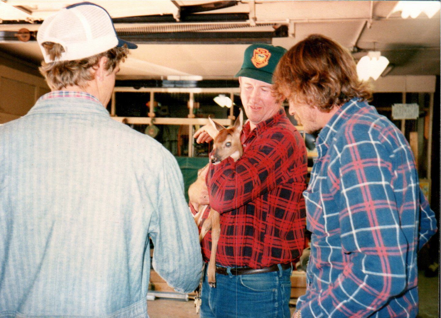 A member of Pike Lake State Park's staff carefully holds a fawn. Other staff members move in to look at the cute creature.