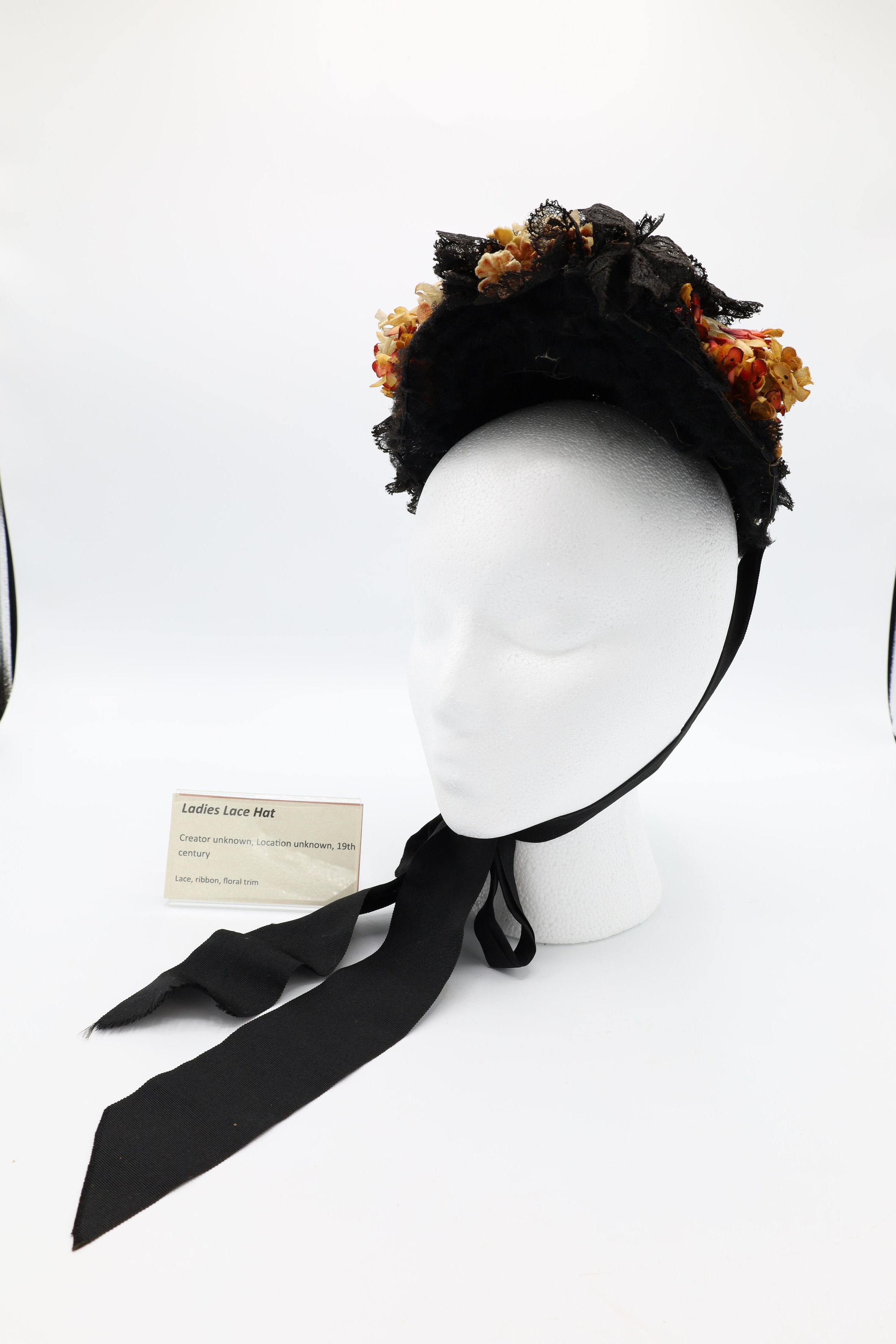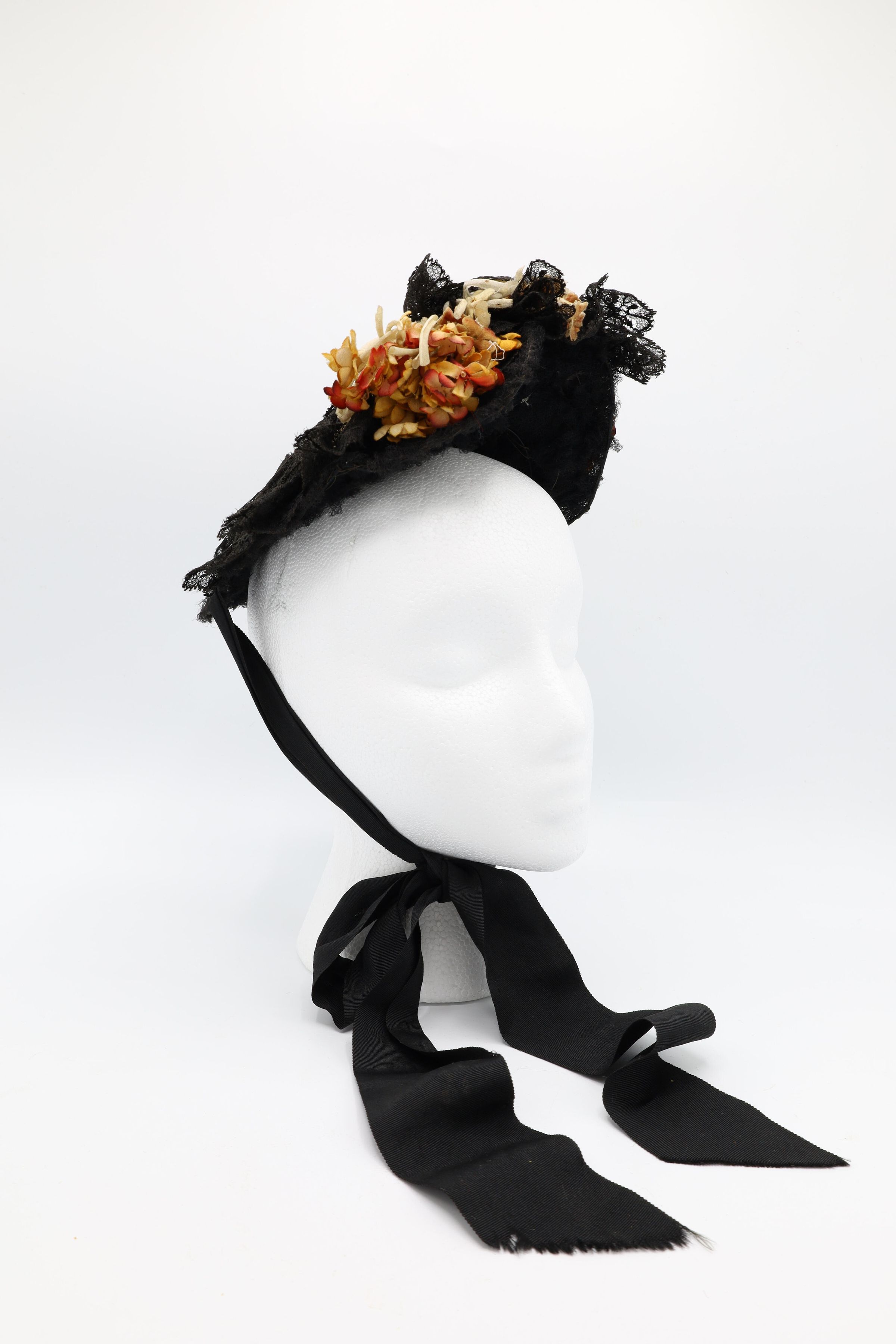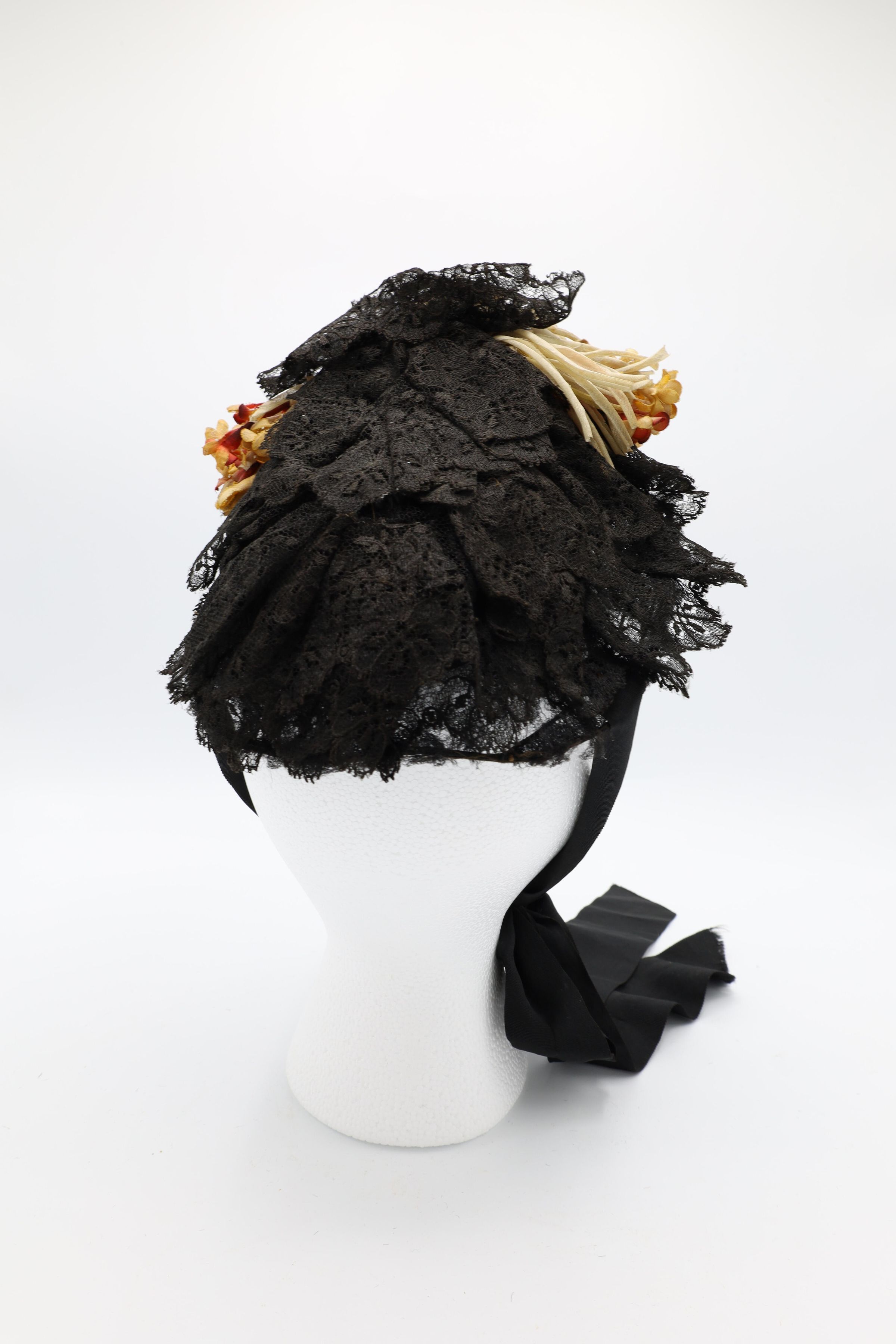 19th century women's lace hat. The hat is made of layered black lace and adorned with pink and yellow flowers. Black ribbons are fastened to both sides of the hat for the wearer to tie under her chin.Location