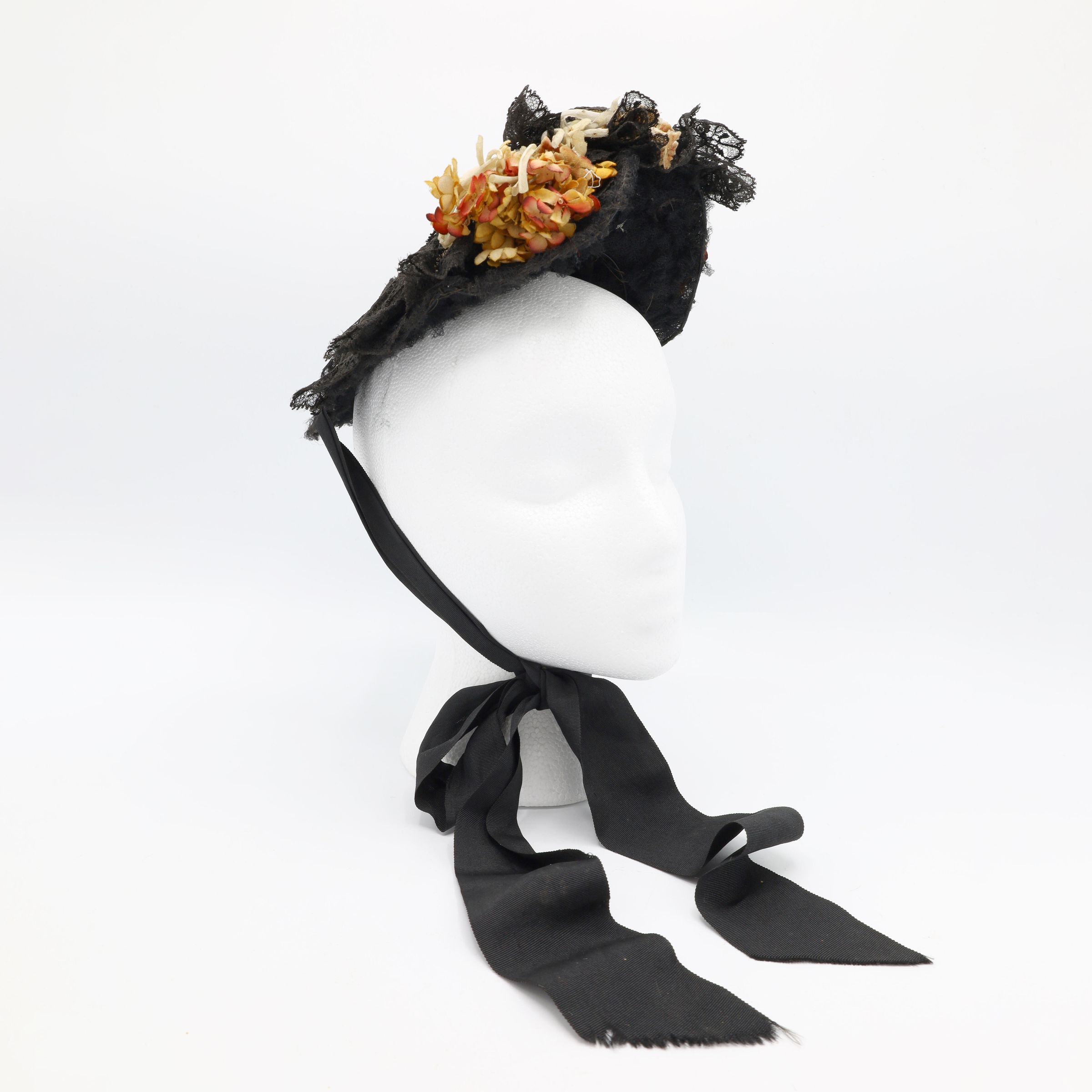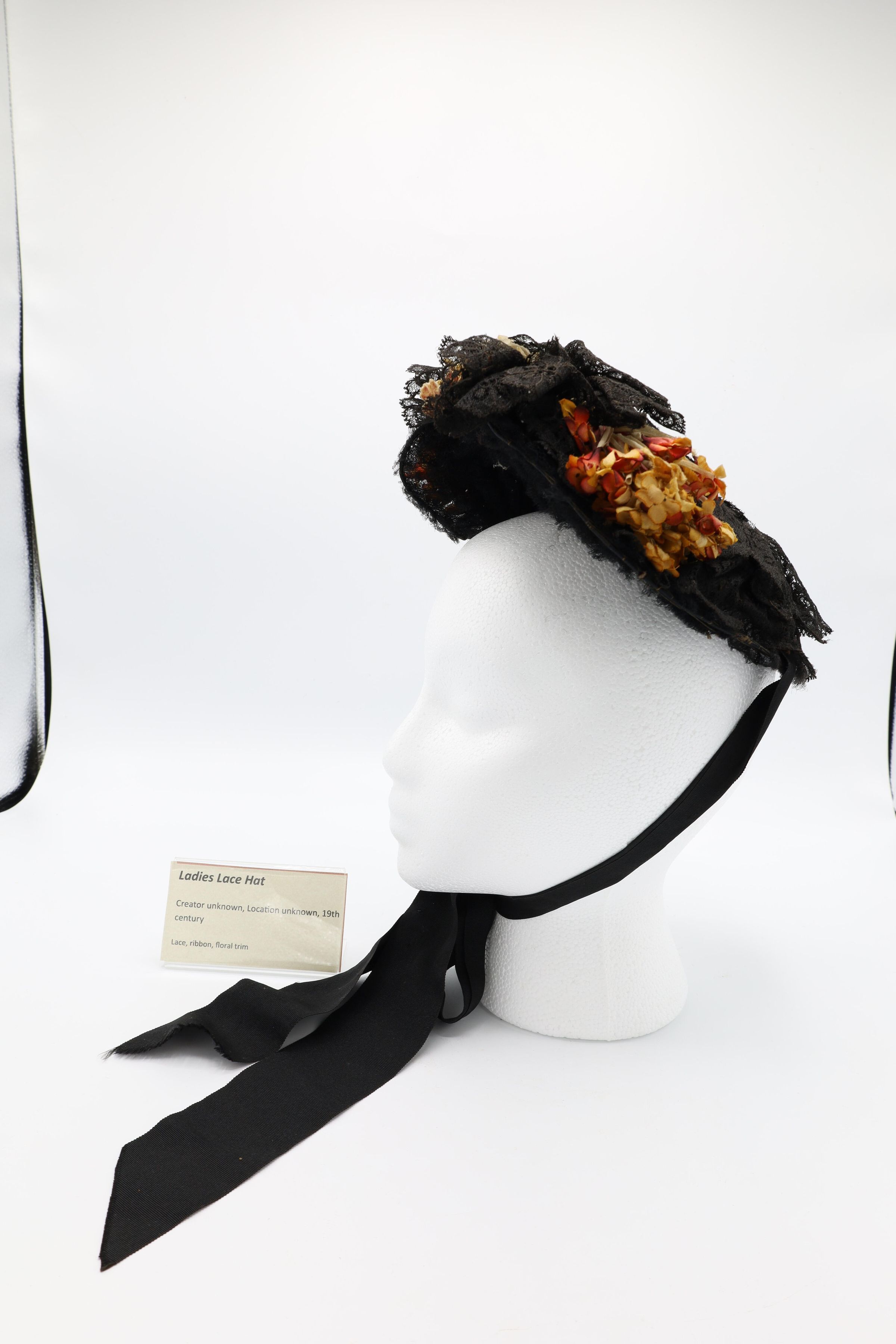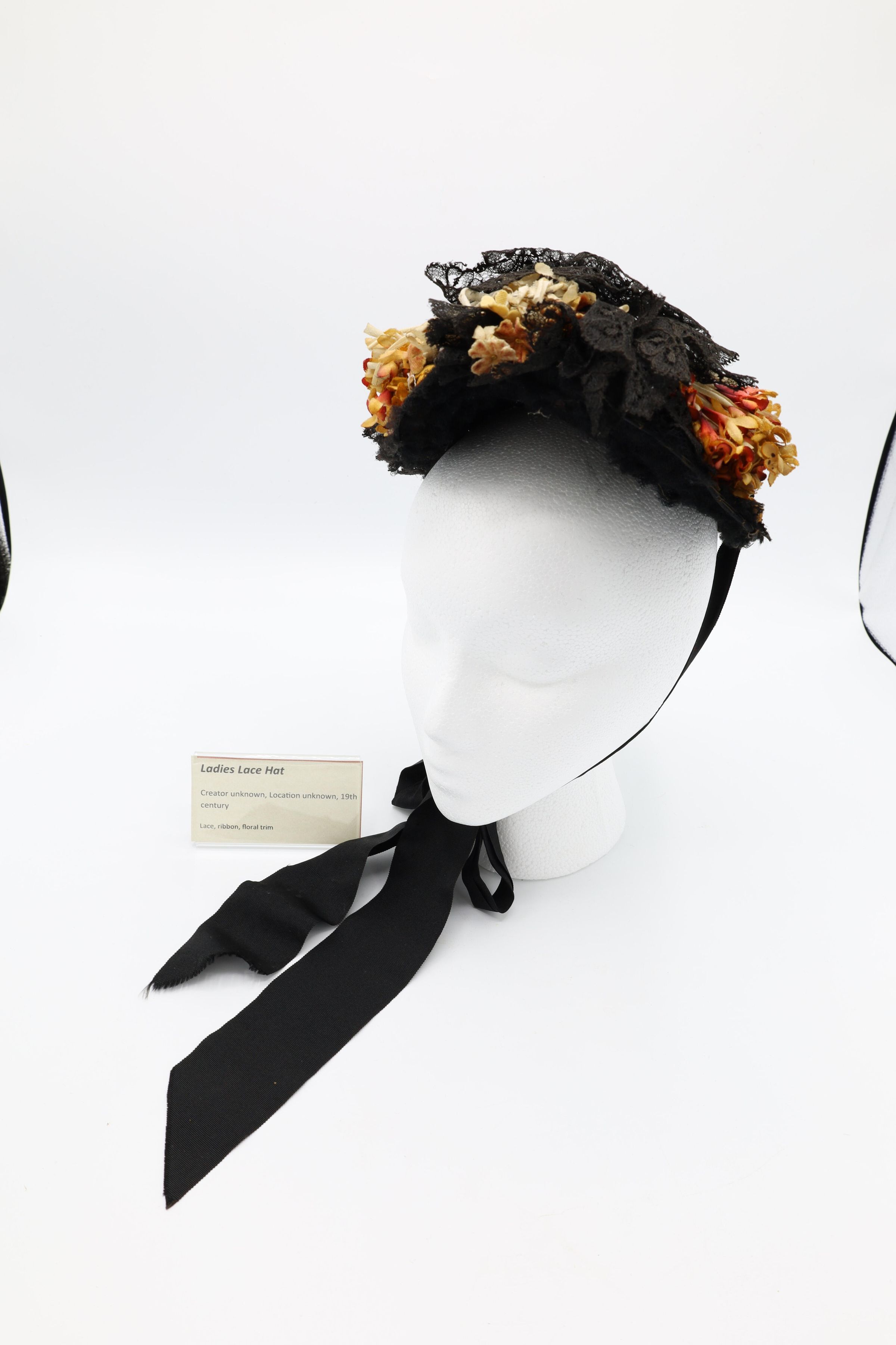 19th century women's lace hat. The hat is made of layered black lace and adorned with pink and yellow flowers. Black ribbons are fastened to both sides of the hat for the wearer to tie under her chin.Location