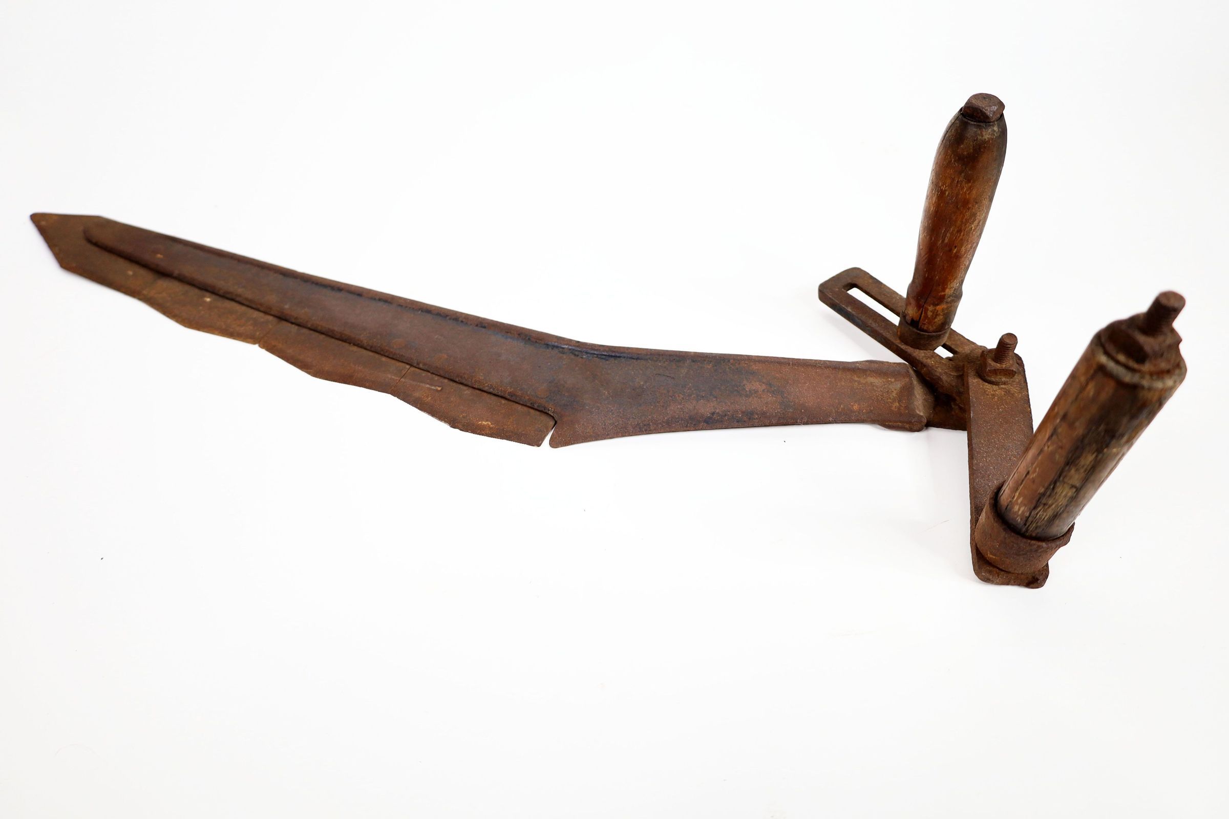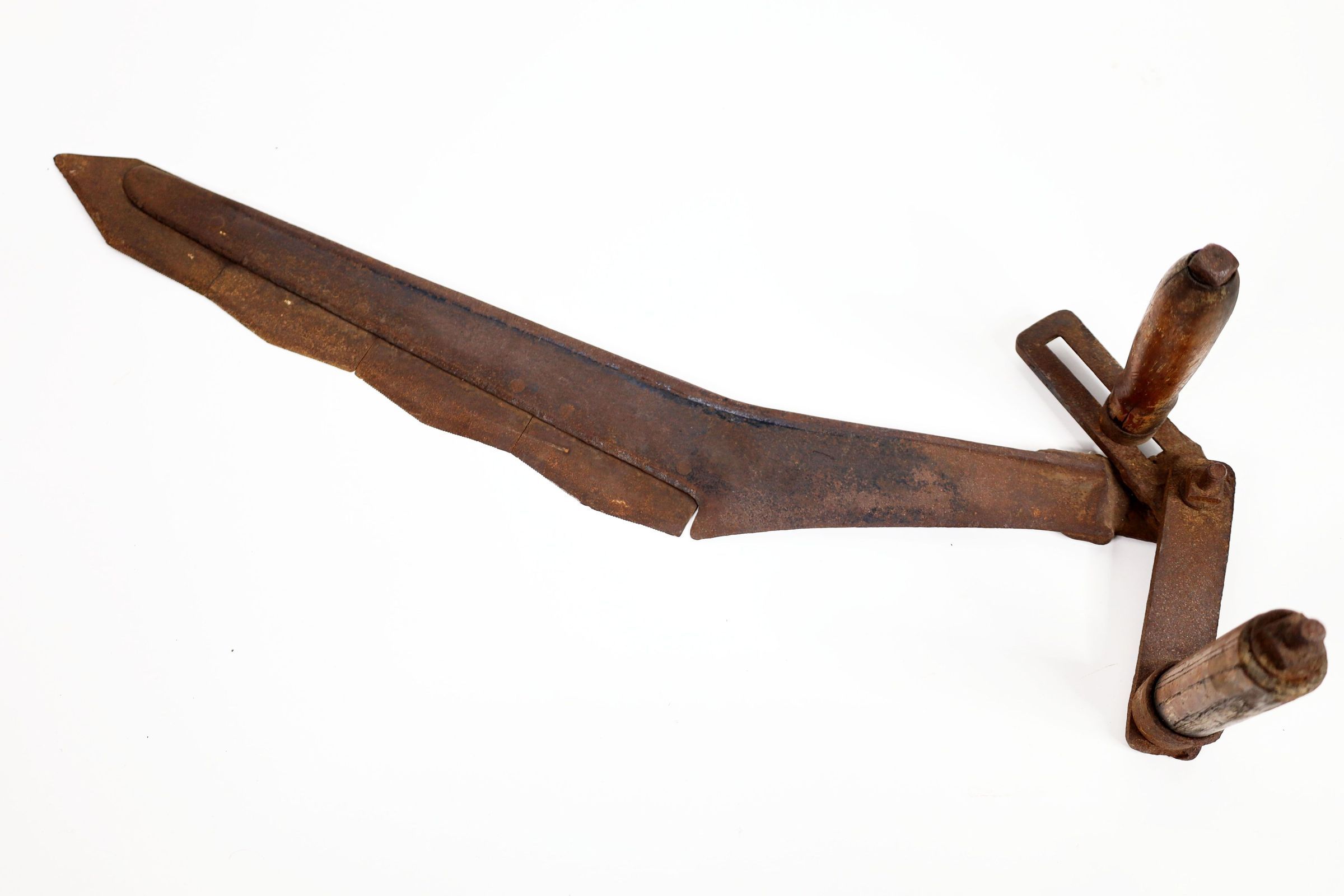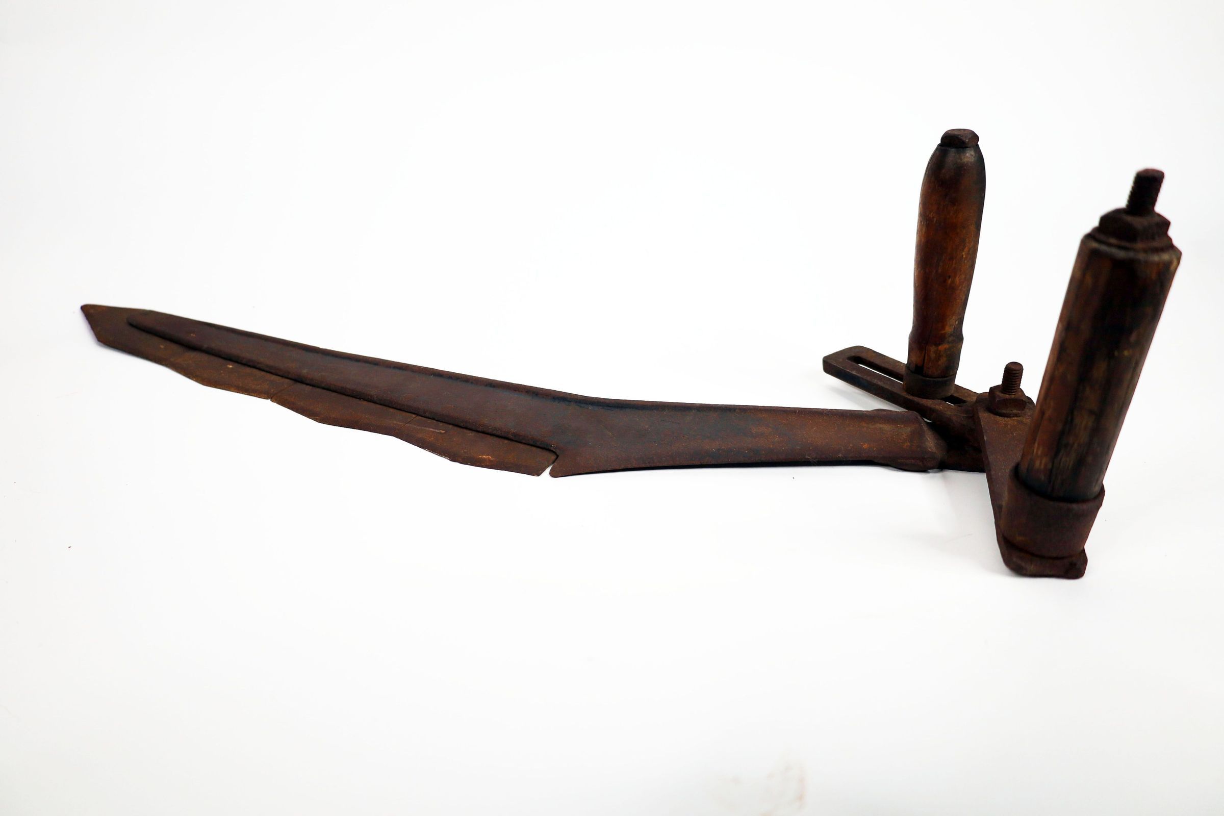 A hay knife is used to cut manageable portions of hay from a larger stack, which is especially necessary after the hay has been compacted and settled over time. The long, serrated blade was used to saw off sections of compacted hay. It typically has two handles, allowing the user to apply force with both hands. The second handle is often adjustable to allow for a comfortable grip.