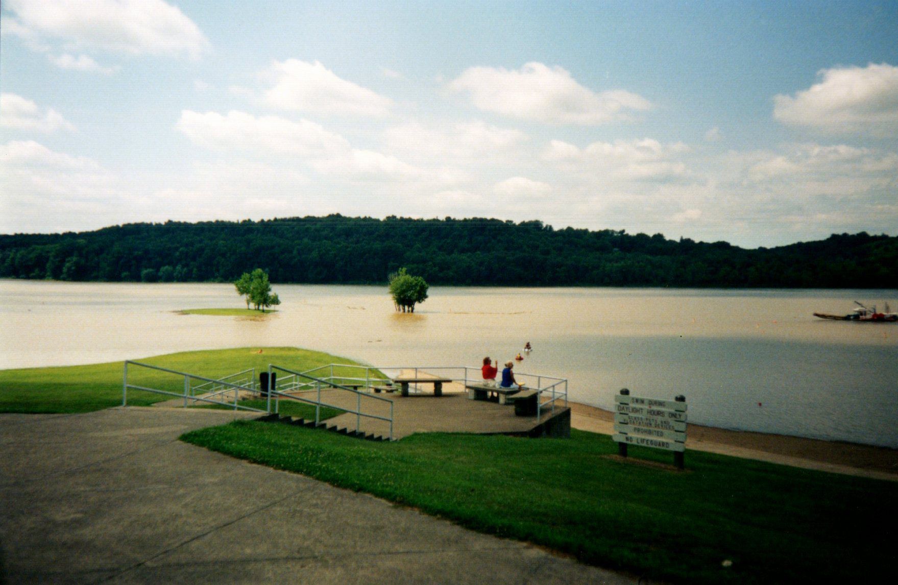 Spring rains have raised the water level at Dillon State Park's beach. In the center left of the photograph, a small grove of trees and portion of the park's lawn have been submerged by high water levels. Two parkgoers sit on a bench looking out onto the lake. A dredge boat removes silt and sand from the lakebed at this photograph's extreme right.