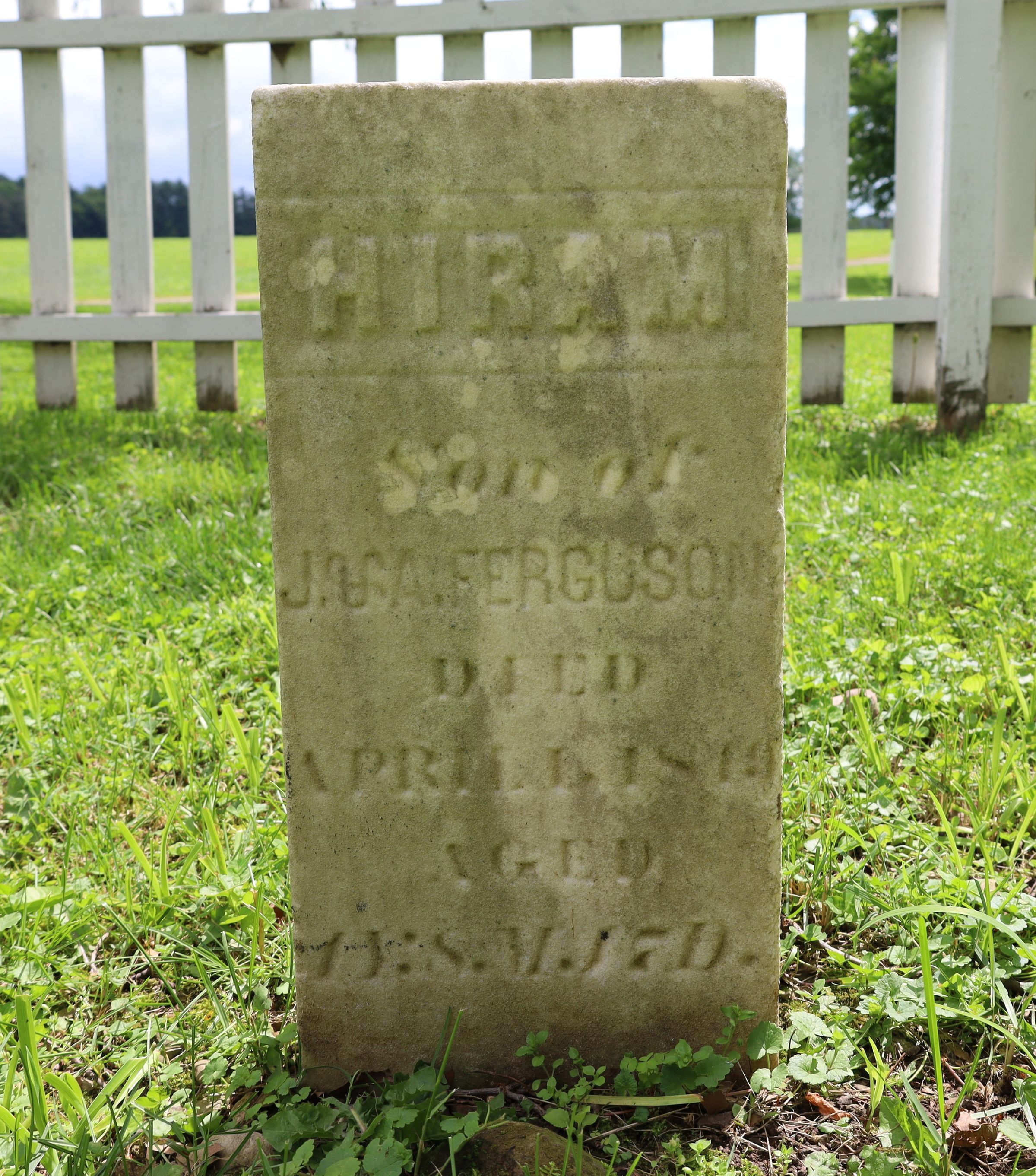 Hiram died on April 1, 1849, at age 1 year, 8 months, and 17 days old. Hiram's sister Gemima died 11 months earlier on May 27th, 1848, at age 1 year, 4 months, and 9 days.