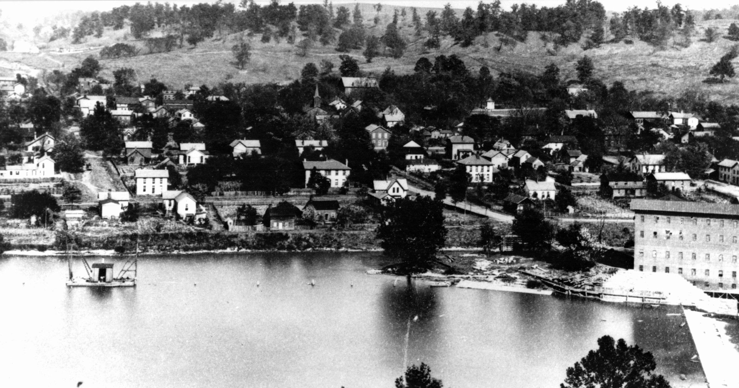 This photograph depicts the town of McConnelsville around the turn of the century. McConnelsville is Morgan County's seat and prospered due to its advantageous position along the Muskingum River. The Muskingum River is in the foreground of this photograph. The large building located at the photograph's extreme right was the Elk Eye Mill.