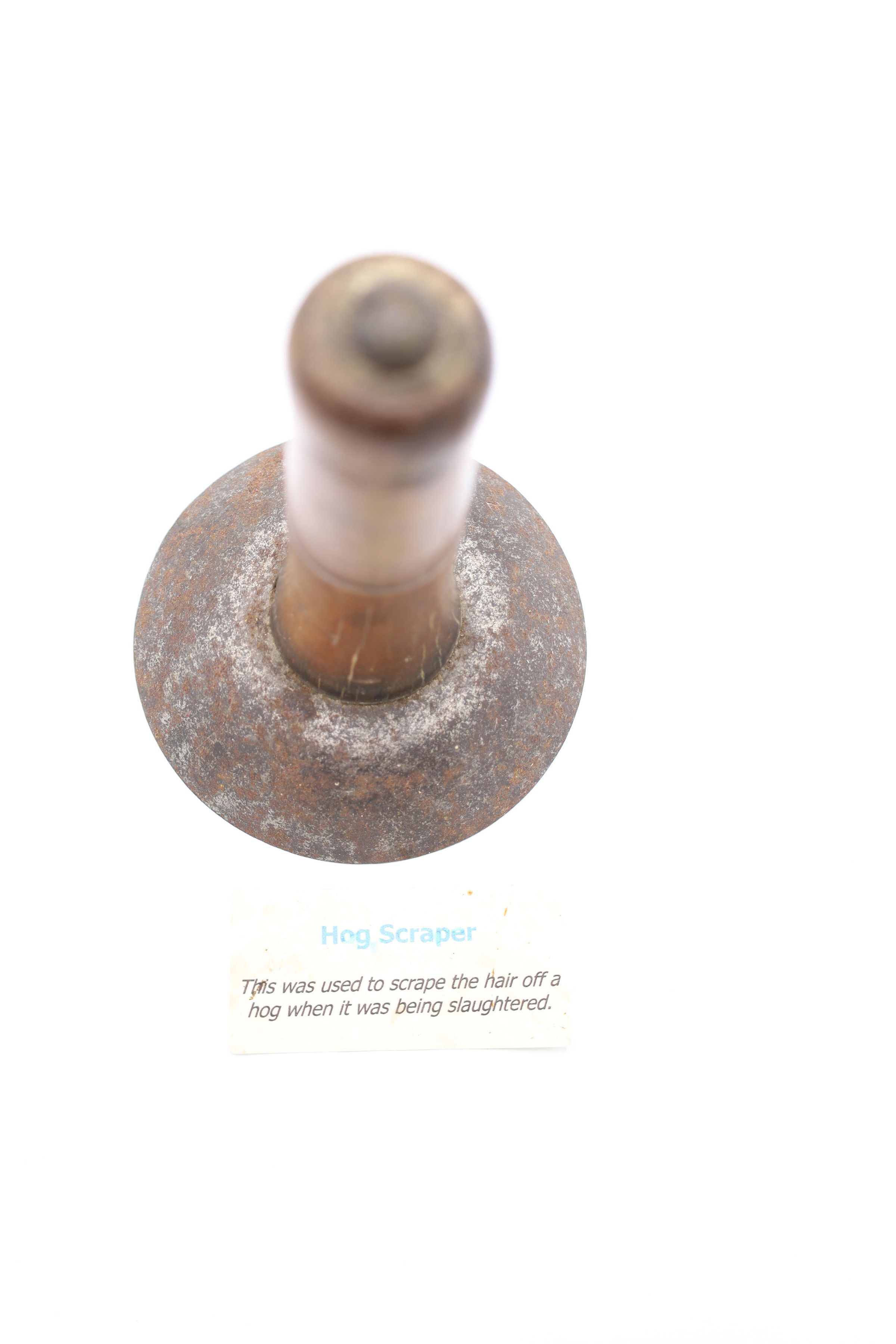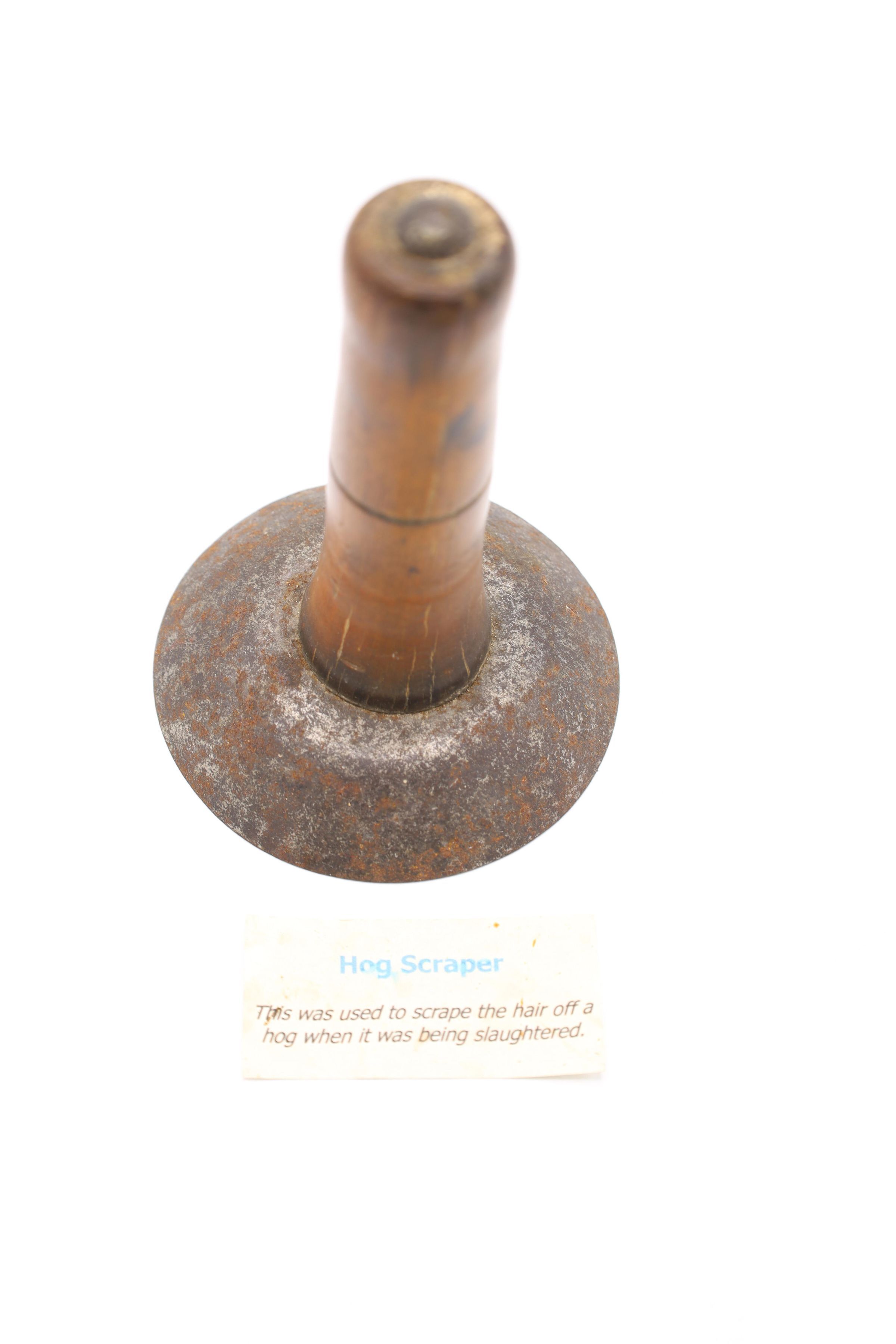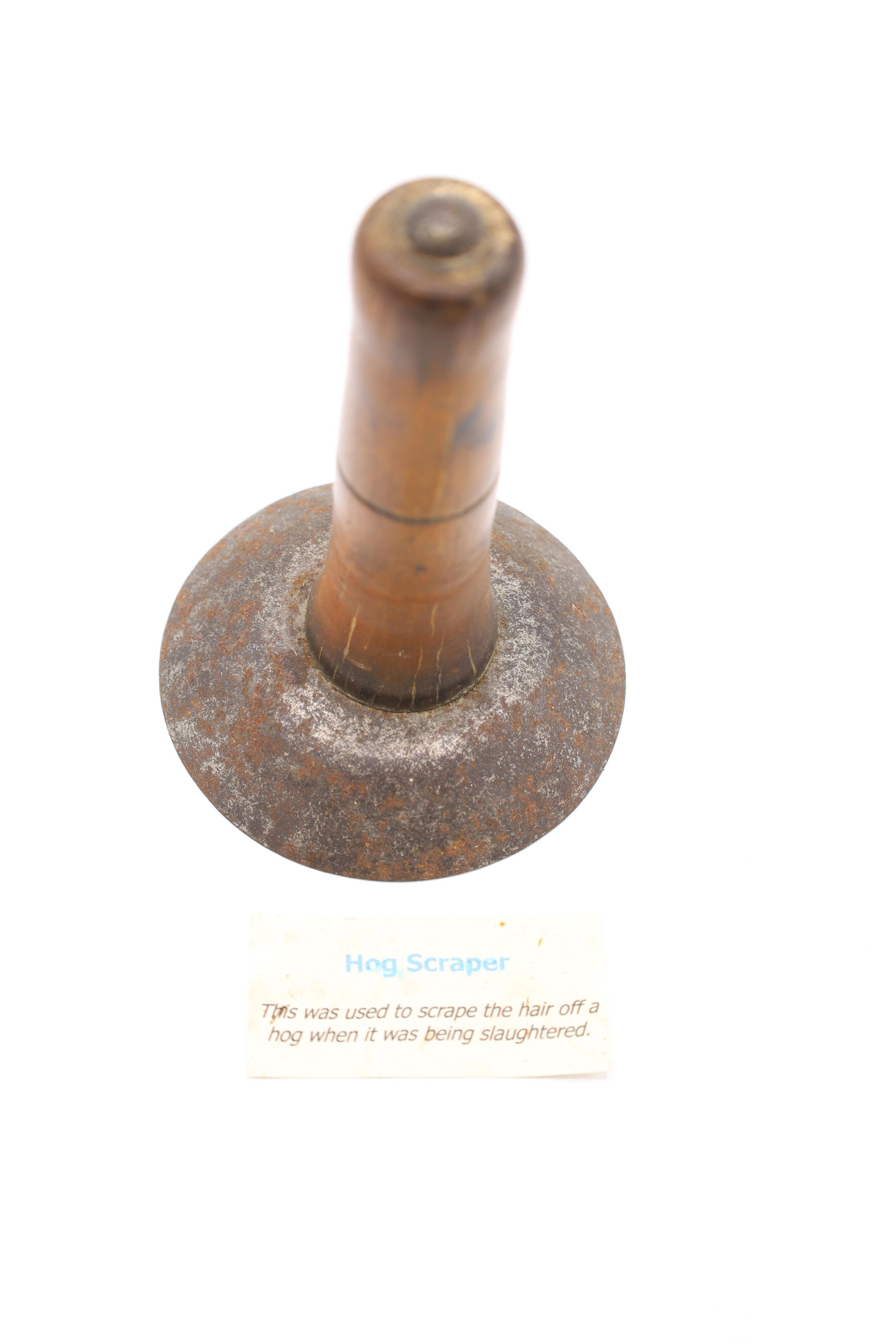 Likely dating back to the nineteenth or early twentieth century, this wood and metal hog scraper was used to remove hair from the hog's hide after it was slaughtered and immersed in hot water to loosen the hairs. Similar hog scrapers are still in use today.Location