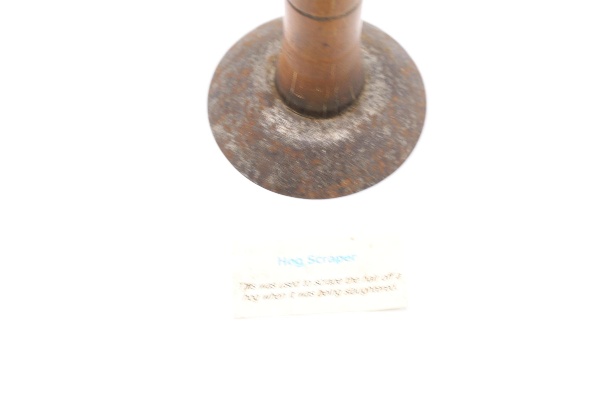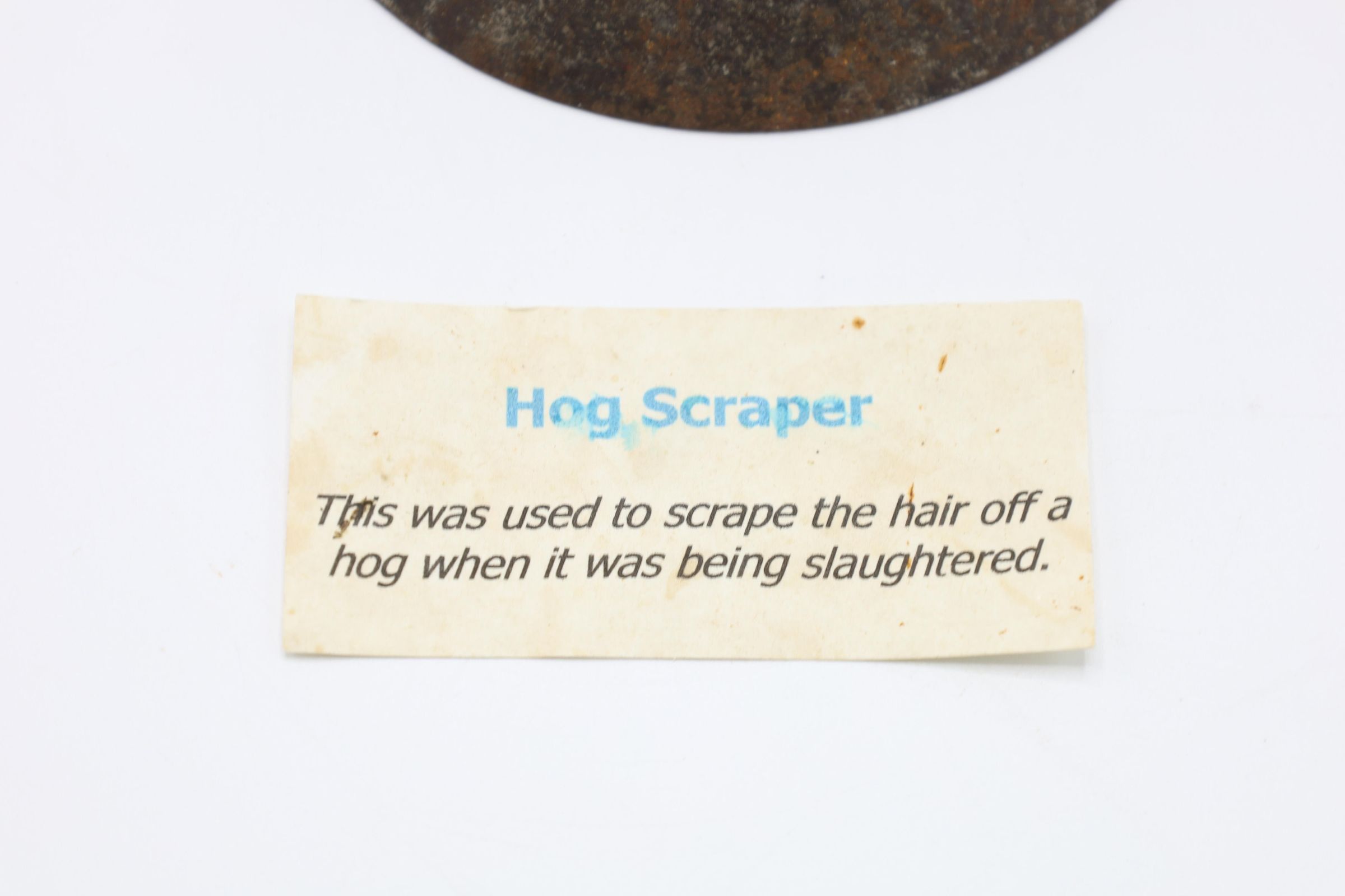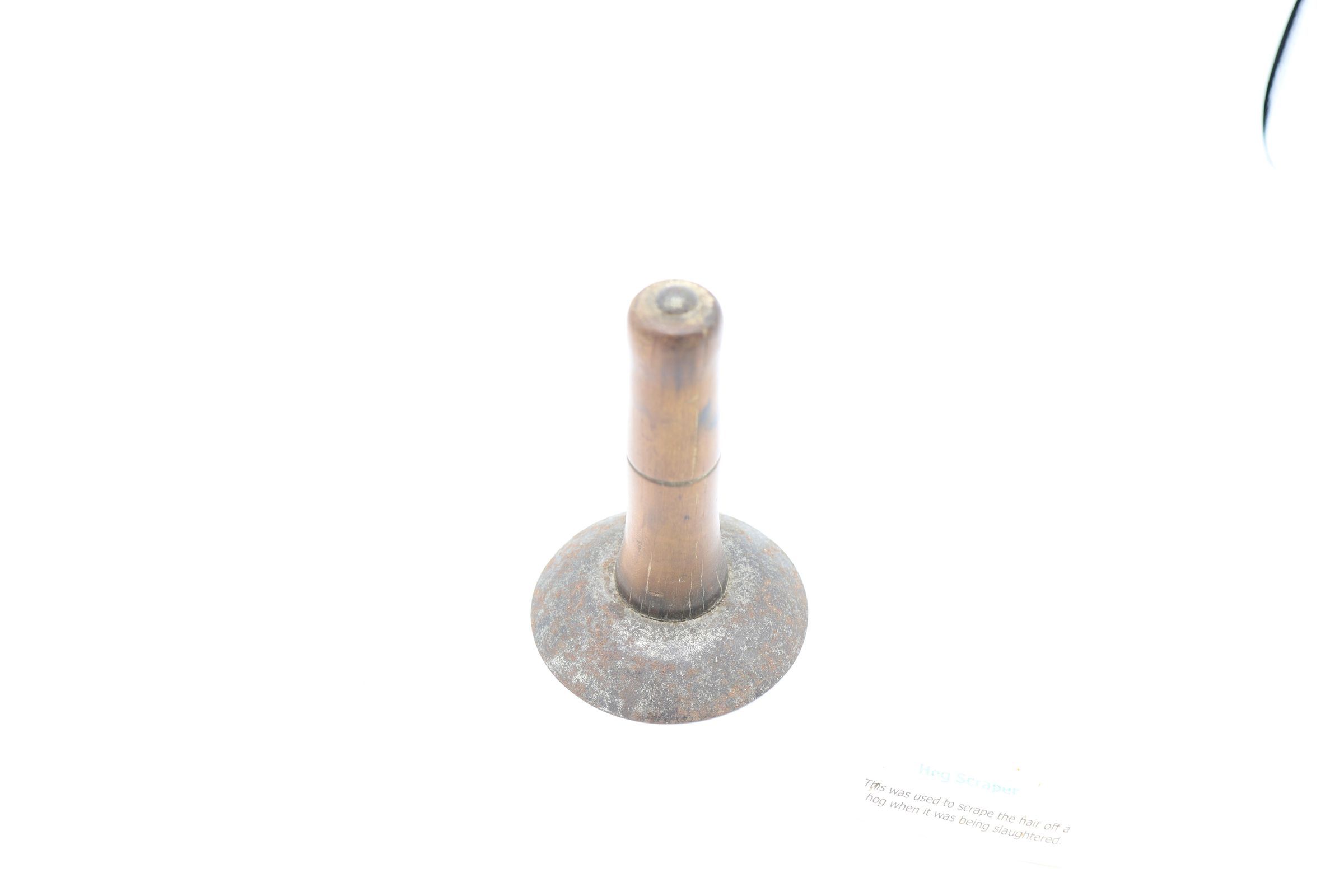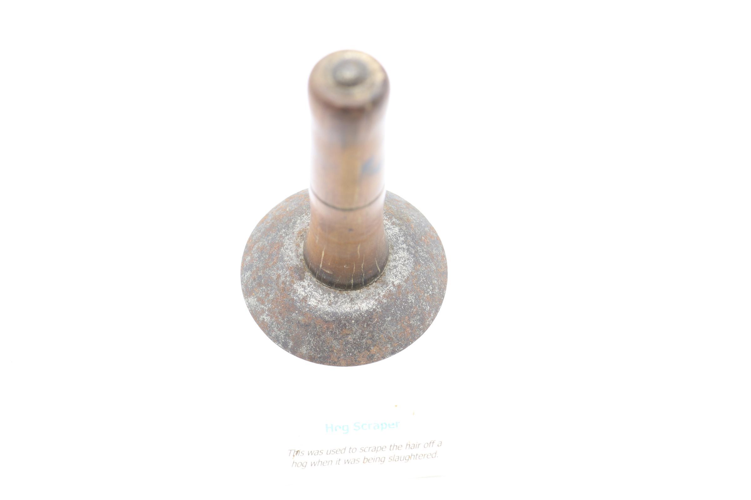 Likely dating back to the nineteenth or early twentieth century, this wood and metal hog scraper was used to remove hair from the hog's hide after it was slaughtered and immersed in hot water to loosen the hairs. Similar hog scrapers are still in use today.Location