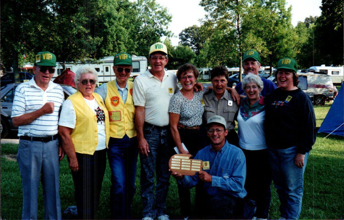 A group of Indian Lake State Park "VIP" volunteers gather to honor Jean Groves (second from left in grey shirt). Jean was a long-time camper host at Indian Lake State Park. She passed away in 2023.Cataloged By