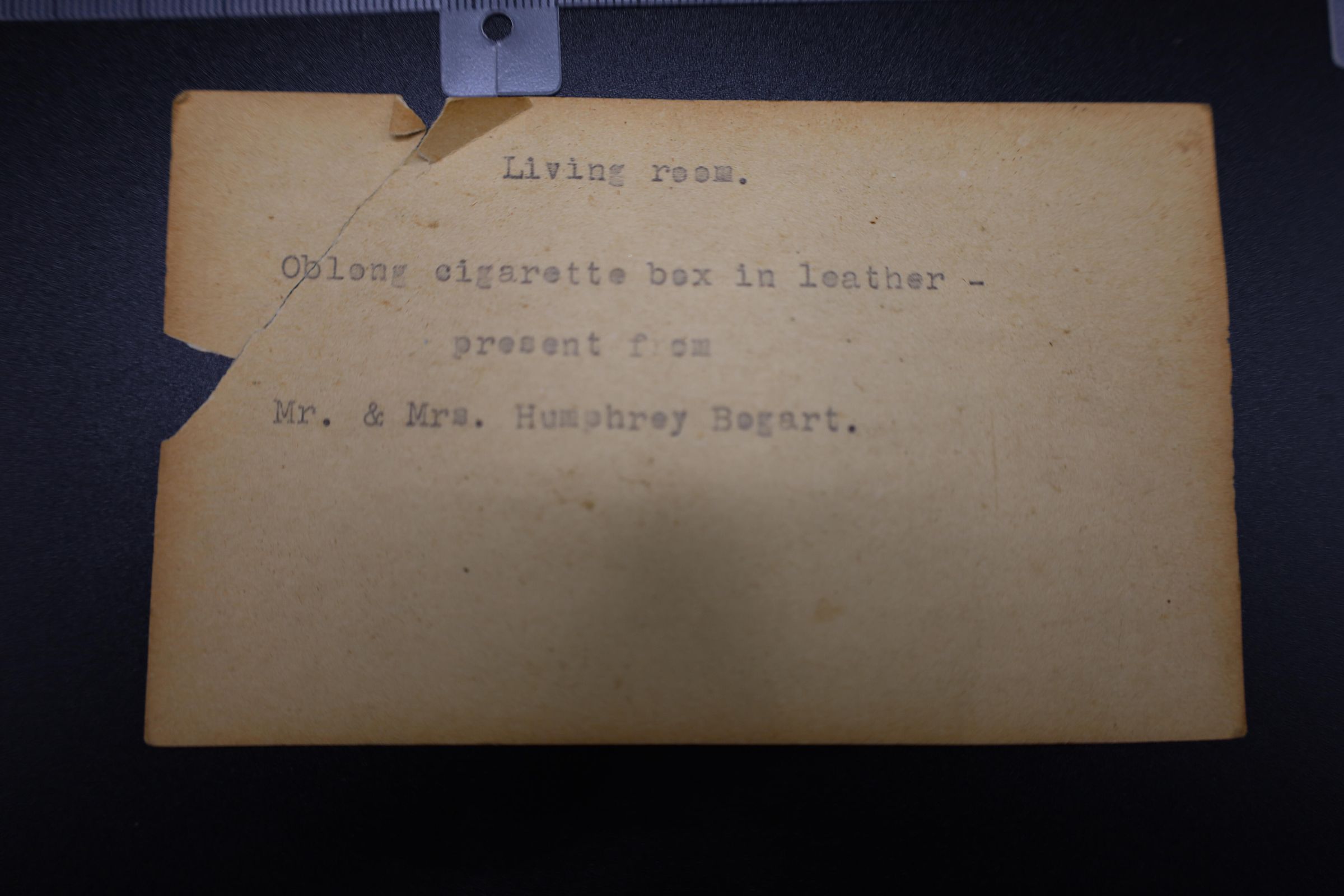 Leather humidor was gifted to the Bromfields by Humphrey Bogart during his wedding to Lauren Bacall on May 21, 1945. Louis Bromfield was the best man at the wedding.Location