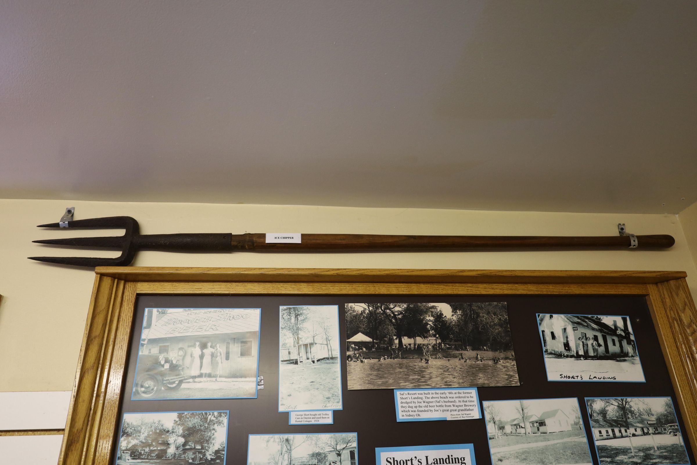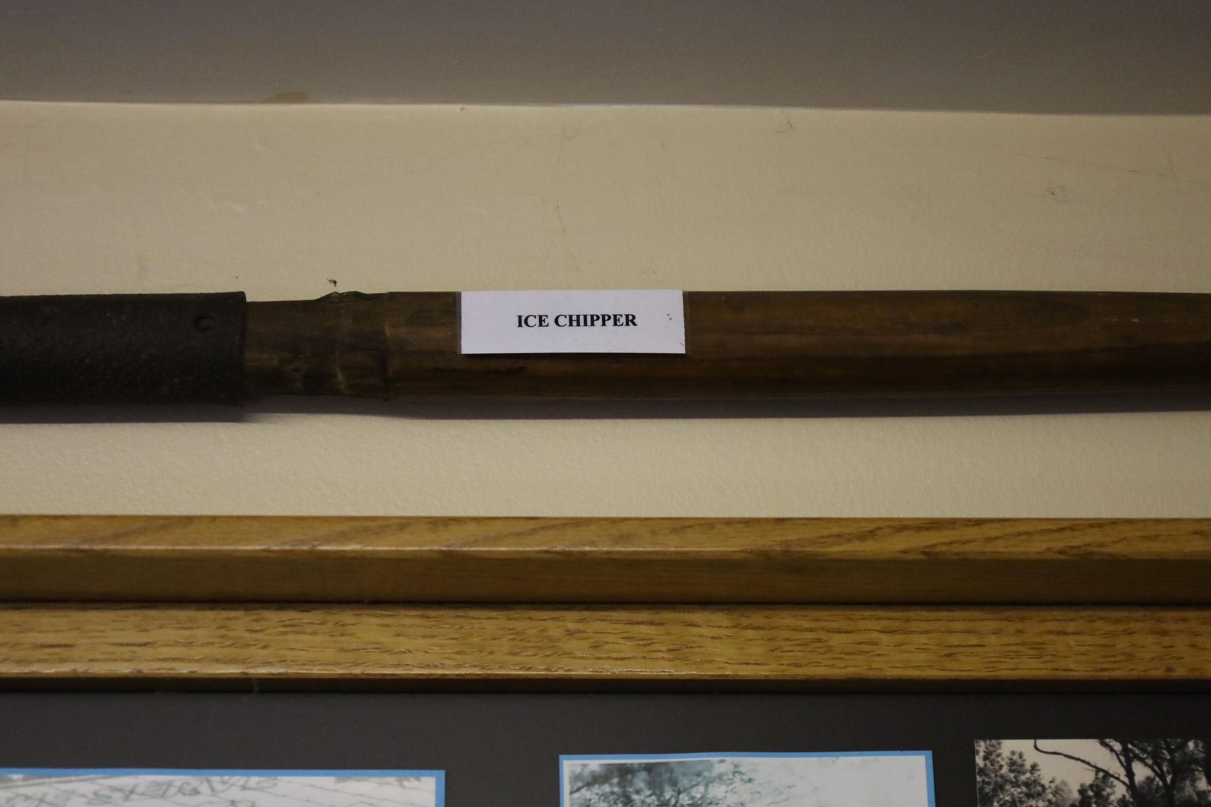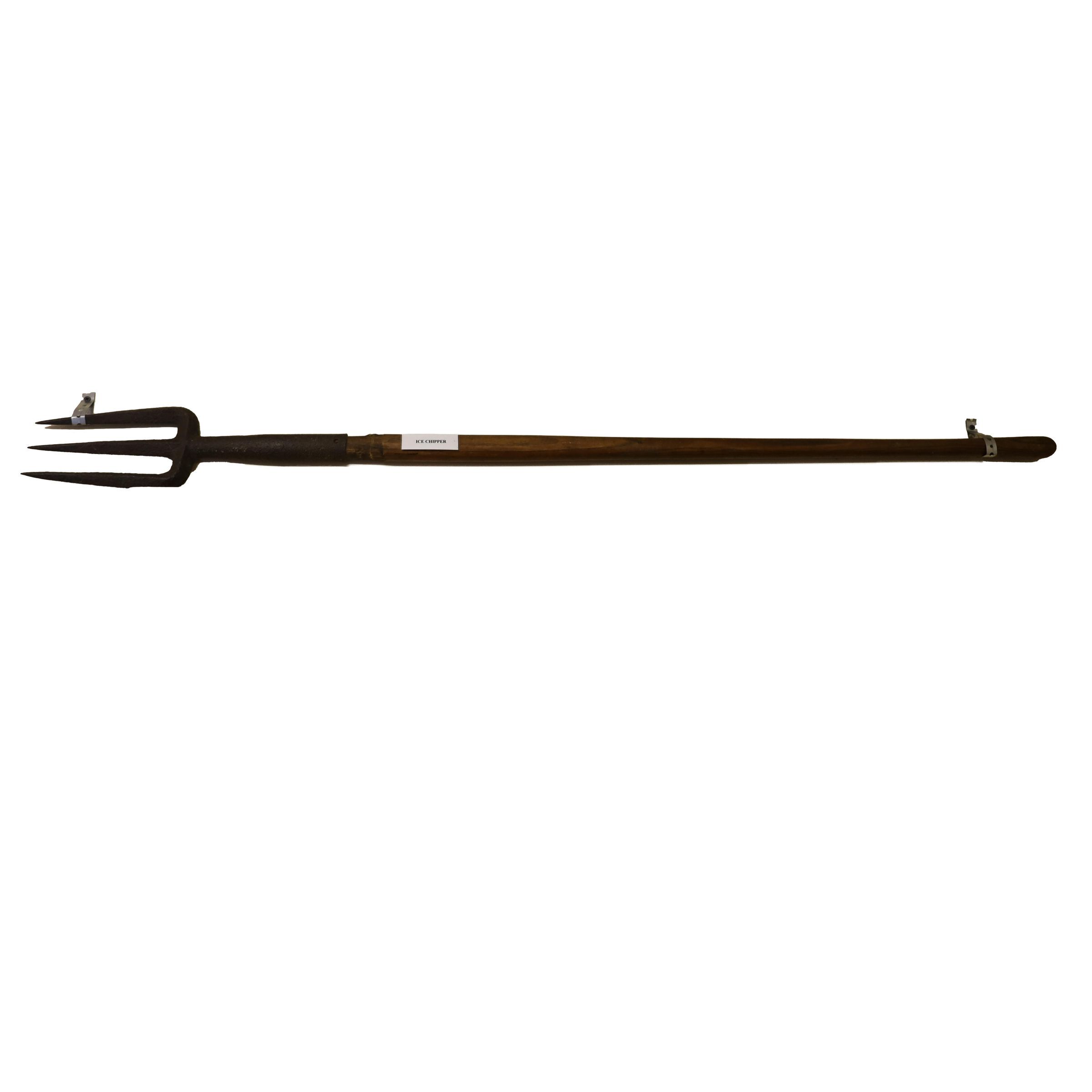 This ice chipper has a wooden handle attached to a metal triton-shaped tip with three points. This chipper was used to break apart ice or cut off unwanted pieces to make cubes more uniform.