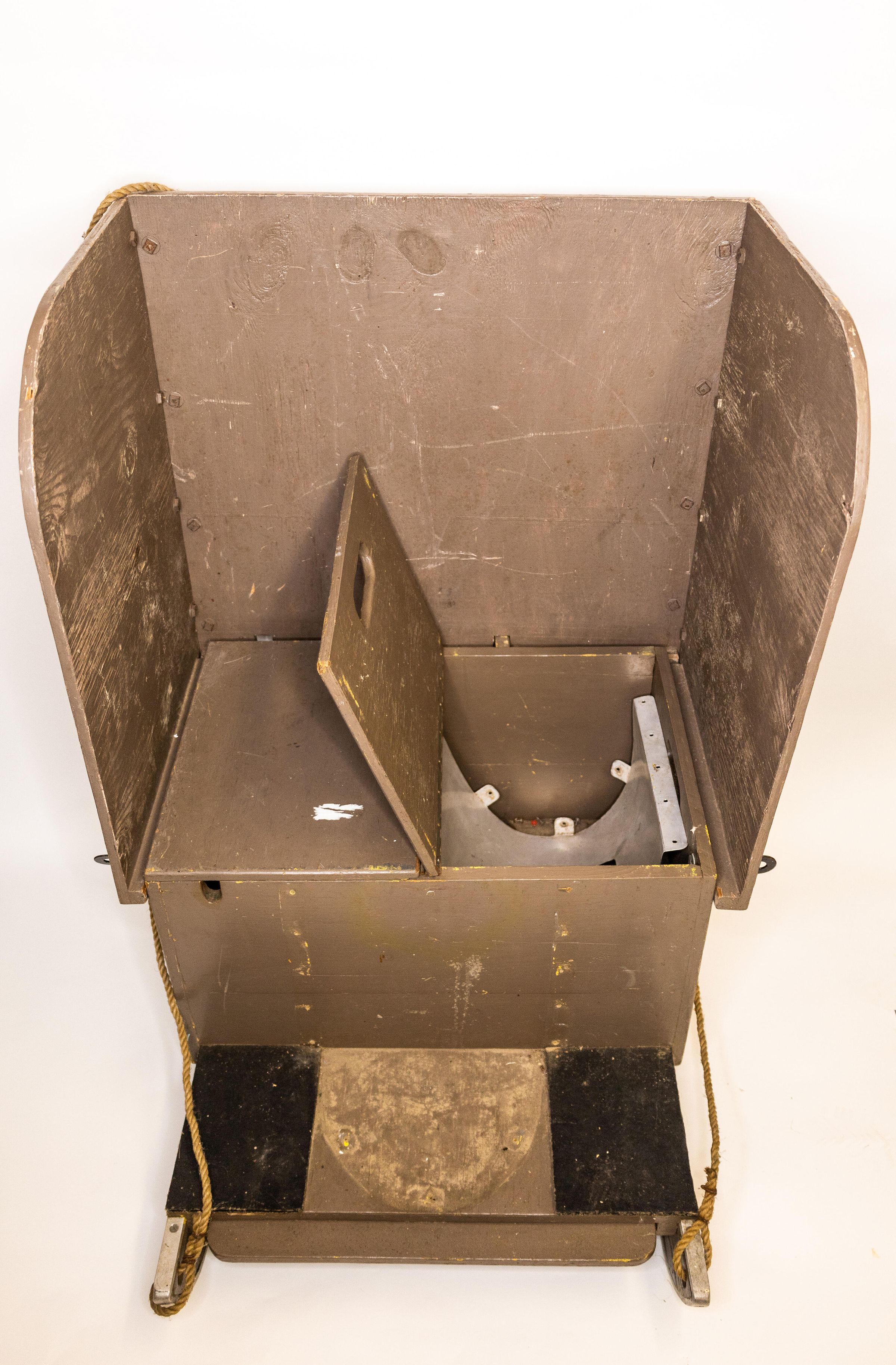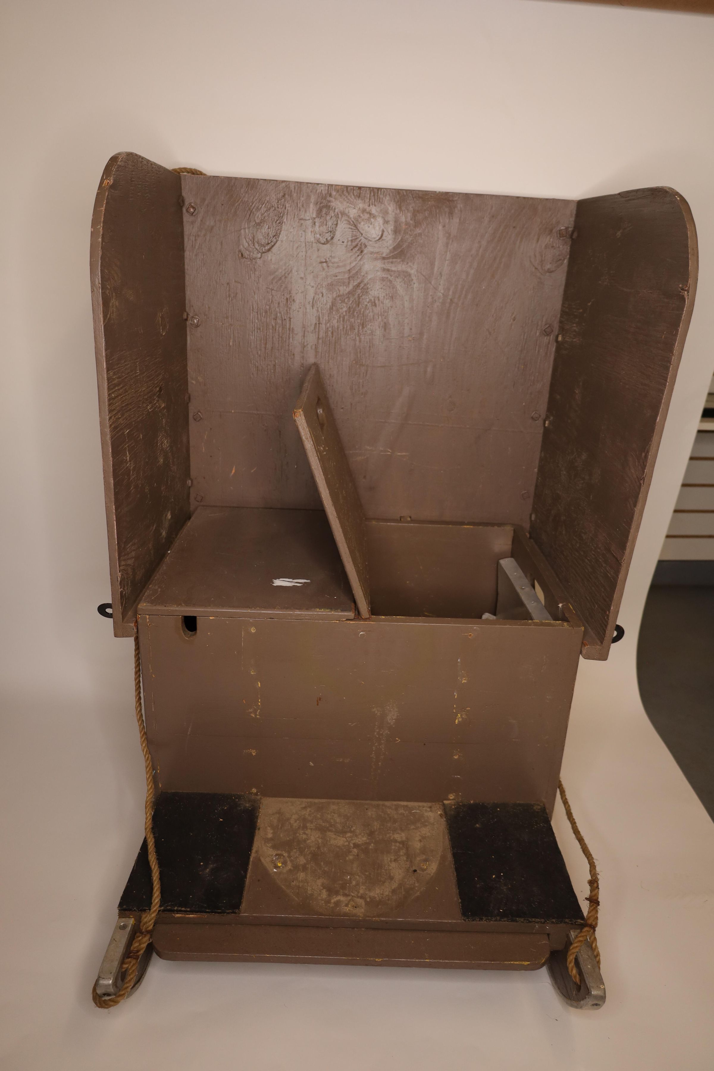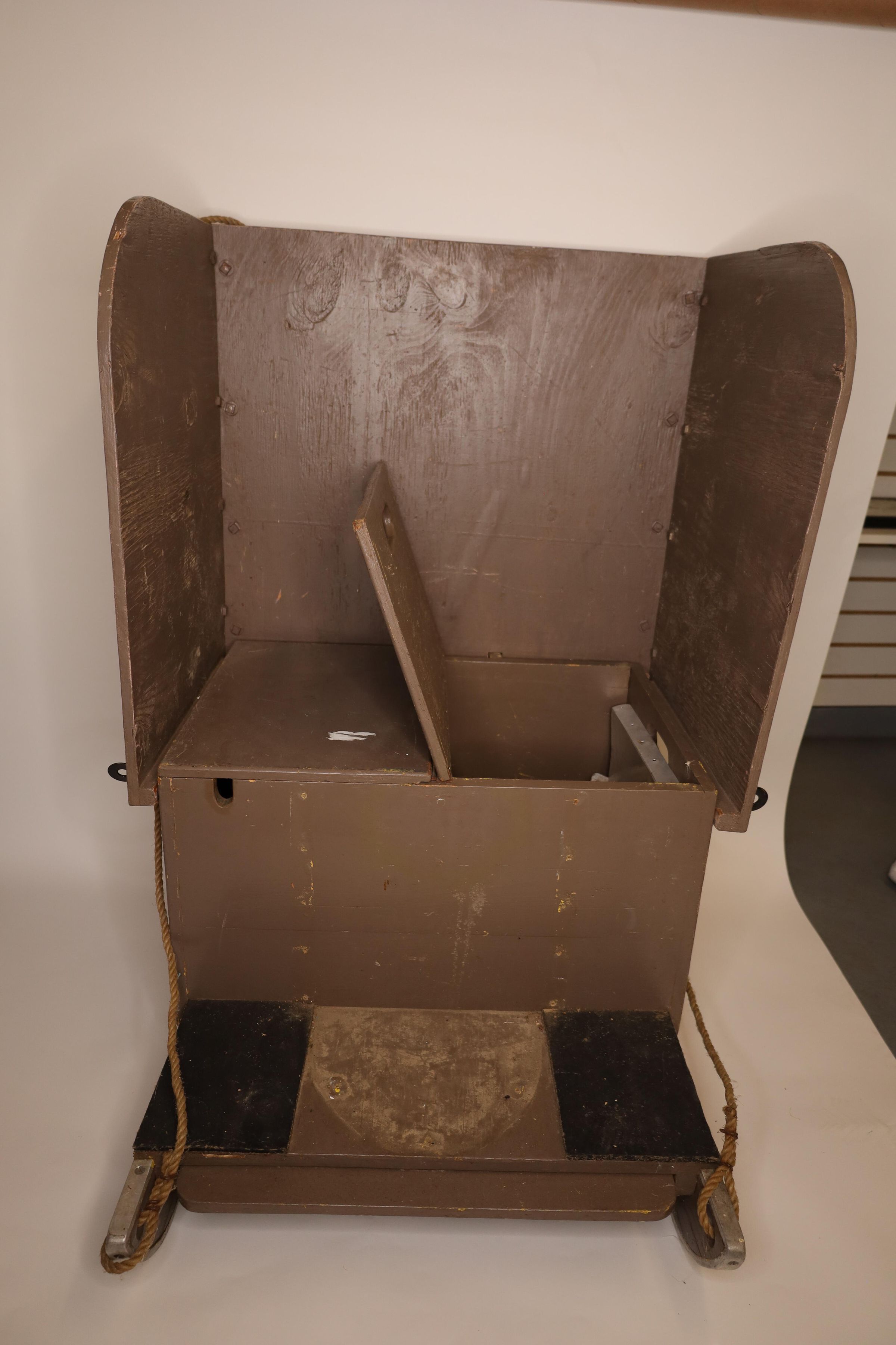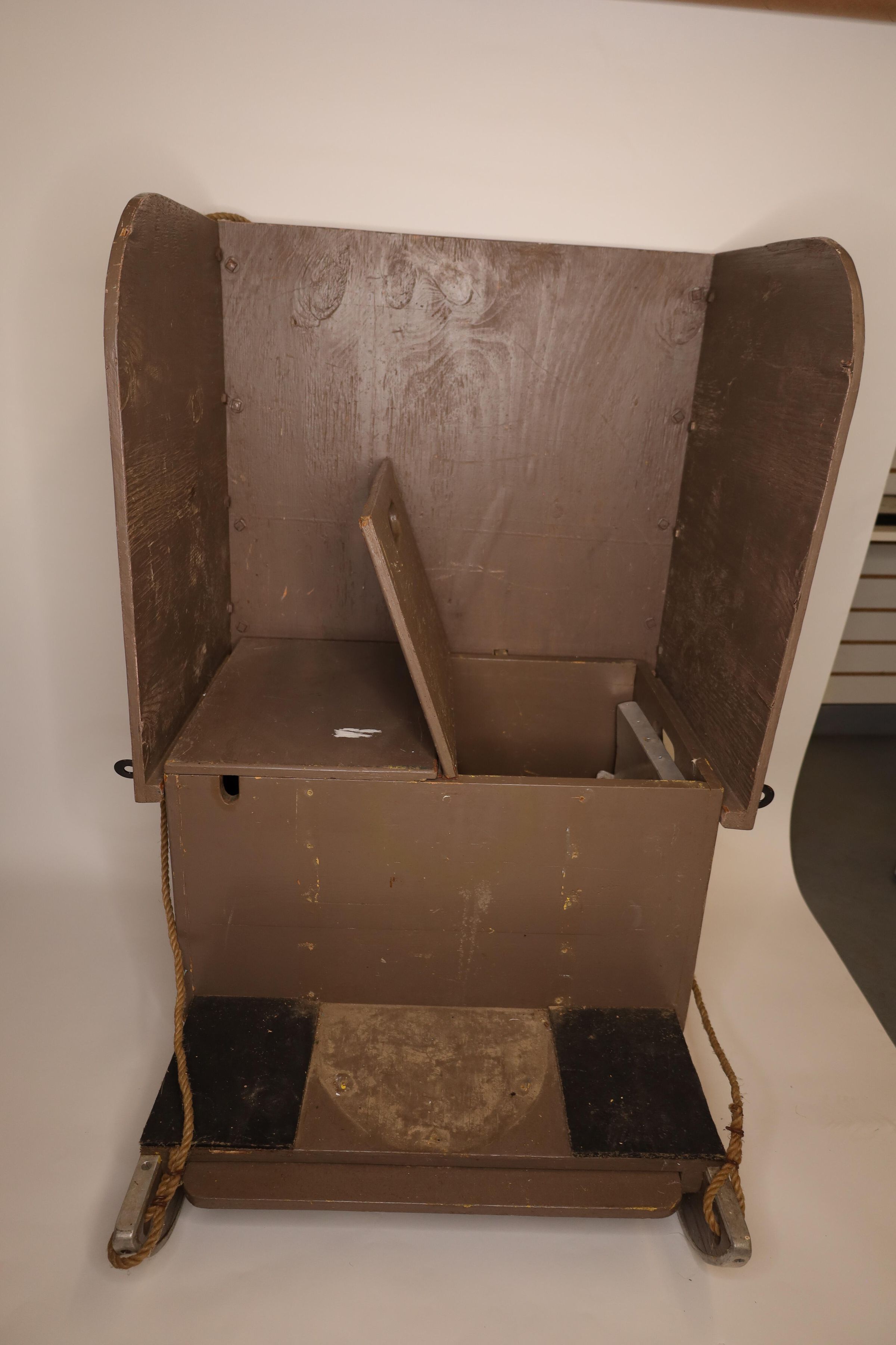 This well-used, hand-made ice fishing seat has a sled bottom with an attached rope for easy transport. A storage area has been placed under the seat and a high three-sided enclosure has been built to provide a refuge from the wind and the cold.Location