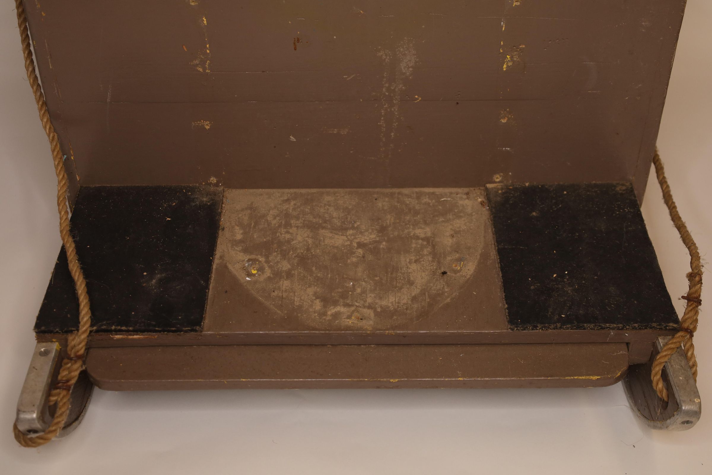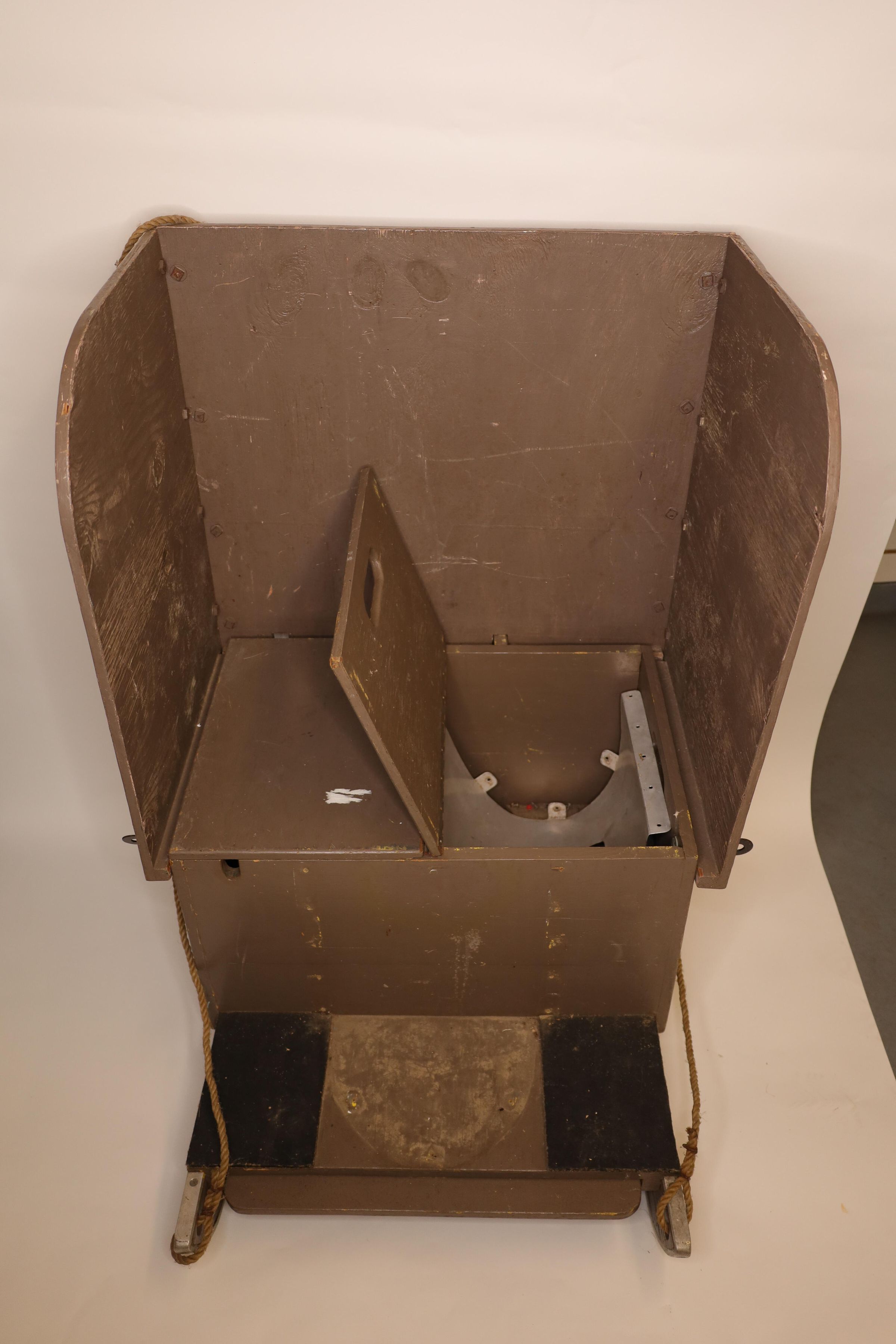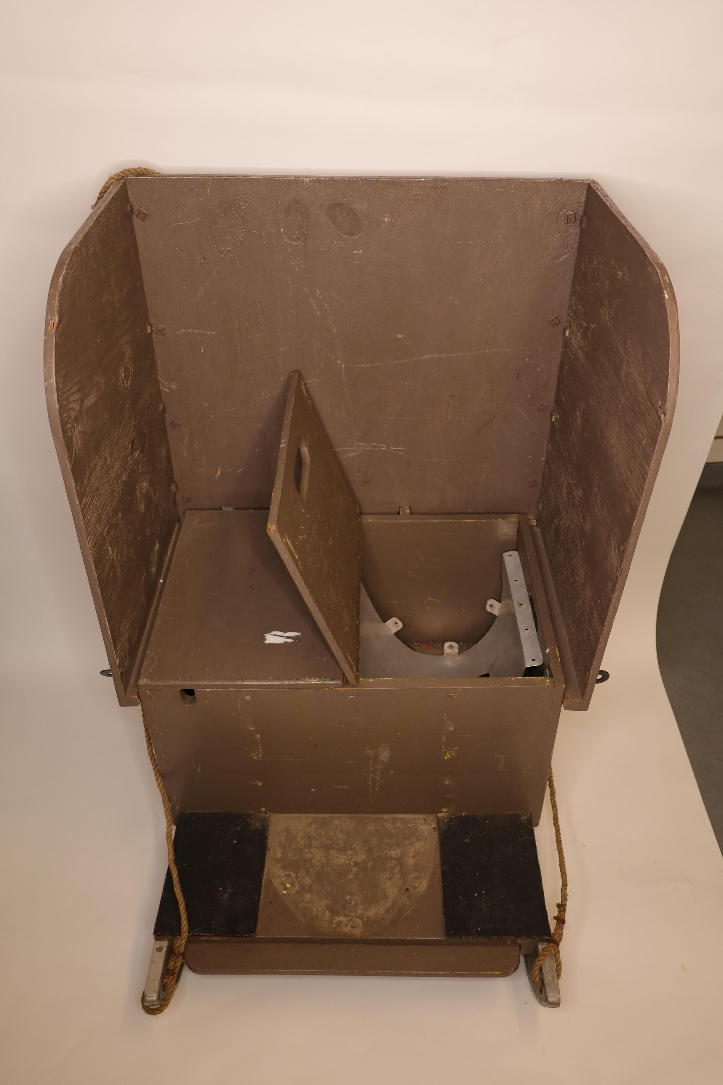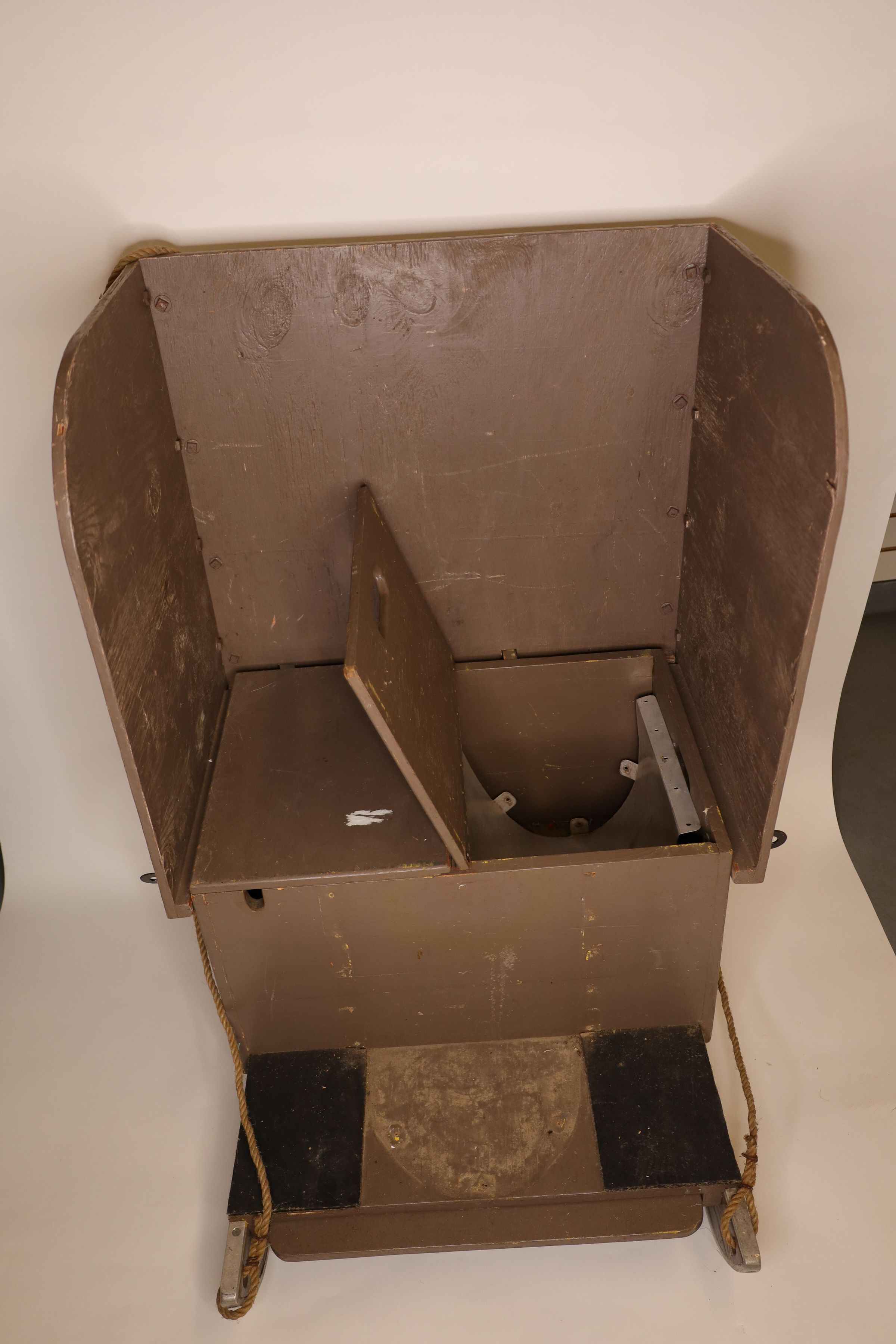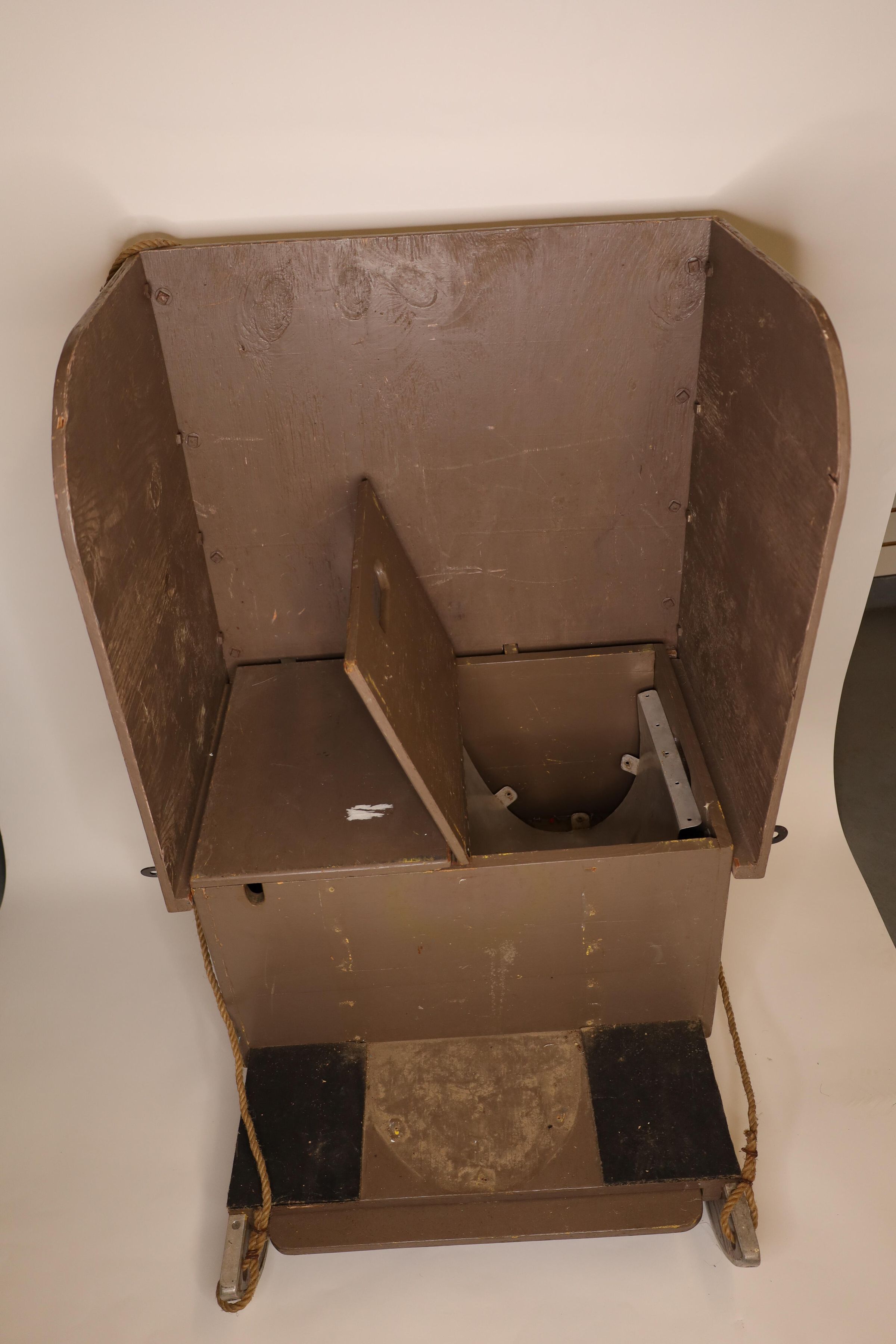 This well-used, hand-made ice fishing seat has a sled bottom with an attached rope for easy transport. A storage area has been placed under the seat and a high three-sided enclosure has been built to provide a refuge from the wind and the cold.Location