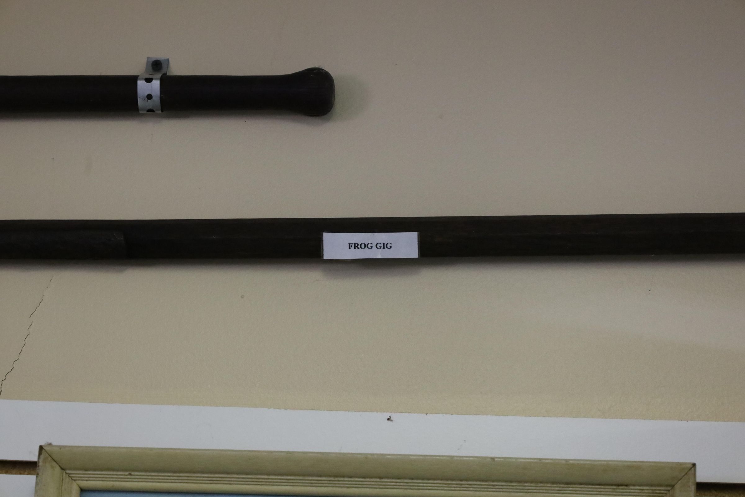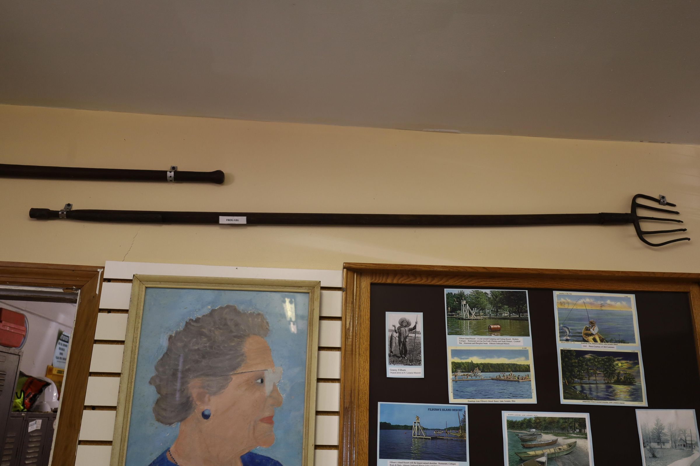 This fork bar has five metal prongs. The tip is connected to a long pole. After the ice was harvested, it was cut into blocks with hand tools which included long-bladed saws with long-handled spades and fork bars.