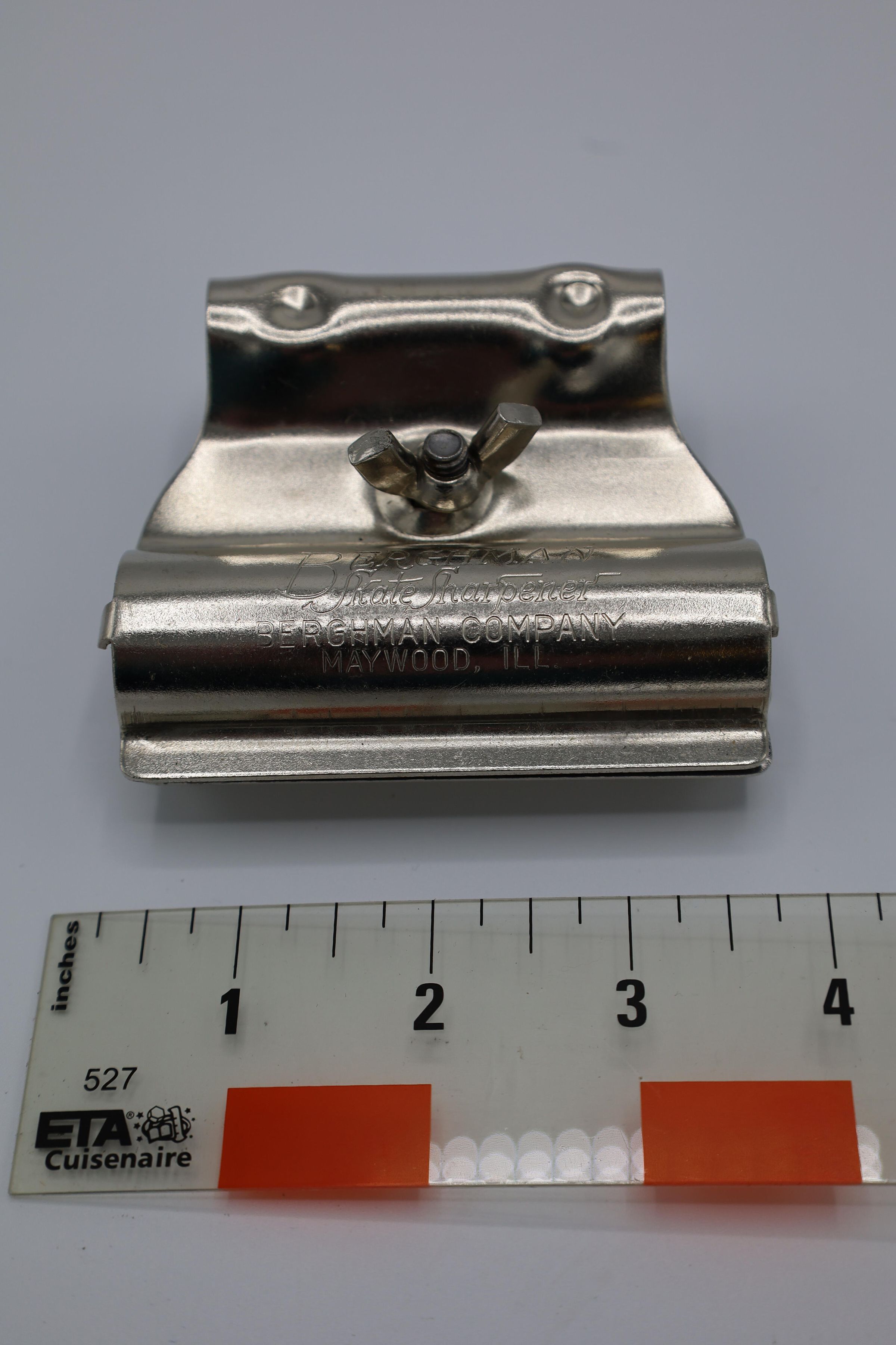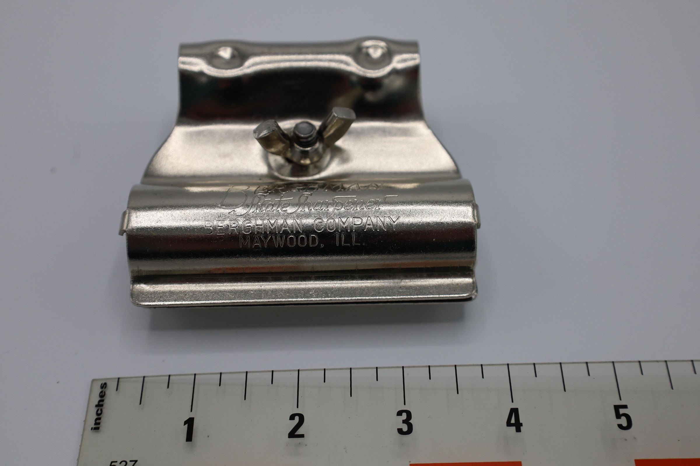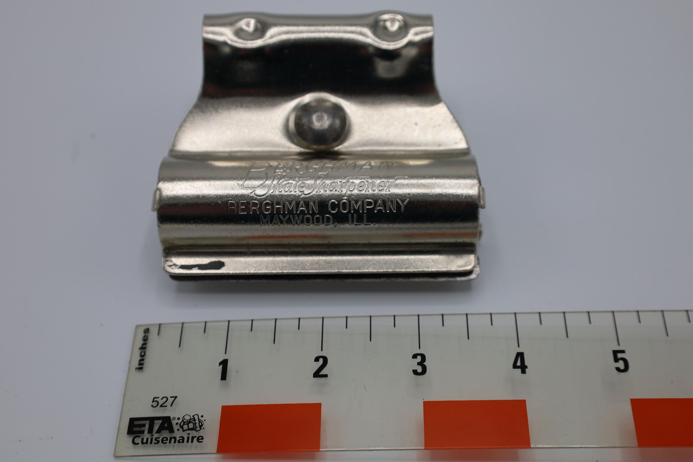 This adjustable ice skate sharpener was made by Berghman Co., based in Maywood, Illinois. It is made of metal and has a clip shape. On one side of the sharpener is a metal wingnut fastener spun over a screw emanating from inside the sharpener to adjust the pressure on the blade. There is a spring that one must push on to help rotate an internal sharpening stone on the inside. The stone is rotated and washed periodically to keep the abrasive fresh.