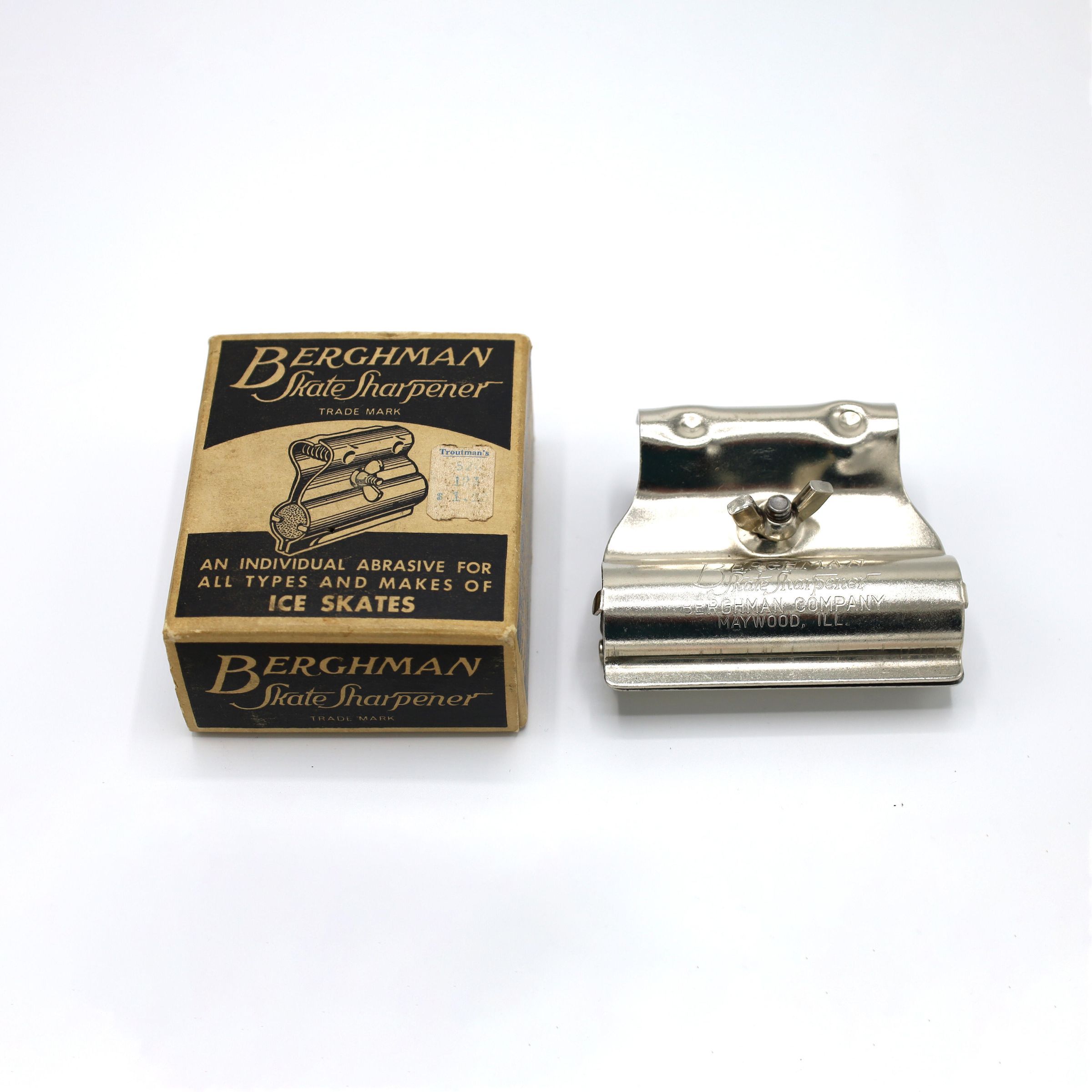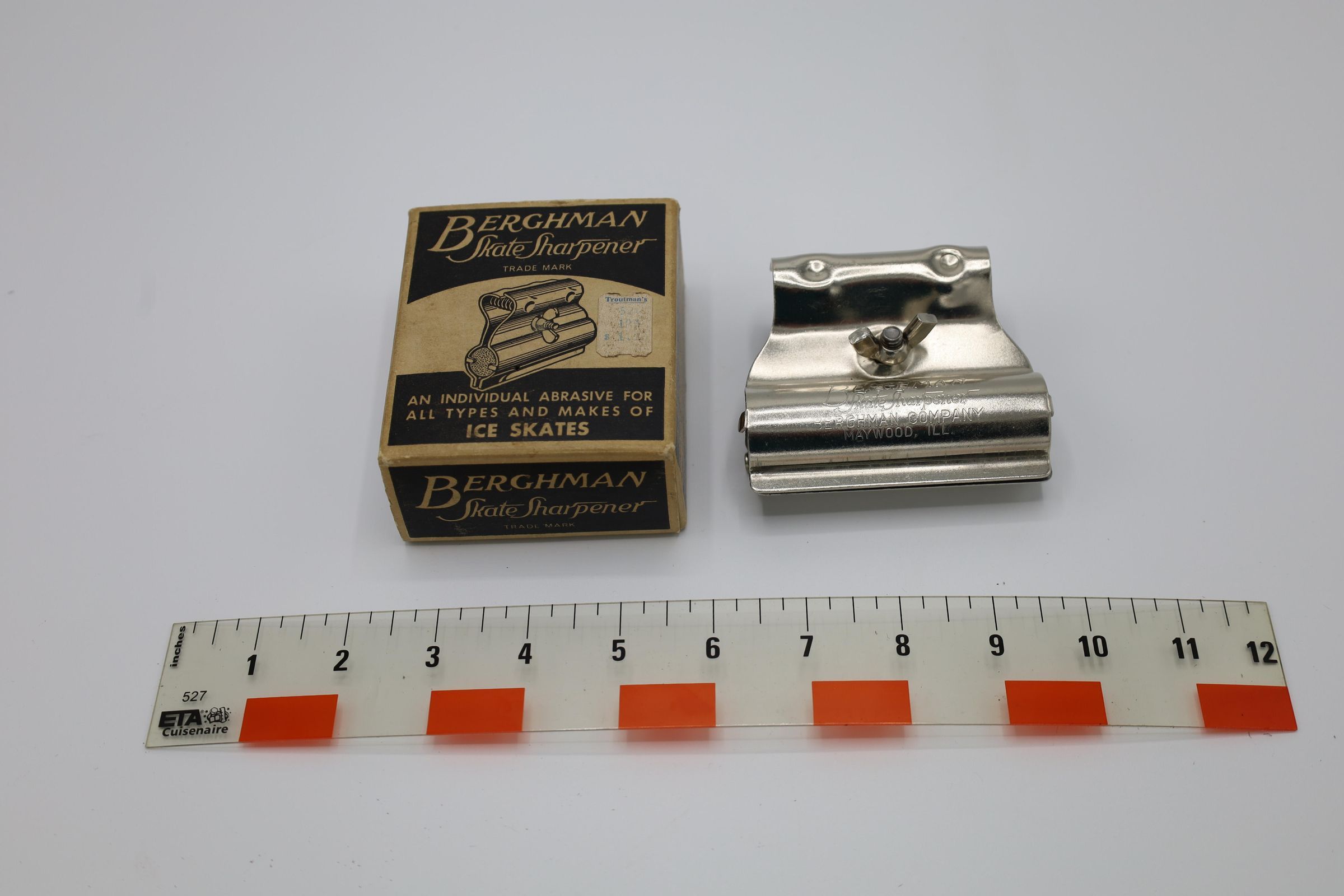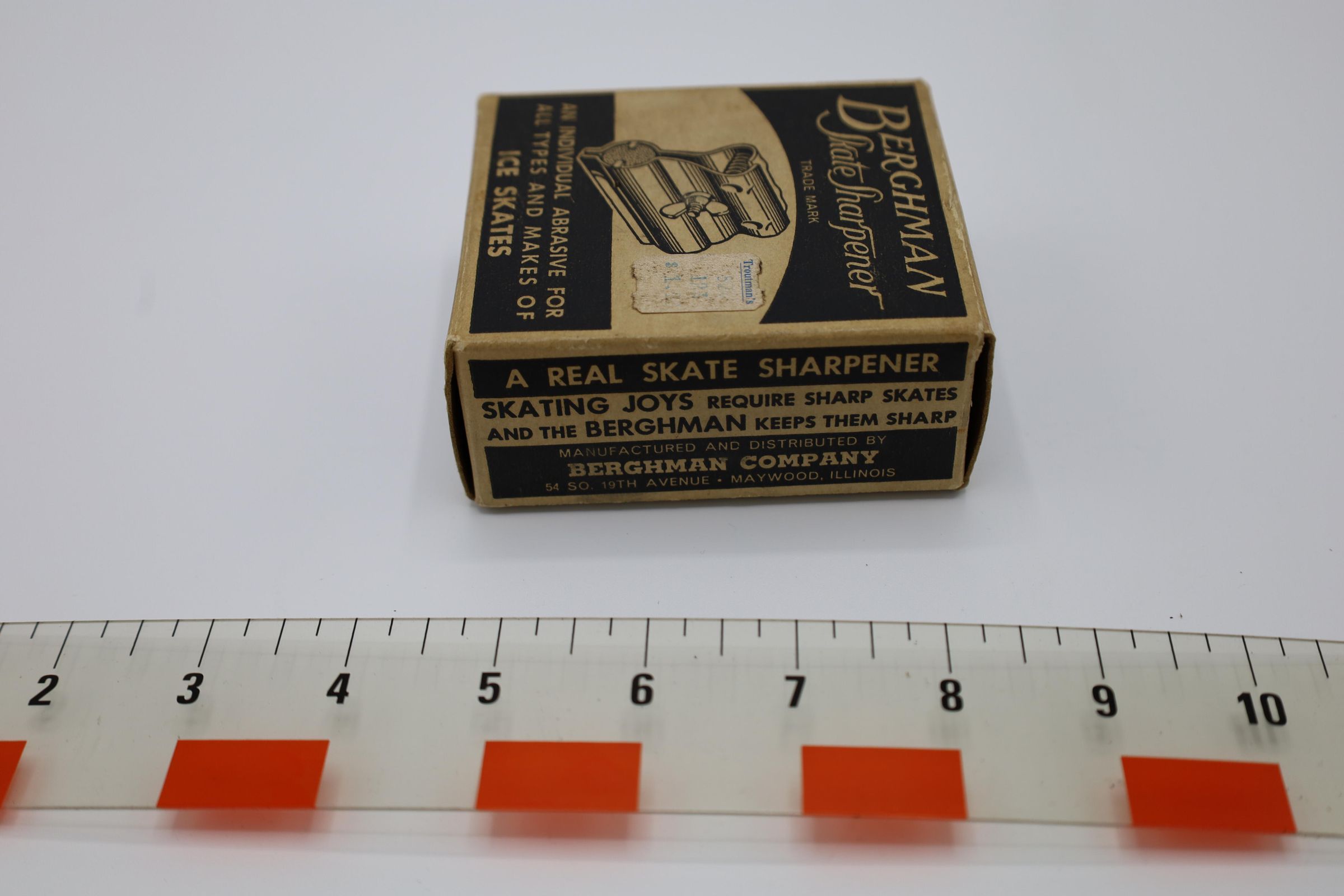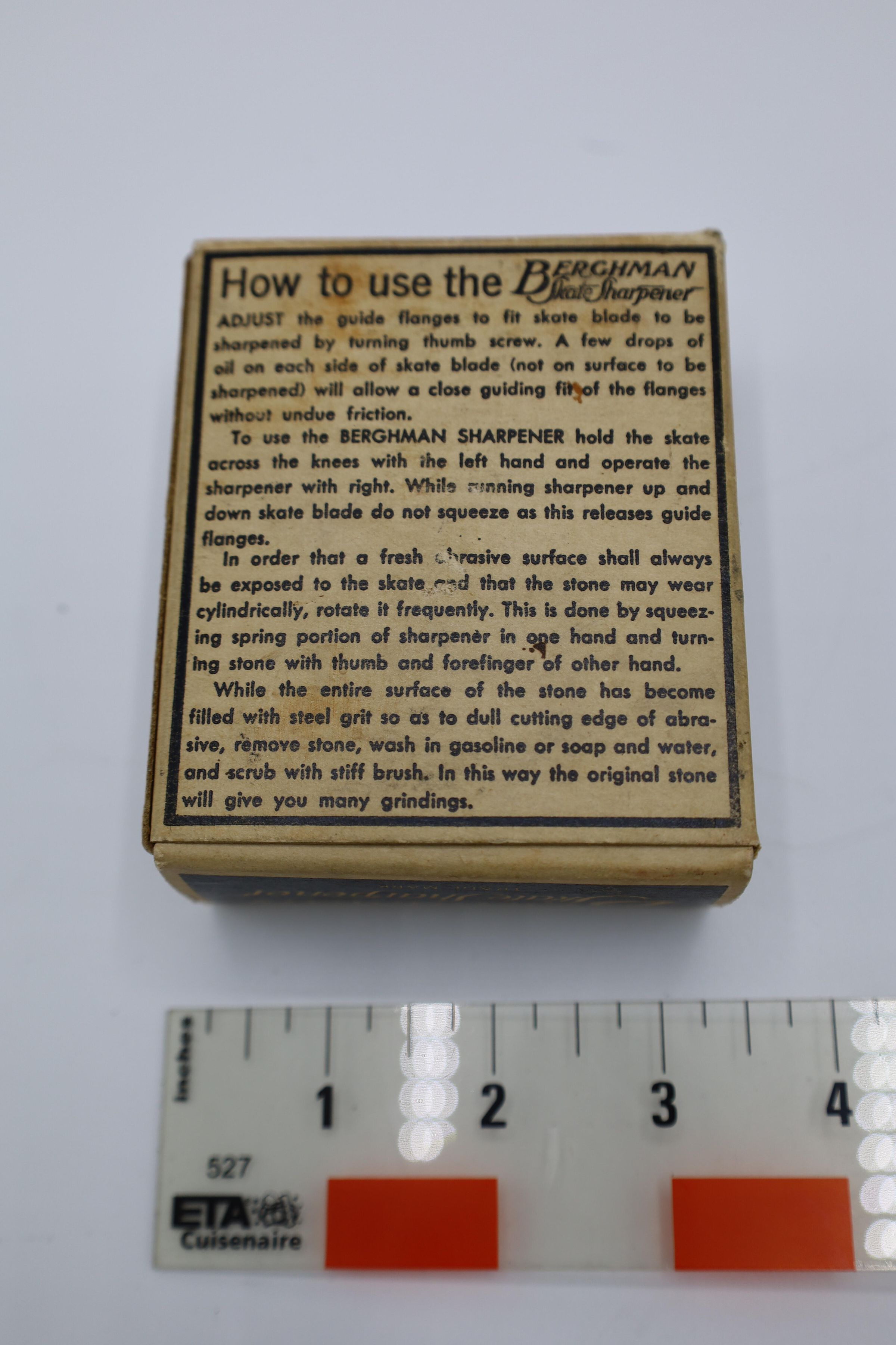 This item has its original box, and on the front face is a picture of the sharpener and the Berghman Company name and trademark. The side of the box reads, "A Real Skate Sharpener-Skating Joys Require Sharp Skates- And The Berghman Keeps Them Sharp ."The back of the box contains complete instructions on how to use the sharpener.Context